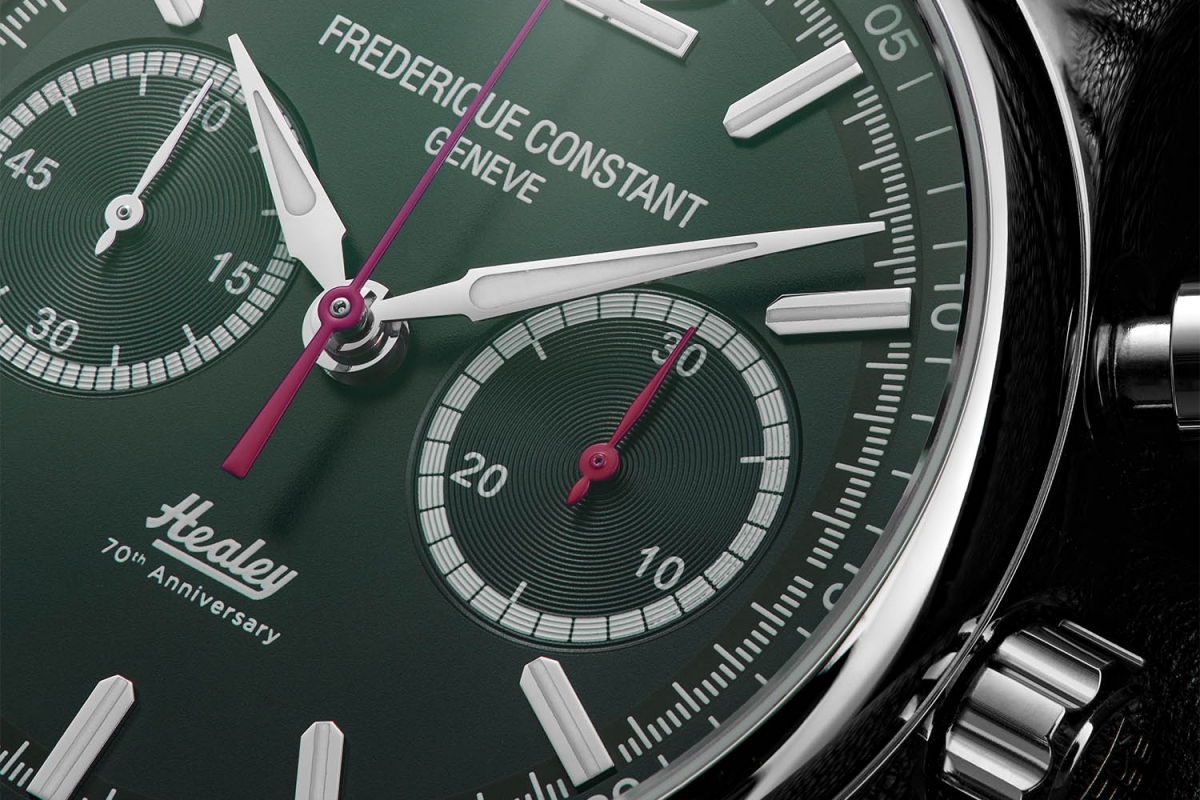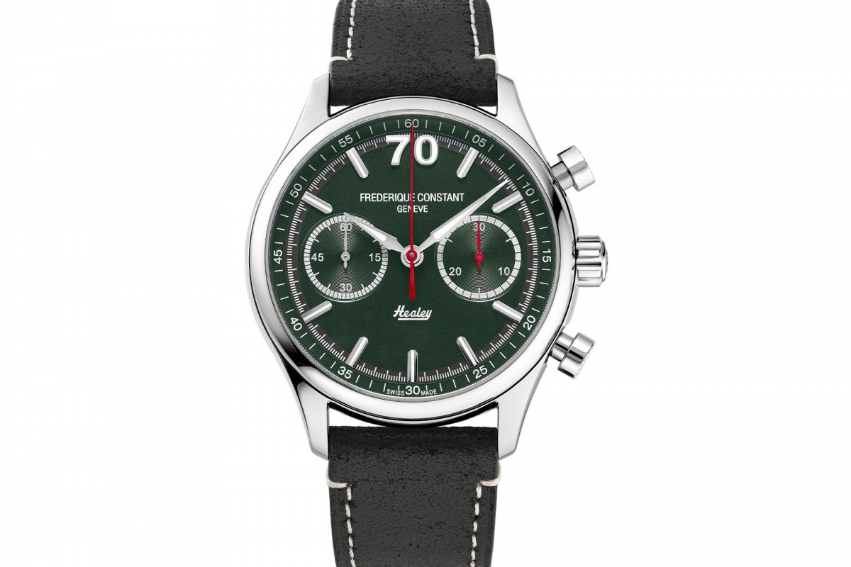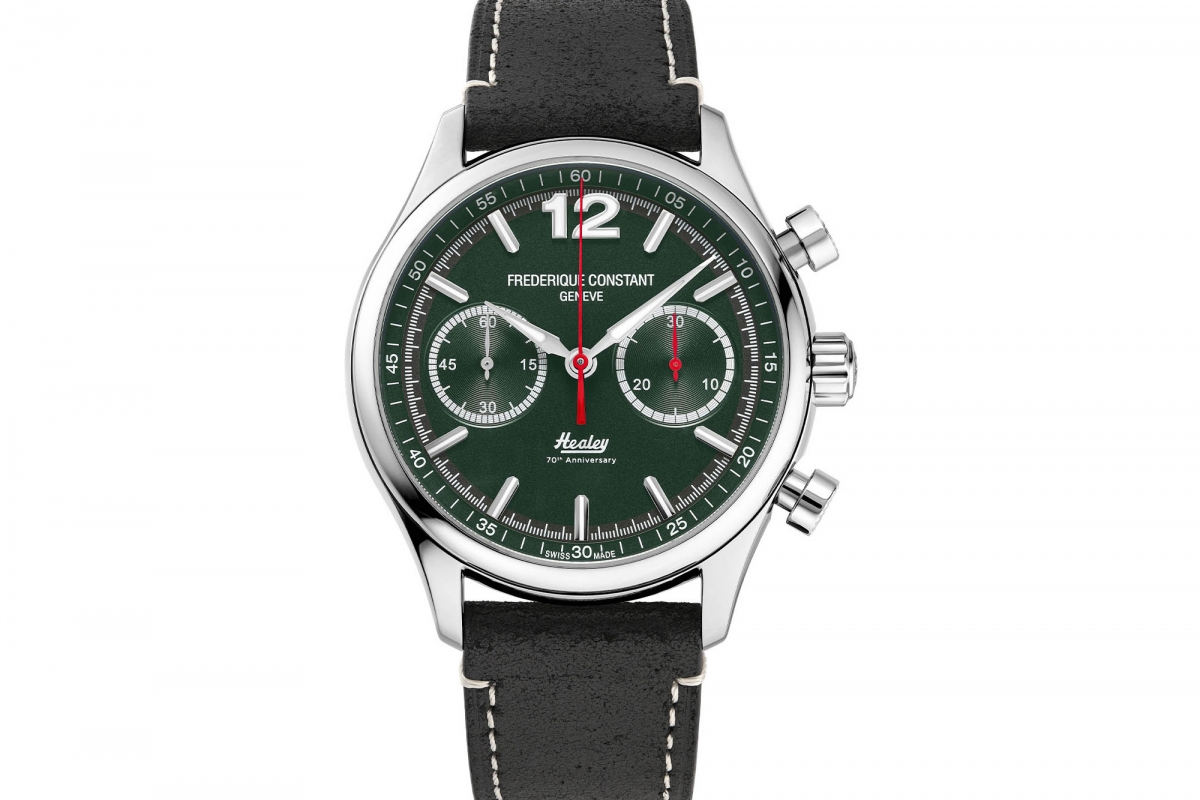 Em 2022, a Frederique Constant celebra o 70º aniversário da Austin-Healey, um parceiro de longa data. Para assinalar esta ocasião, o seu novo cronógrafo mecânico, o Vintage Rally Healey Chronograph Automatic, adoptou a cor “British racing green”, usada no lendário automóvel clássico com a matrícula NOJ393. Com um mostrador bicompax e dois ponteiros vermelhos iguais aos que se encontram nos carros de corrida, este cronógrafo é produzido em duas versões: a primeira, limitada a dez unidades com o número 70 visível ao meio-dia, e a segunda versão de 700 exemplares, com o número “12” no seu lugar habitual.