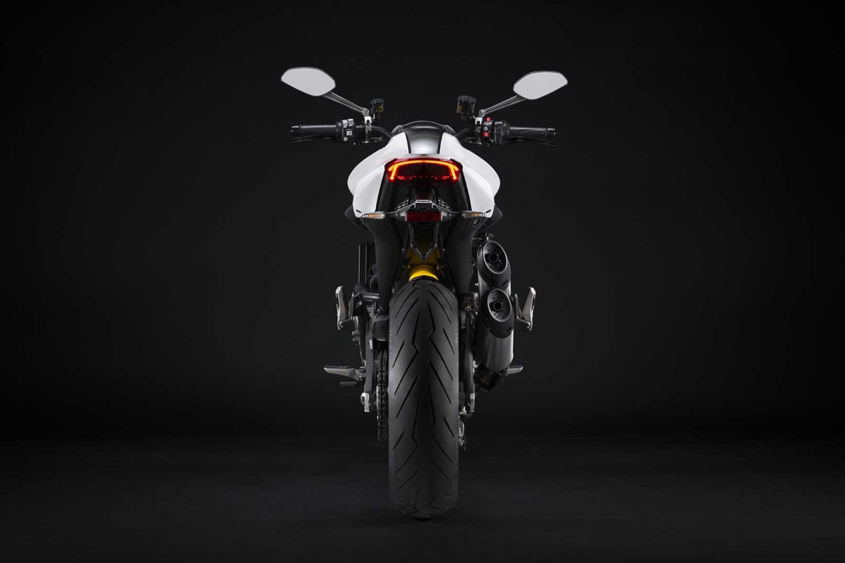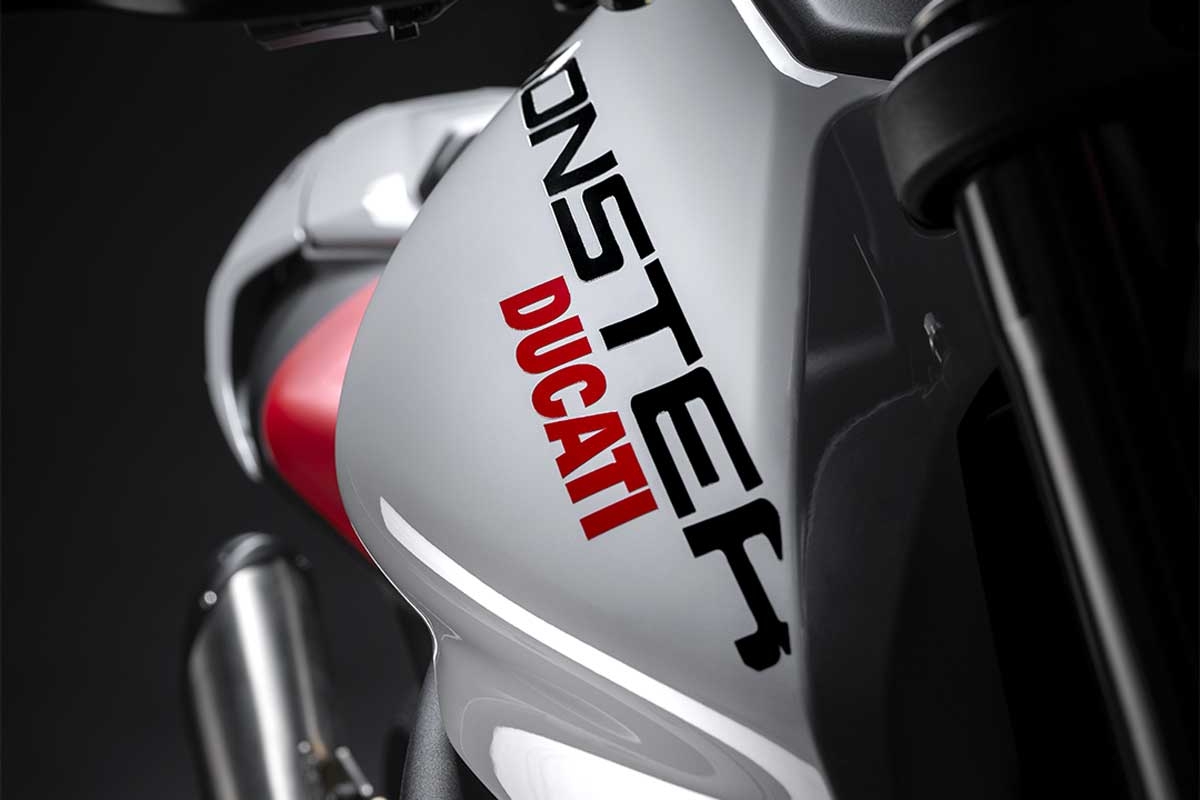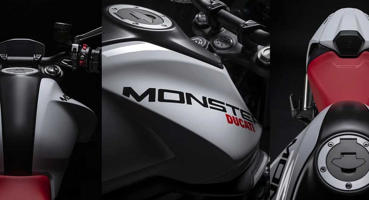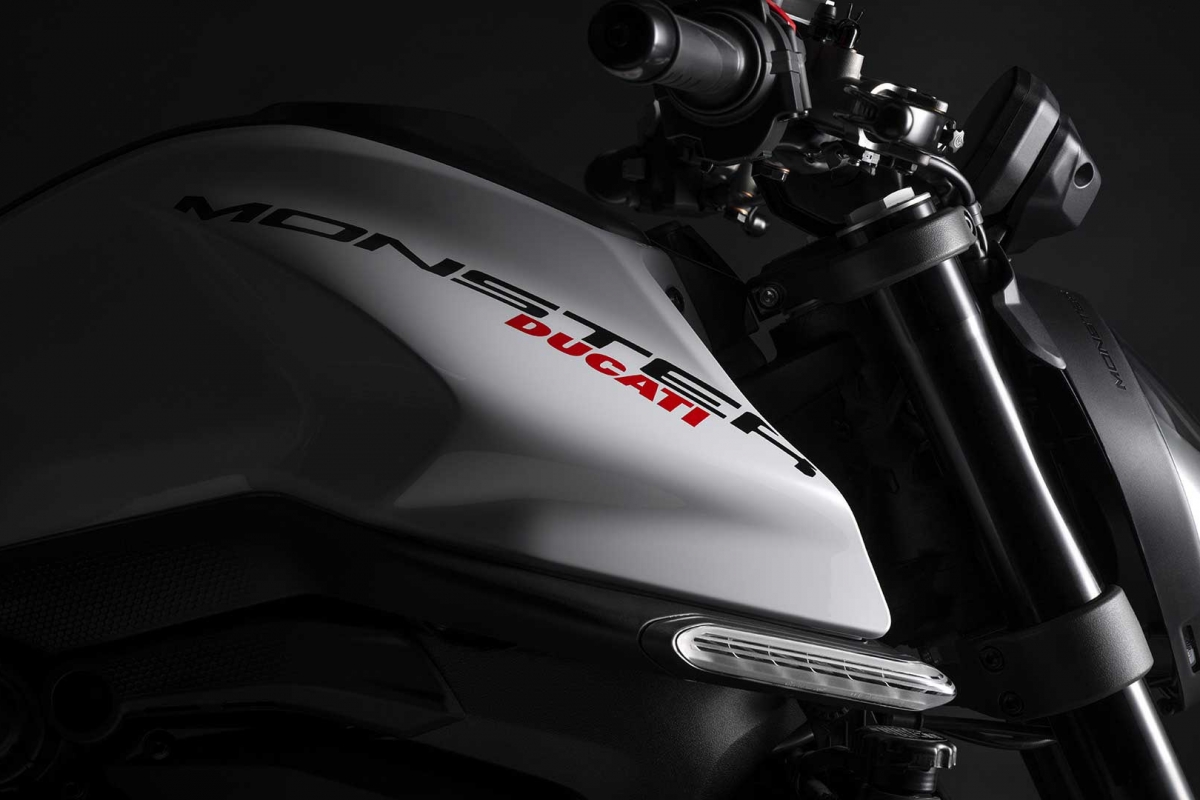 O moderno e sofisticado design foca-se no essencial, evidenciado as características distintivas da Monster. Enquanto a visão frontal da moto é dominada pelo projetor full LED, a traseira, por seu lado, tem uma secção curta e desportiva, com dois painéis laterais pintados inspirados pela Panigale V4. No centro, o inconfundível depósito de combustível Monster, curvo e musculado.
