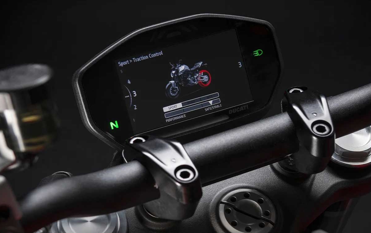 A eletrónica da Monster é de última geração. O equipamento de série inclui ABS Cornering, Controlo de Tração e Wheelie Control, ajustáveis em diferentes níveis de intervenção; toda a informação útil para a condução é claramente visível no ecrã TFT a cores de 4,3’’. A natureza desportiva da Monster é também sublinhada pela presença do Launch Control, que permite arranques ao estilo do MotoGP.