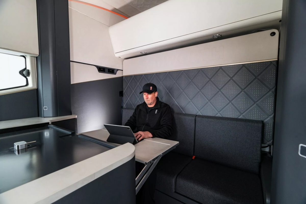 O modelo também possui uma suspensão variável, que pode ajustar a altura de condução para otimizar o espaço livre ou a aerodinâmica. O estilo futurista continua no interior, com um banco do condutor central e um painel de instrumentos digital de 15 polegadas. Este último promete fornecer notificações avançadas ao condutor, um layout configurável e menus de fácil utilização. Atrás do cockpit existe uma área de dormir com uma cama que se dobra sobre um sofá. A estes juntam-se uma mesa móvel e saídas de ar traseiras.