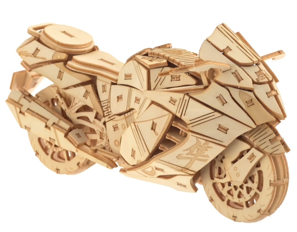 Assim, cada peça é esculpida para se alinhar perfeitamente com a outra. No Oriente, estes puzzles Kigumi são muito comuns e existem autênticas obras de arte feitas através deste método (o seu equivalente na Europa seriam os nossos conhecidos puzzles). Este Kigumi é composto por três placas, cada uma das quais contém os componentes da mota.
