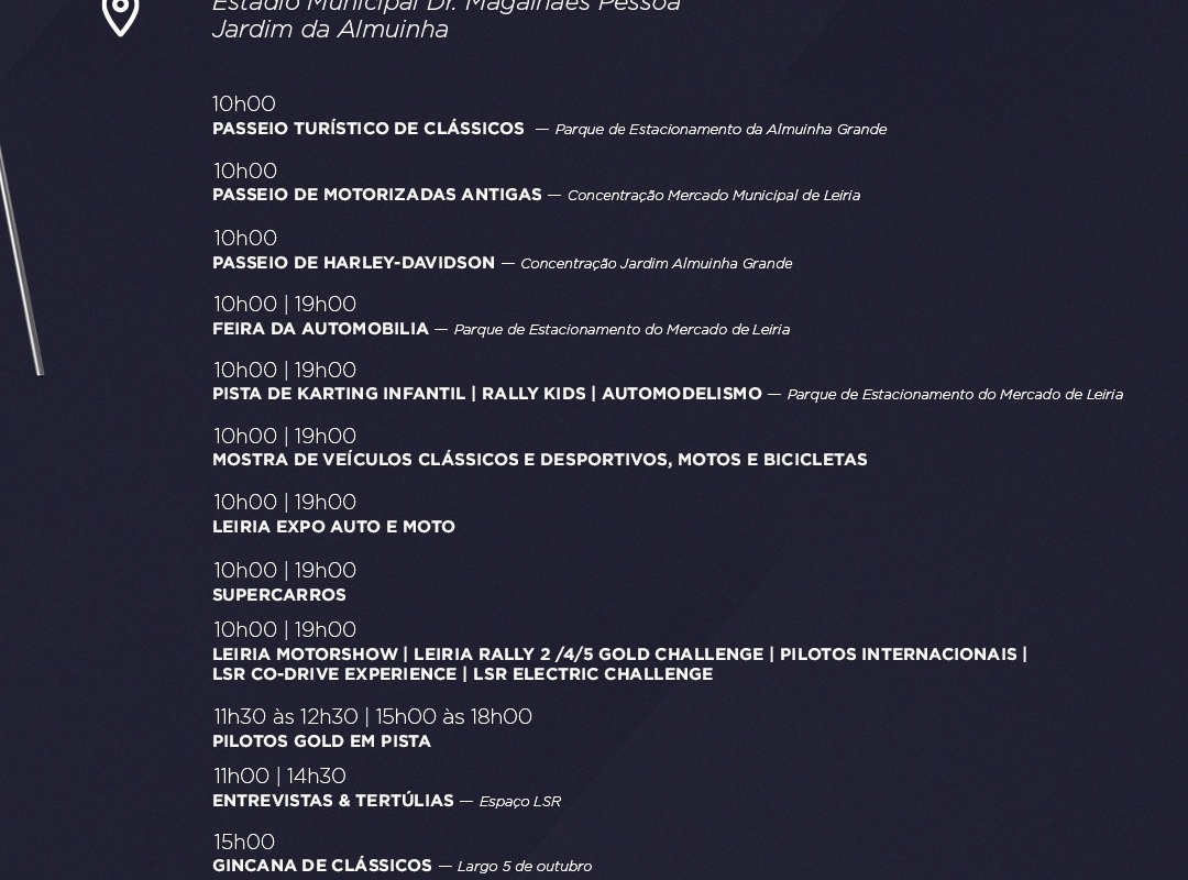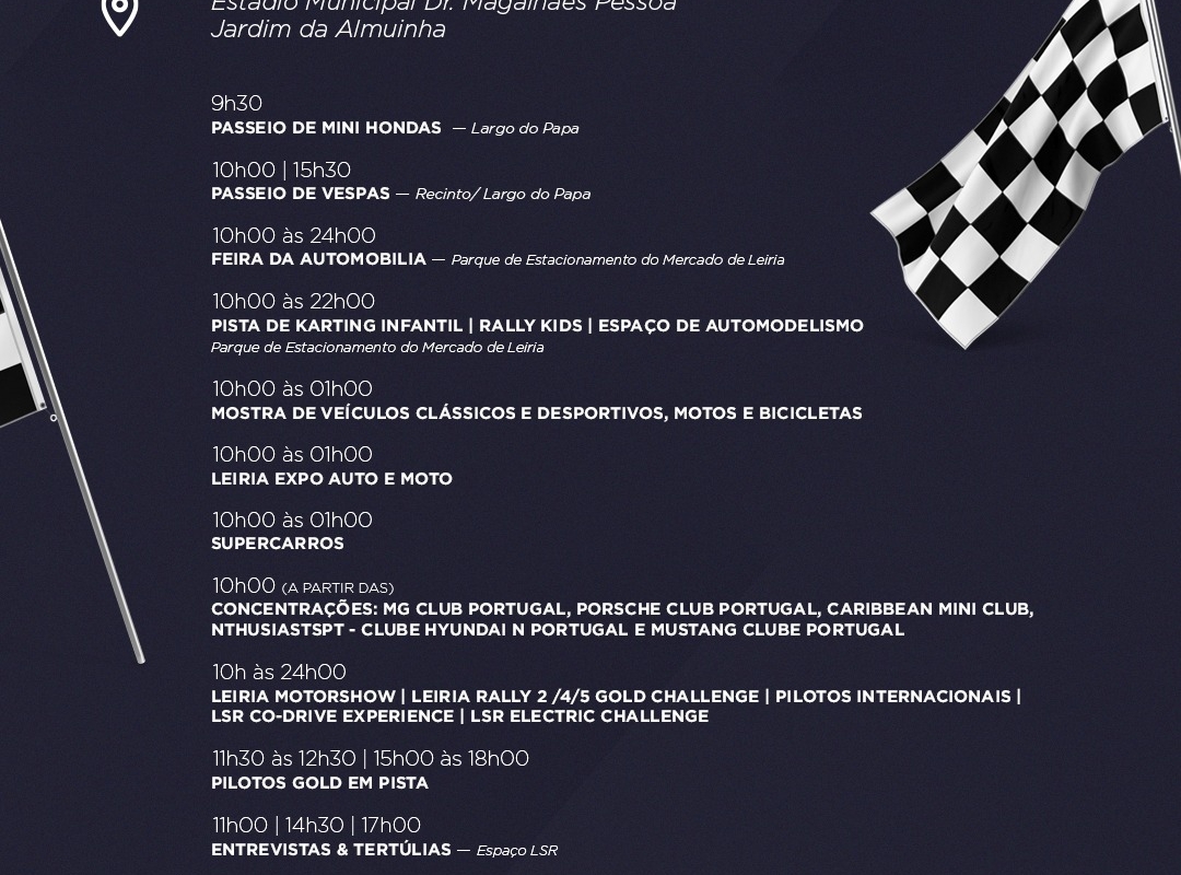Na Sexta-feira, dia 29, há pista de karting infantil, mostra de veículos clássicos e desportivos, motos e bicicletas, feira de automobilia e o Leiriamotorshow. As atividades começam às 15 horas. Além da mostra de carros, da pista de karting e da feira de automobilia, chegam a Leiria, no Sábado, dia 30, várias concentrações e passeios de carros. Há ainda passeio de bicicletas antigas, passeio de mini hondas e de vespas.