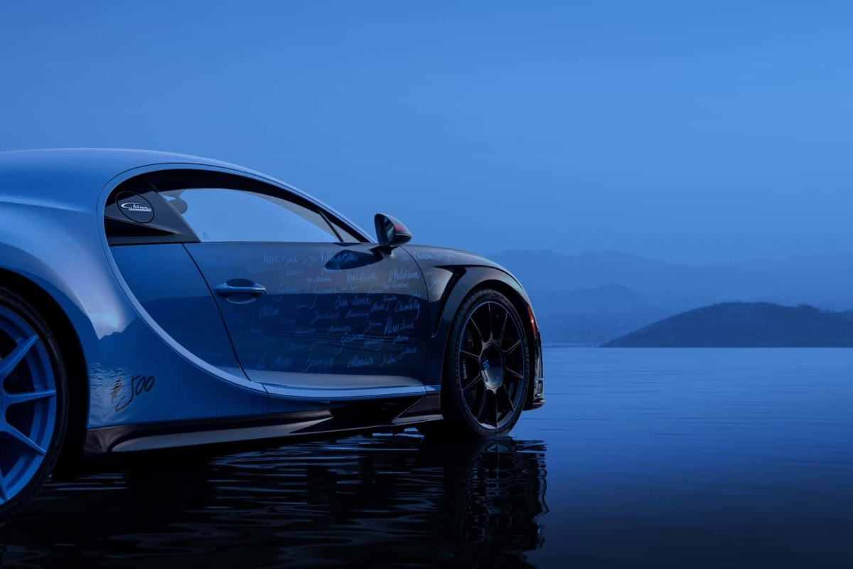Baseado no Super Sport, o epílogo do Chiron segue a versão original. De facto, algumas imagens da galeria publicada pela Bugatti mostram a fonte de inspiração para o 500º carro. A pintura especial passa do French Racing Blue para o Atlantic Blue. Este visual de dois tons é ainda embelezado com nomes escritos à mão de eventos e locais que desempenharam um papel importante nos oito anos que passaram desde o lançamento do veículo.