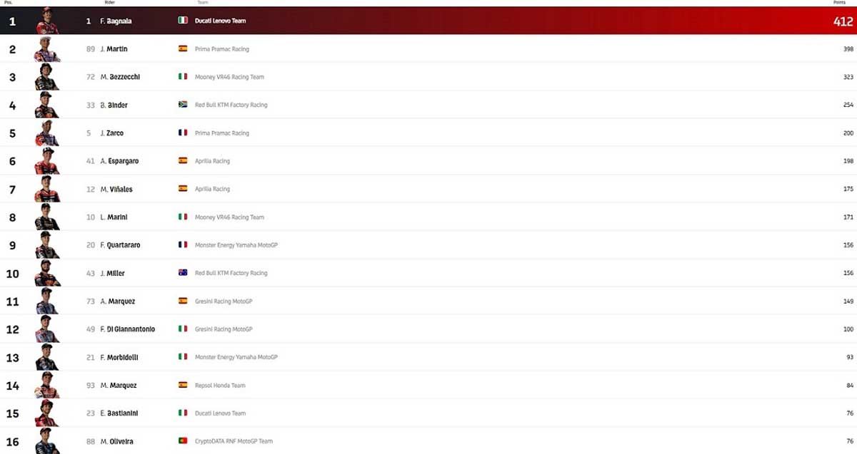 Quanto à liderança do campeonato, continua nas mãos de F. Bagnaia (Ducati lenovo Team), que conseguiu ganhar em Sepang dois preciosos pontos adicionais face a J. Martin (Prima Pramac Racing), tendo agora 412 pontos, ou seja, mais 14 que o seu rival mais direto.