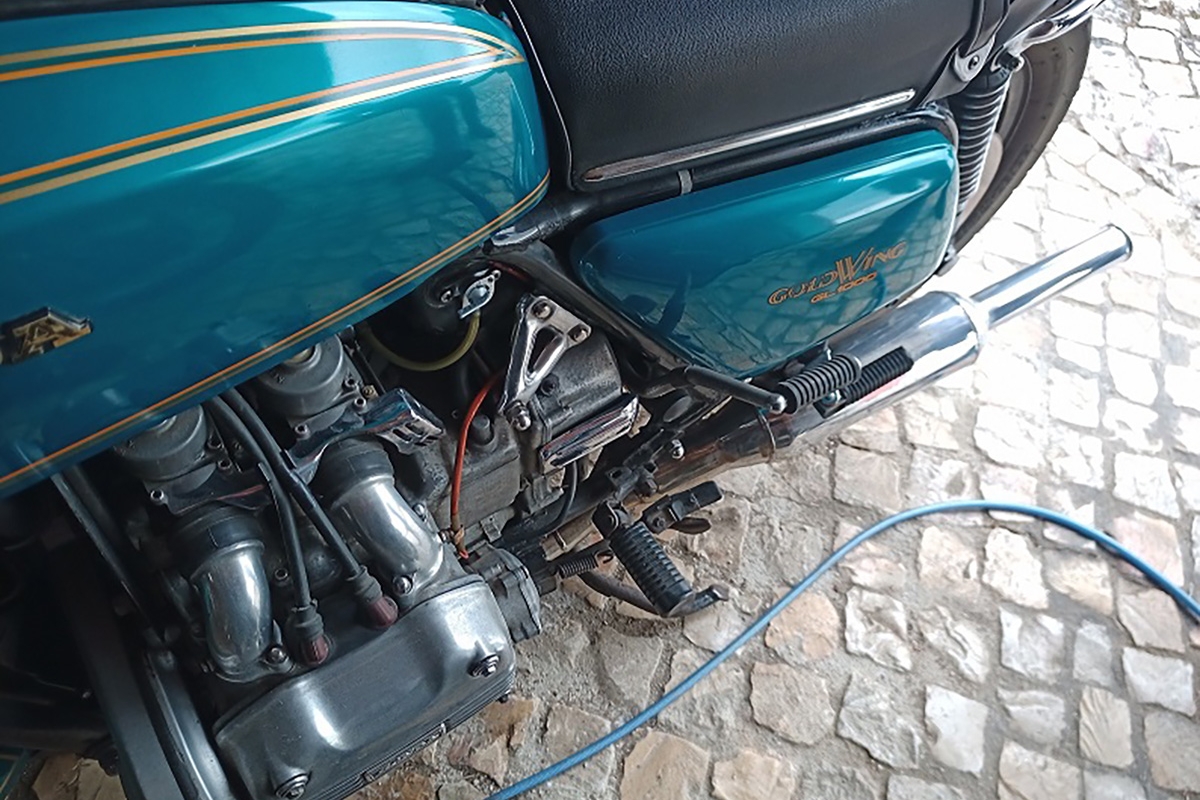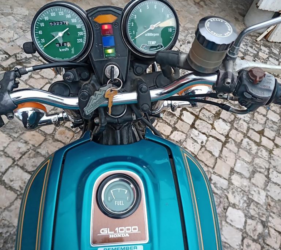 Na conversa com o dono fiquei a saber algo que já tinha ouvido dizer, mas nunca vira na prática: a Honda GL, além do arranque elétrico, vinha equipado com um sistema de kick, para uma eventual falha no arranque elétrico ou respetivos periféricos. Grandes engenheiros japoneses! Mesmo confiando no que faziam, ainda assim acrescentavam um sistema de redundância para garantir que os donos das suas motos não tinham razões de queixa dos seus produtos