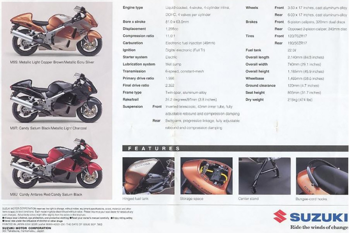 Em surdina, a Suzuki preparava algo especial para fazer face ao que a Kawasaki tinha apresentado primeiro em 1990, e a resposta da Honda em 1996. Tinha que ser algo muito peculiar e superlativo em performance! O projeto foi mantido em segredo durante muito tempo e apanhou meio mundo de surpresa porque o “Falcão Peregrino” veio mesmo para mudar o paradigma das hiperdesportivas, mas com algumas cedências ao conforto.