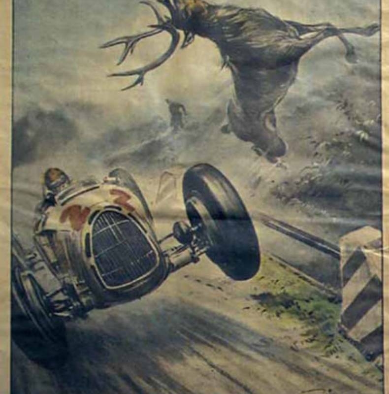 Nem sempre a sorte protege os audazes, e entre outros tantos factos ocorridos, recordo um outro duelo entre Nivola e um animal, quando em 1938, atropelou um veado aos comandos do seu Auto-Union Tipo-D “ flecha de prata “ no decorrer dos treinos para GP de Donington.