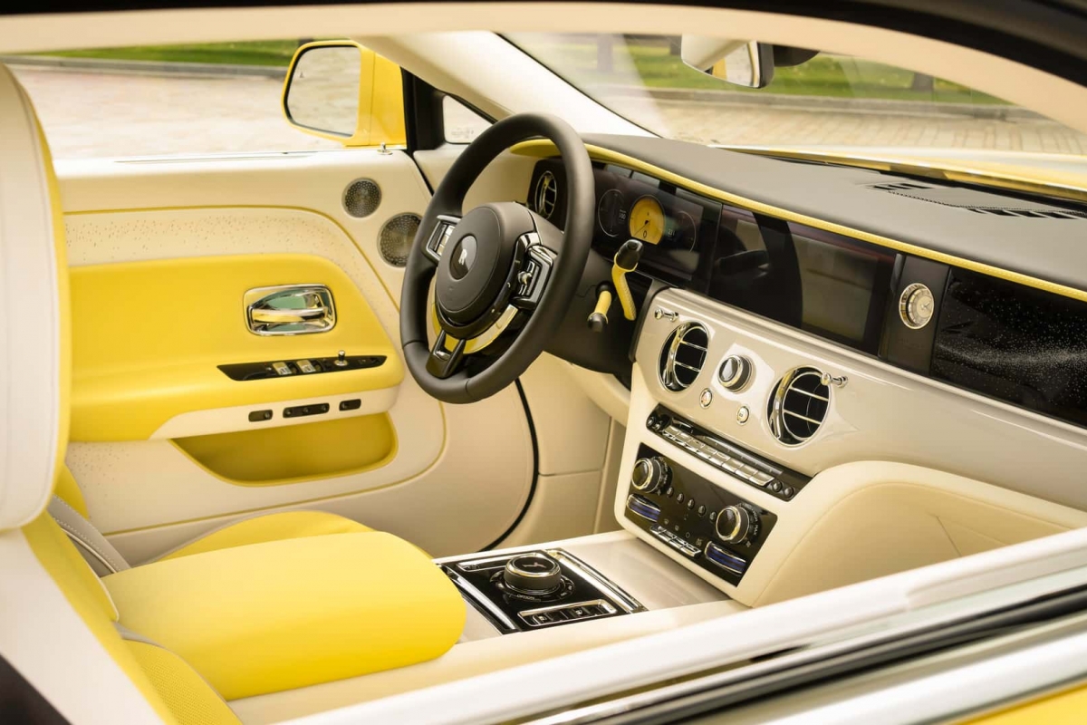 Em consonância com o esquema de cores amarelas, o interior do Spectre Semaphore ostenta uma combinação de Amarelo Limão e Amarelo Citrino integrada nos bancos brancos, nas portas e no painel de instrumentos. As costuras em amarelo limão completam o visual. A Rolls até conseguiu tornar amarelo o mostrador central do painel de instrumentos.