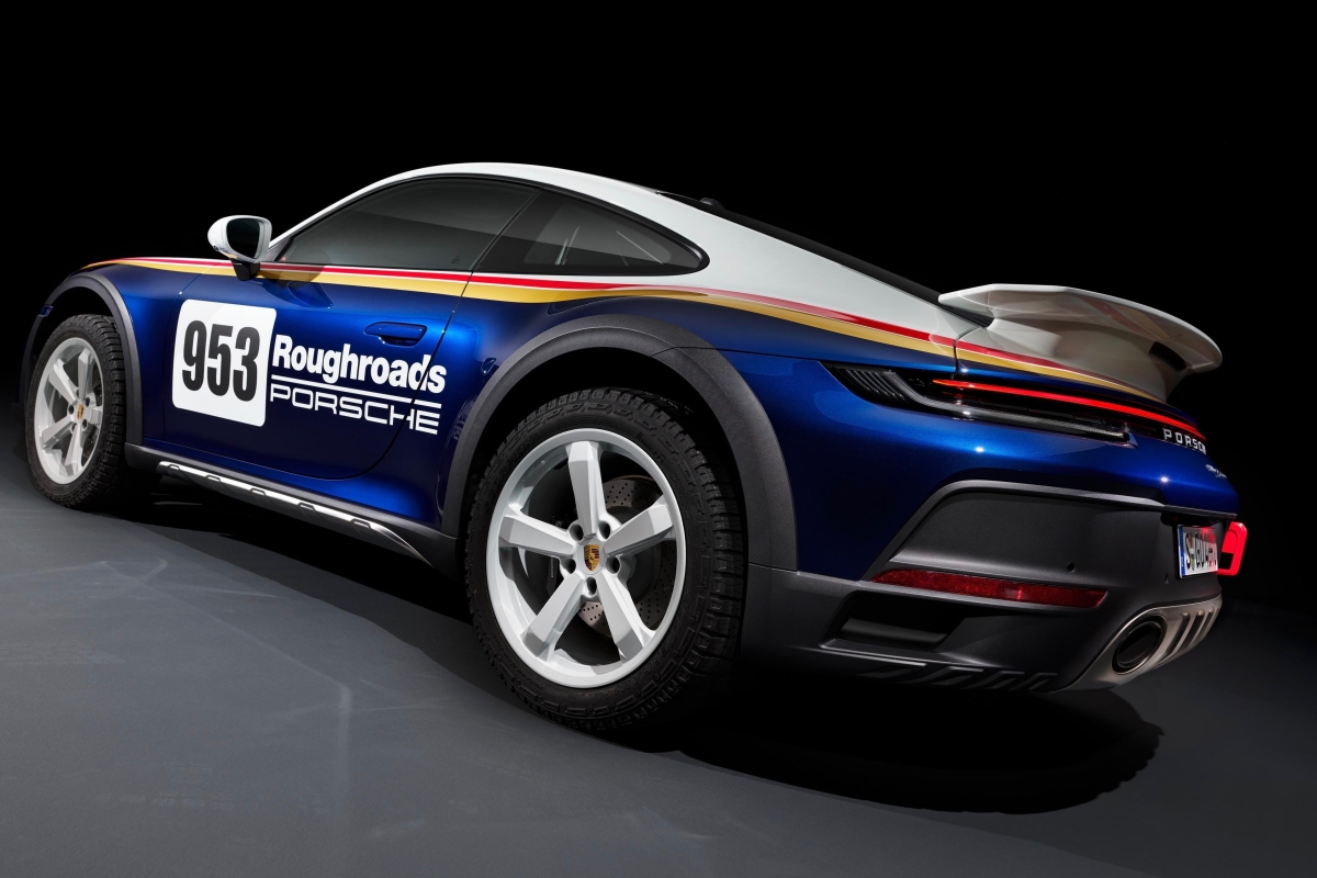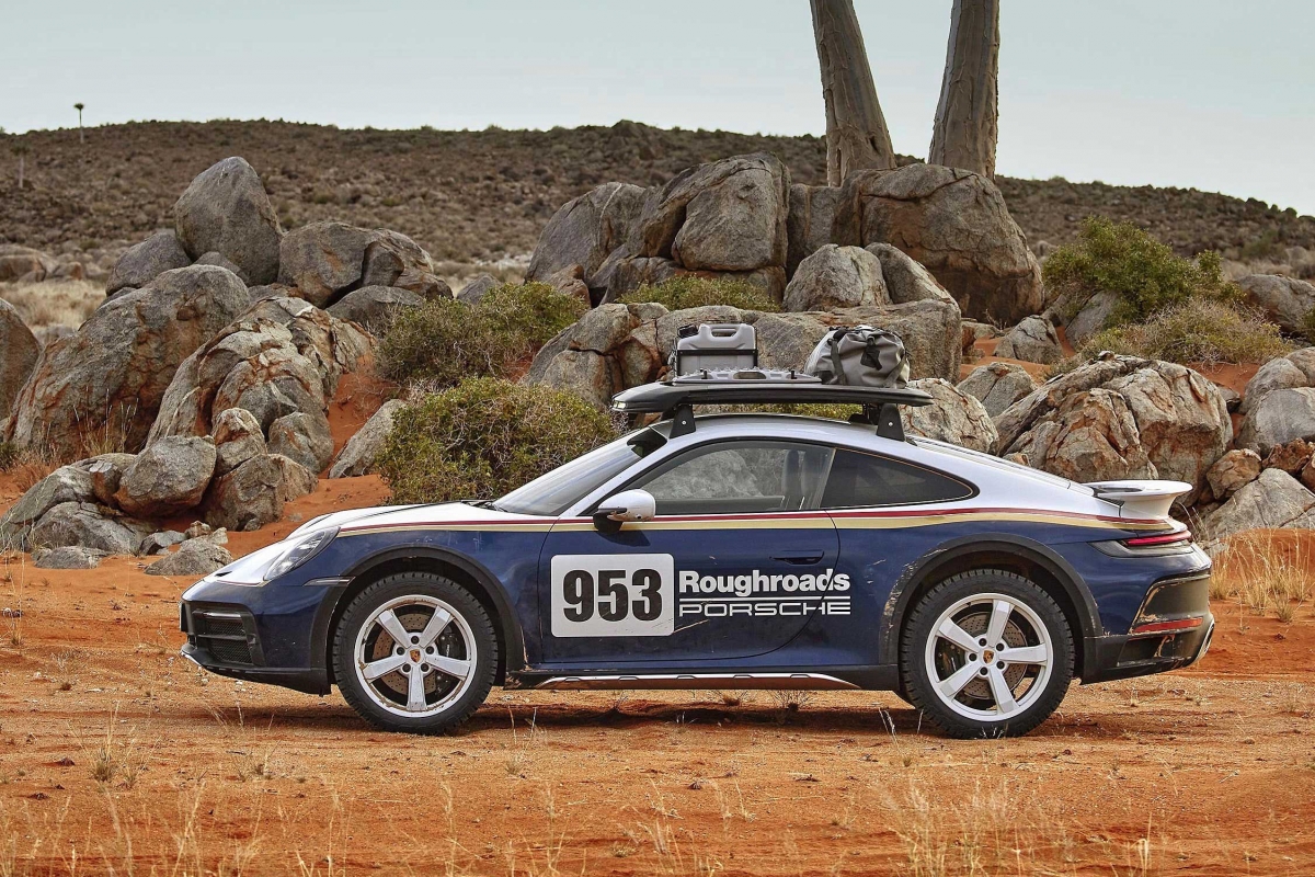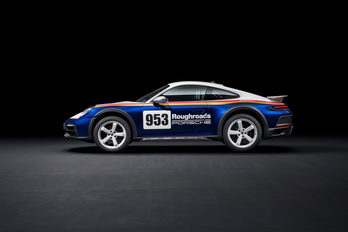 A base do Pacote Rallye Design da Porsche Exclusive Manufaktur, disponível como opção, é o acabamento bicolor em branco e azul gentiana metalizado. A Porsche implementa, pela primeira vez num modelo de produção em série, a combinação de uma pintura bicolor e películas decorativas. Nas portas, os clientes podem selecionar um número entre o 0 e o 999. Para além das faixas em vermelho e dourado, o 911 Dakar com o Pacote Rallye Design, que tem um visual baseado no veículo vencedor do Rali Paris-Dakar de 1984, também conta com a inscrição “Roughroads” nas portas. O termo é uma marca registada e reflete o conceito do 911 Dakar e as suas aptidões para todo-o-terreno. As jantes pintadas em Branco e a faixa de luz traseira em Vermelho completam o aspeto diferenciador. Outros destaques que podem ser encontrados no interior: pacote de equipamento alargado em Race-Tex e Pele, bem como cintos de segurança e detalhes em azul tubarão.
