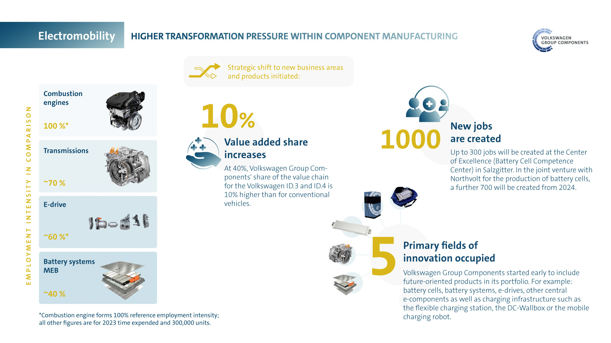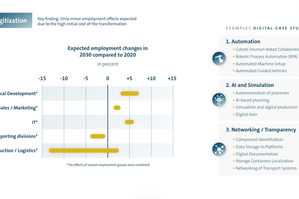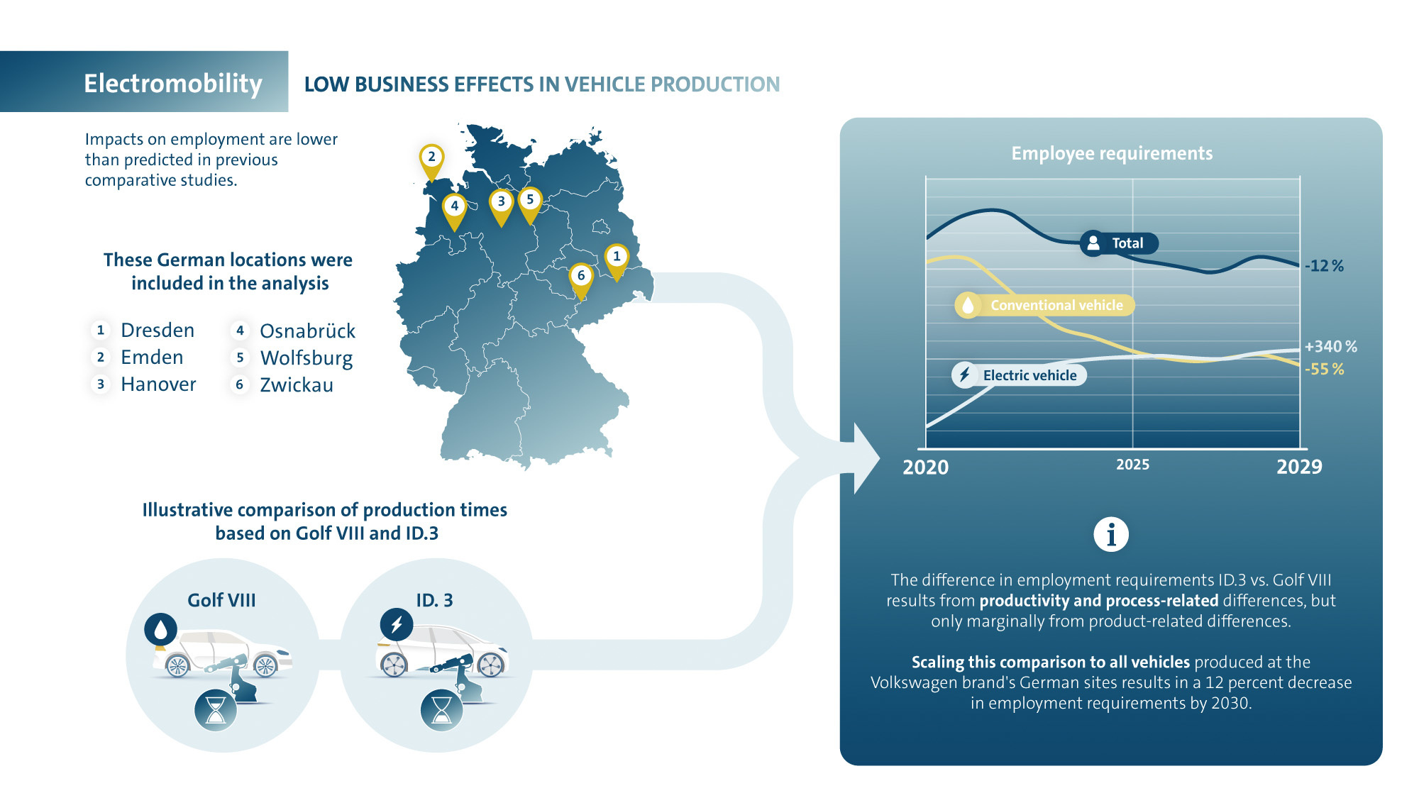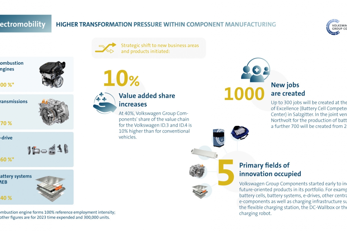 Segundo esta abordagem, se se mantivessem os atuais volumes anuais de vendas, a Volkswagen poderia enfrentar uma diminuição de funcionários a 12%. No entanto, com o aumento das vendas de EV na próxima década e as novas oportunidades que os automóveis elétricos irão oferecer aos profissionais de serviços e especialistas em Tecnologias de Informação (TI) e de outras novas tecnologias, essa queda será compensada, conclui esta reflexão.
