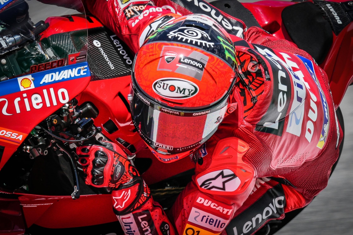 Finalmente, na categoria rainha, primeiro o grande susto com a queda de Nakagami que chega a embater com a cabeça na roda de Bagnaia. Simplesmente arrepiante!