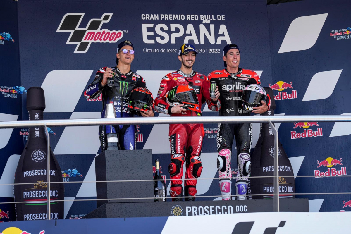 Já na categoria rainha Bagnaia e a sua Ducati estiveram imparáveis. Neste circuito, apesar de não ter grandes retas, as motos de Bolonha eram francamente rápidas e Bagnaia esteve verdadeiramente imperial, não dando hipótese a mais ninguém, cortando a linha da meta com quase mais 3 segundos que Quartaro.