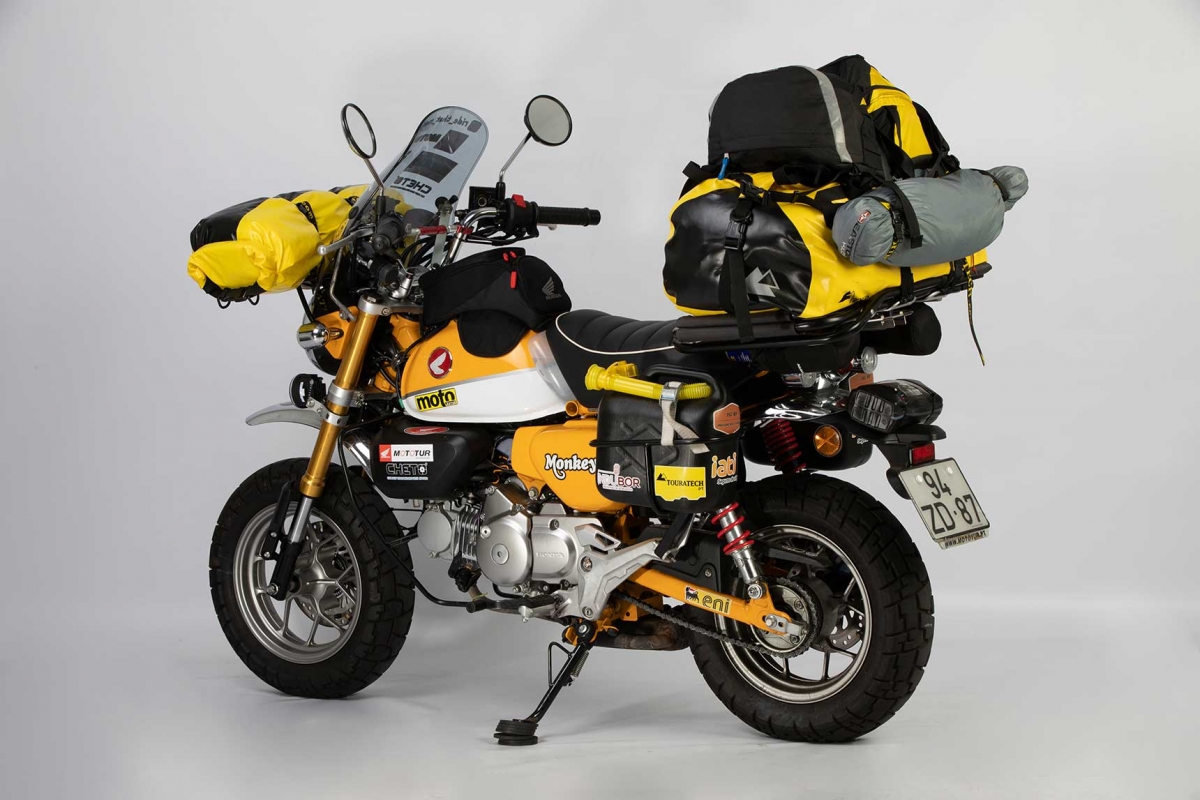 A simpática Monkey tem apenas 124 cc, motor a 4 tempos, 2 válvulas SOHC, refrigeração por ar, debita 9,2 cv às 6.750 rpm e tem um binário de 11 Nm às 5.500 rpm! Acresce um peso em ordem de marcha de 104 kg (muito aumentado pela bagagem e peças sobressalentes), pneus de apenas 12 polegadas (frente 120/80-12” e traseiro 130/80-12”) e o seu depósito comporta somente 5,6 litros, embora o consumo homologado seja de apenas 1,5 l por cada 100 km!