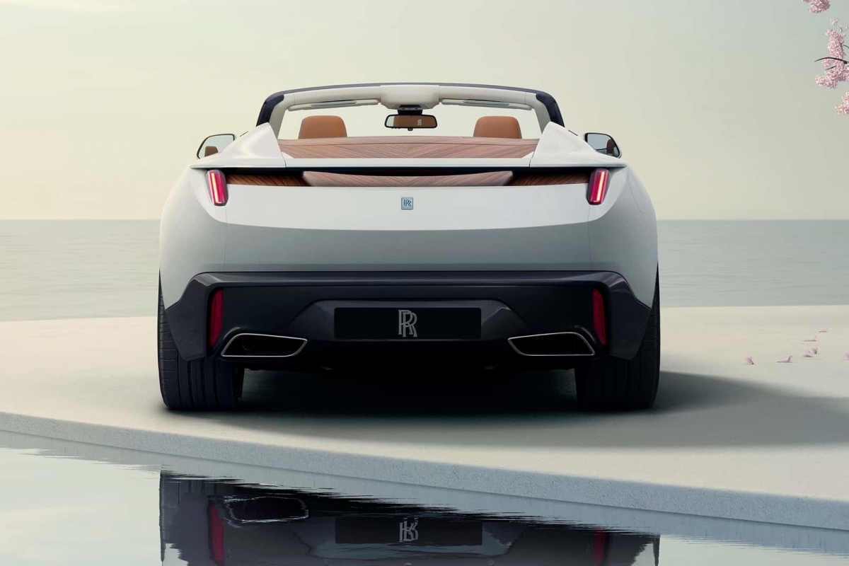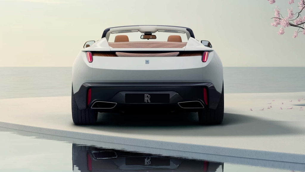 Para honrar a forma droptail, os designers da Rolls-Royce Coachbuild desenvolveram um esquema de cores de dois tons calmo e muito natural. O desejo do cliente era definir um branco intemporal, que à primeira vista parece ser uma cor sólida, mas que, quando visto de perto à luz natural, evoca um fascínio especial. Para o conseguir, a cor principal da carroçaria é um branco monocromático com partículas de alumínio e vidro.