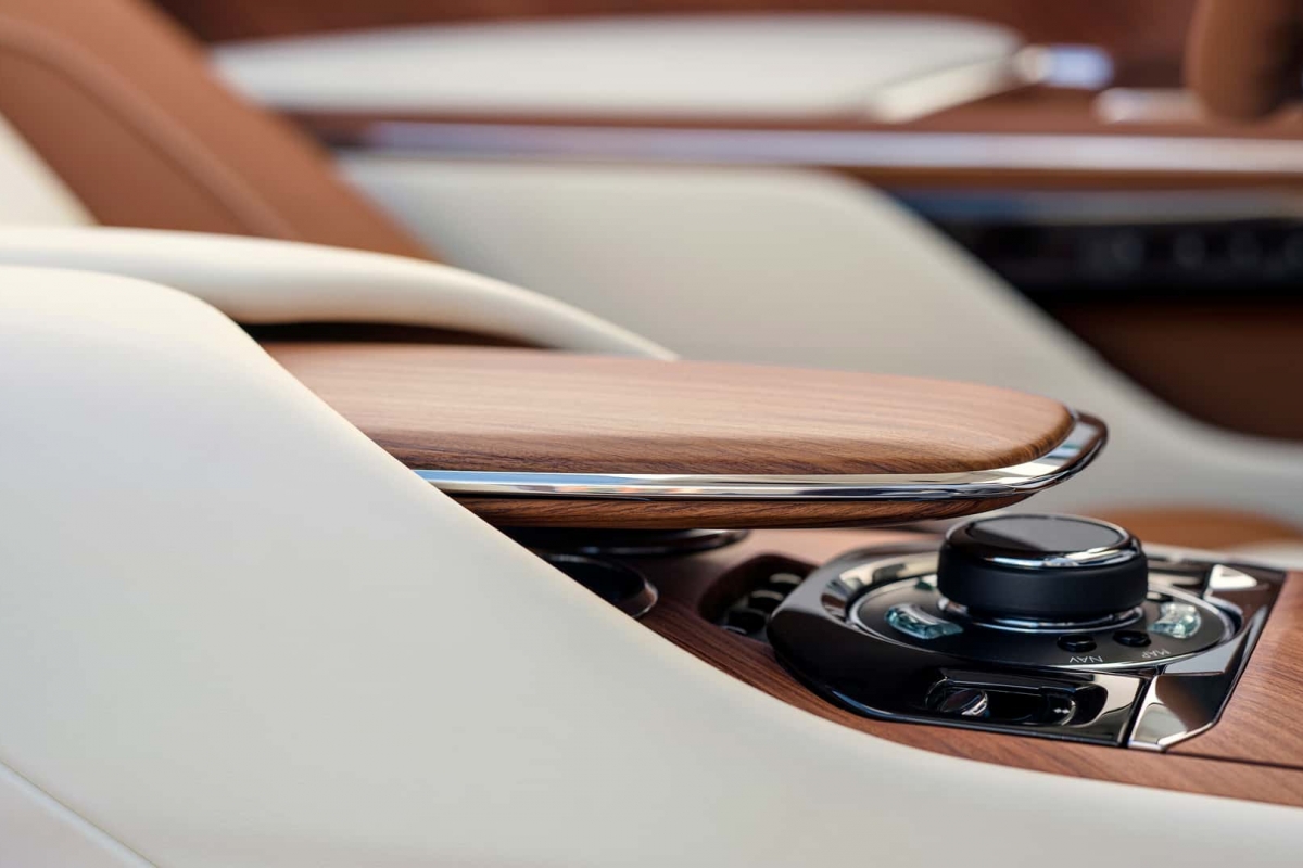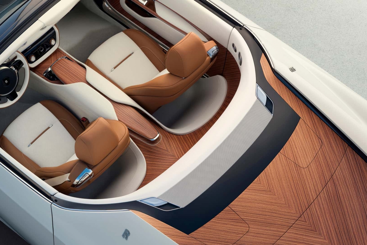 Em homenagem à pintura brilhante de alto brilho dos Rolls-Royces históricos que fascinam particularmente os clientes, os contornos exteriores da grelha do radiador, as secções das asas com vincos e as jantes de liga leve de 22 polegadas foram totalmente polidas à mão para obter um efeito espelhado. A madeira ocupa um lugar central no interior, uma vez que o cliente fez exigências específicas em termos de textura, grão, cor e riqueza do material. O cliente partilhou muitos exemplos das suas preferências e inspirações nos campos da arquitetura, edifícios residenciais e automóveis clássicos para orientar os designers e especialistas em materiais da Coachbuild.