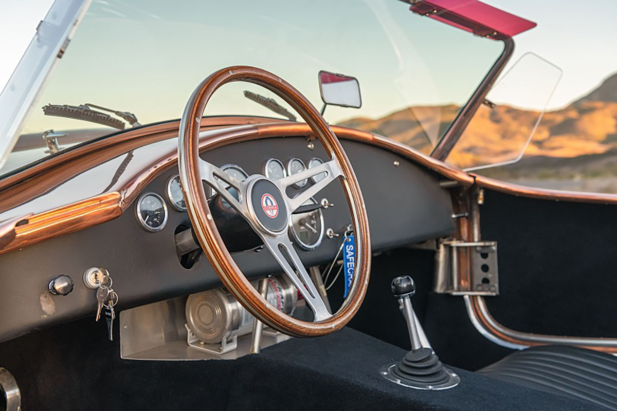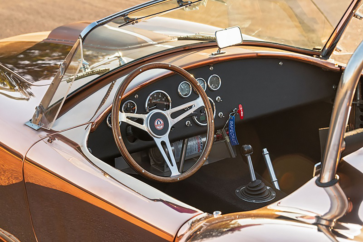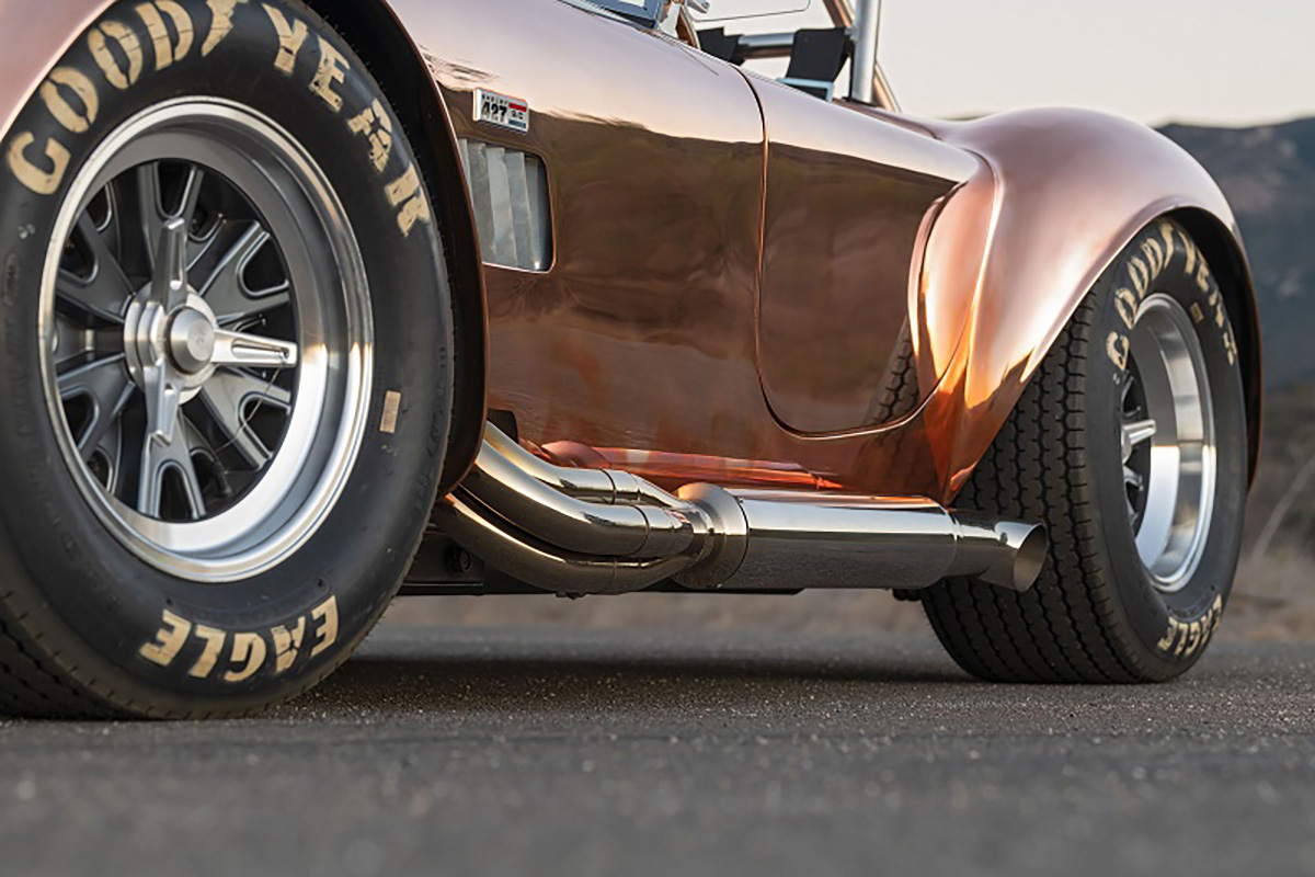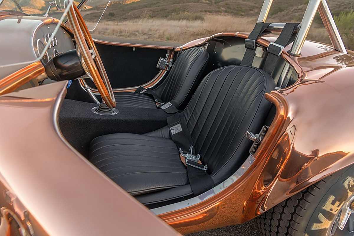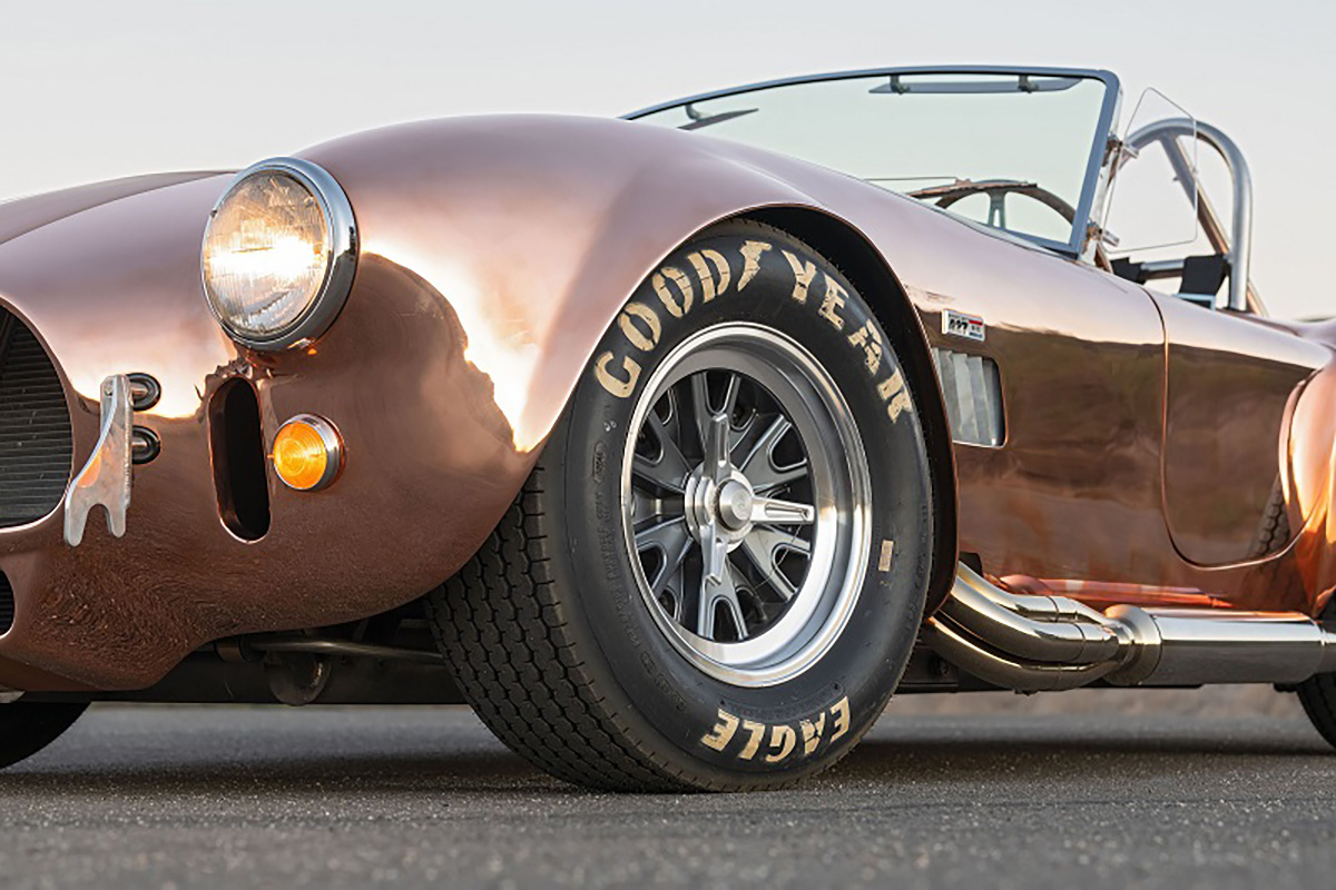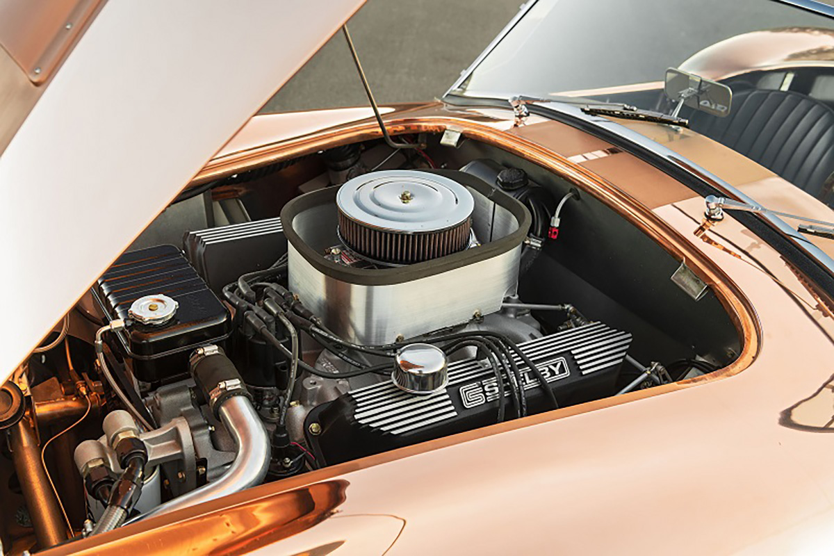 Este Shelby Cobra 427 S/C, com o chassis CSX4602, tem a particularidade de ter a carroçaria construída inteiramente em cobre, todo moldado à mão, utilizando apenas as ferramentas tradicionais, sem dúvida uma obra de arte. Para o acabamento ficar ainda mais soberbo, o cobre foi todo polido. O exterior é colmatado com umas jantes da Halibrand de 15” de aperto central, envoltas em pneus Goodyear Eagle.