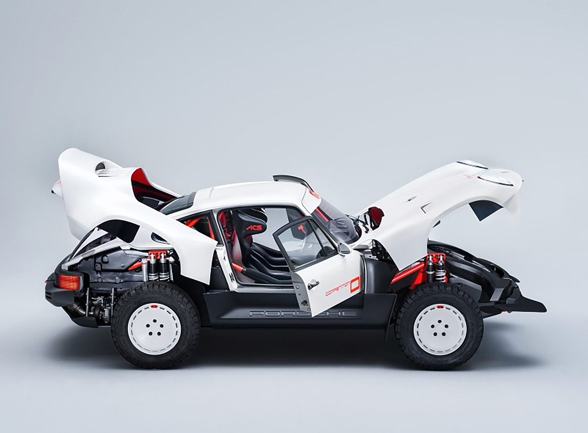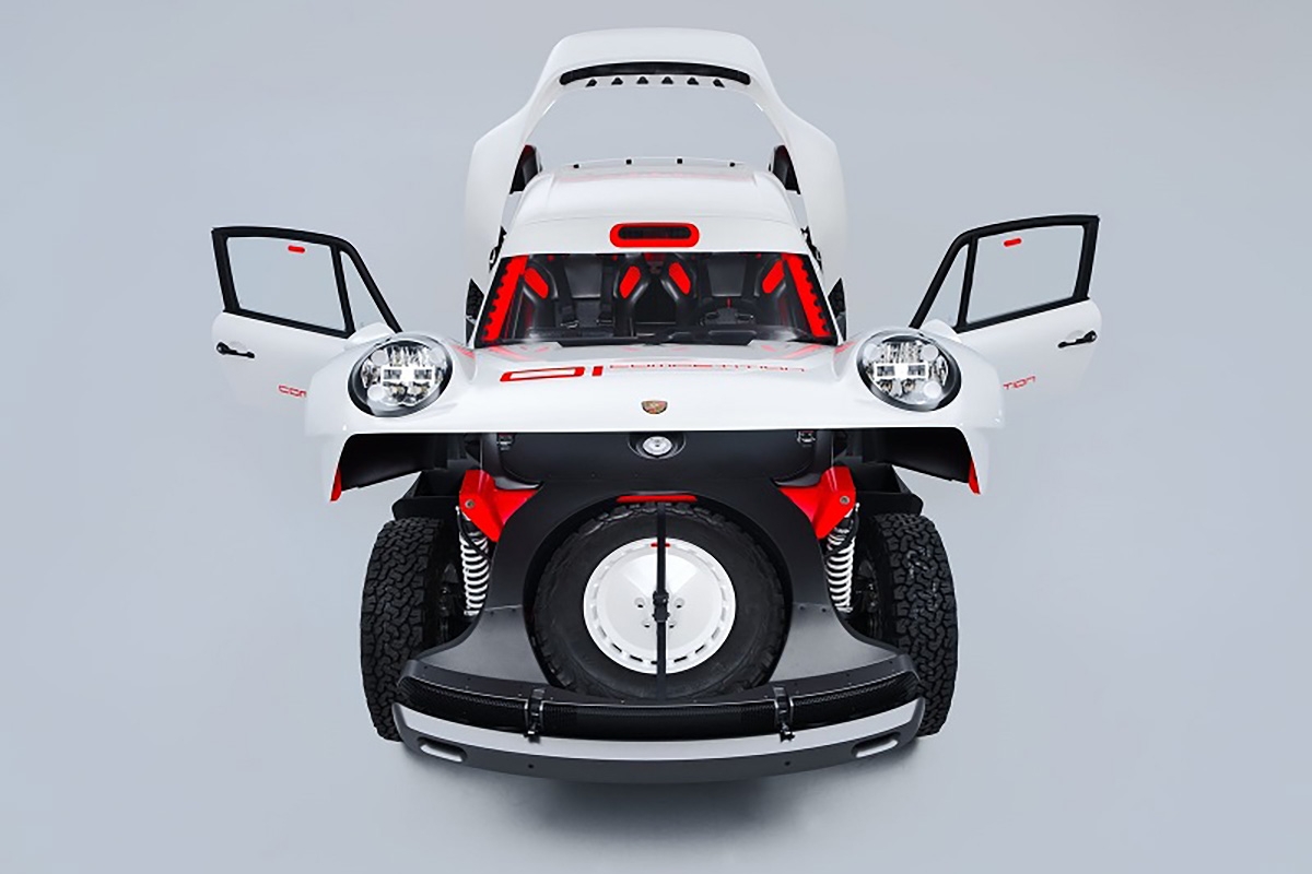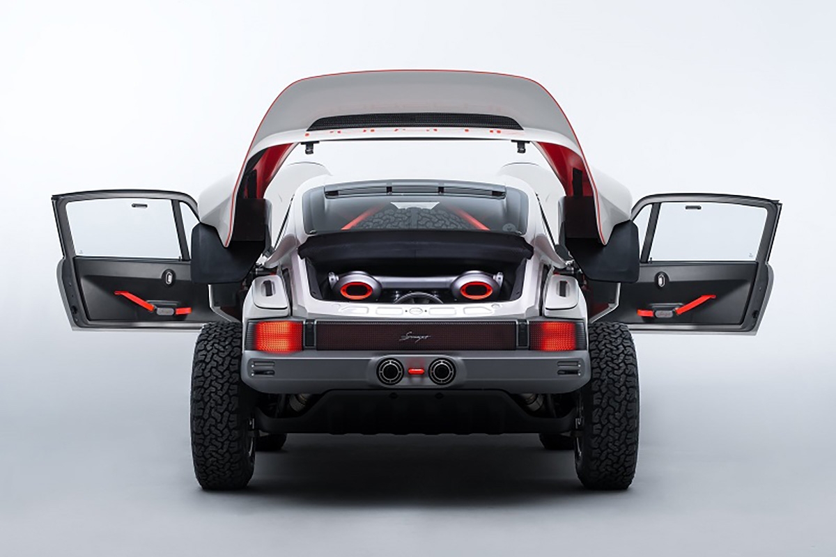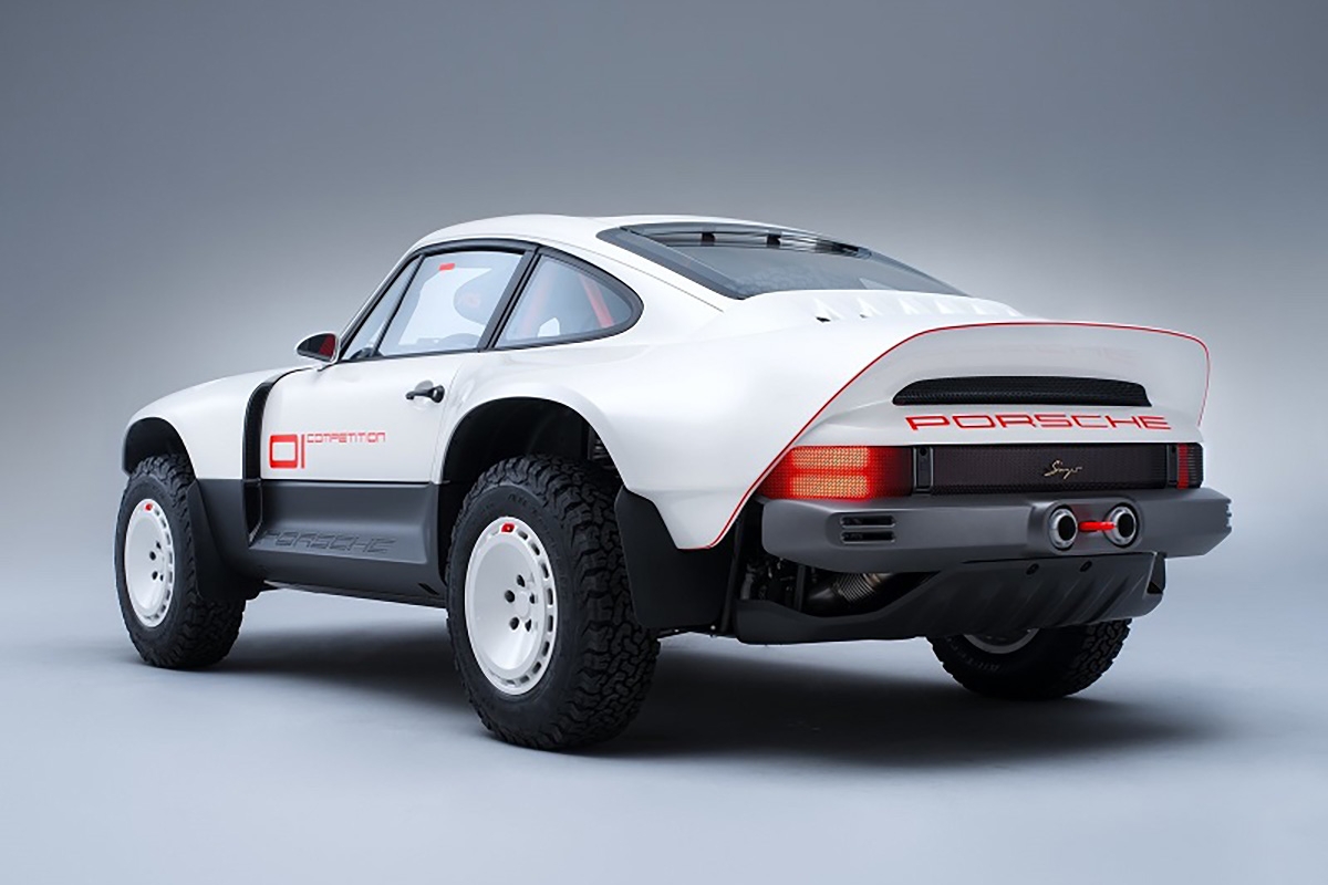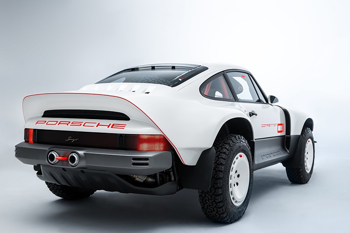 Com base num Porsche 911 da geração 964 de 1990, a Singer inspirou-se nos saudosos Porsche 953 e 959 que competiram no Dakar, elevando a altura ao solo, além de aplicar jantes forjadas de 16” com pneus BF Goodrich K02 de todo-o-terreno e umas generosas protecções laterais com a inscrição Porsche. Na traseira podemos encontrar um spoiler integrado no desenho da carroçaria, algo inspirado no 959. Os painéis da carroçaria são em fibra de carbono e foram desenhados para a sua fácil reparação e substituição. Tudo foi elaborado com a colaboração do britânico Richard Tuthill, especialista em 911 de rali.