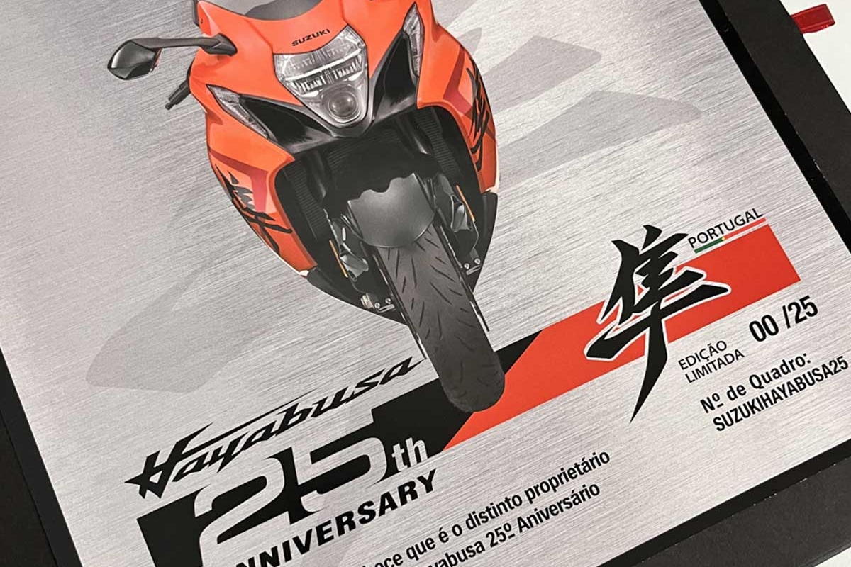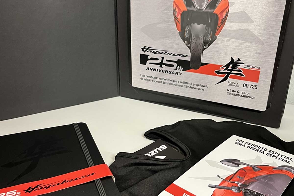 Com um design diferenciado e marcante, a Suzuki Hayabusa 25º Aniversário foi criada para os motociclistas que procuram originalidade e exclusividade. Sob o lema “25 Anos, 25 Hayabusas”, Portugal receberá apenas 25 exemplares desta edição limitada numerada e certificada. Cada moto é acompanhada por uma GIFT BOX exclusiva que trás artigos personalizados. Adicionalmente, todas as motos serão entregues com a oferta do serviço Suzuki Care +2, uma extensão de garantia por mais dois anos.