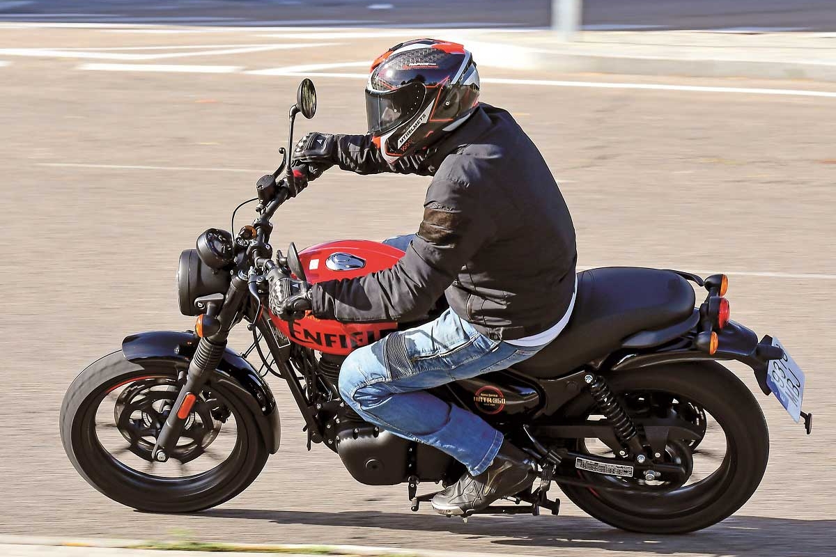 A HNTR 350 não engana ninguém… nem o pretende fazer. O que vemos é o que é. O seu motor monocilindro de 349 cc debita 20,4 cv de potência, é muito agradável, oferecendo simpáticas prestações a baixa rotação e um som limpo quando aceleras. É o mesmo motor que equipa os modelos Meteor e a Classic 350, mas neste modelo, em conjunto com a caixa de 5 velocidades, revela-se muito agradável e divertido de conduzir. Não é pródigo em aceleração (20 cv de potência não dá para grandes aventuras) nem tão pouco na velocidade de ponta; a faixa de utilização preferencial situa-se entre os 80 e os 110 km/h, ainda que possas chegar aos 120 km/h mas já a penalizar parte do conforto. E graças à sua boa postura ergonómica e à leveza do conjunto, as viagens pelas estradas mais reviradas são um autêntico prazer. A HNTR 350 pode funcionar muito bem como primeira moto… ou até a segunda moto, aquela mais especial para quando queres dar bons passeios.