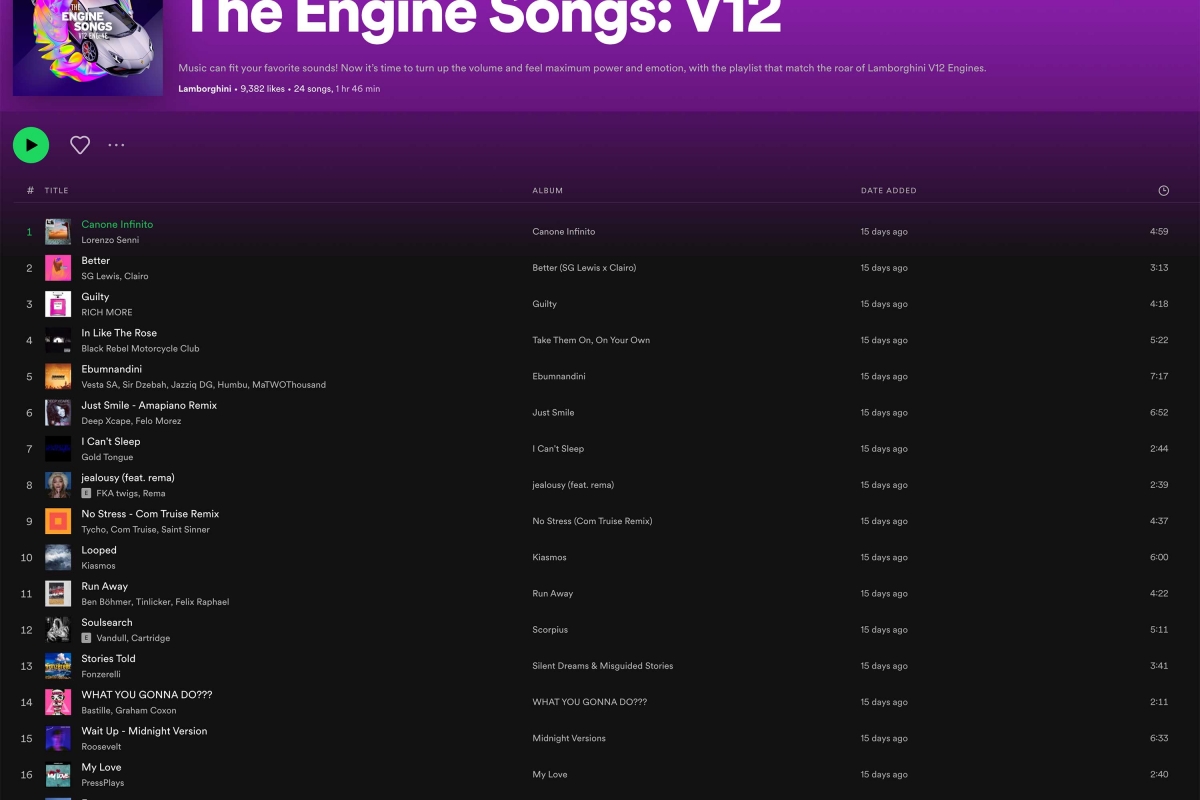 A Lamborghini presta homenagem às melodias únicas dos seus motores de combustão interna, os V12 e V10 naturalmente aspirados, e o V8 biturbo, com três listas de reprodução de 24 faixas, disponíveis no Spotify, que incluem capas criadas pelo designer gráfico Vasjen Katro.