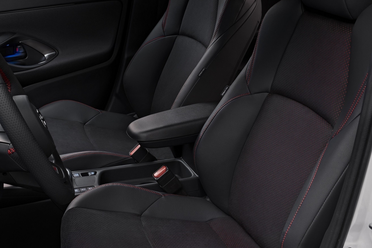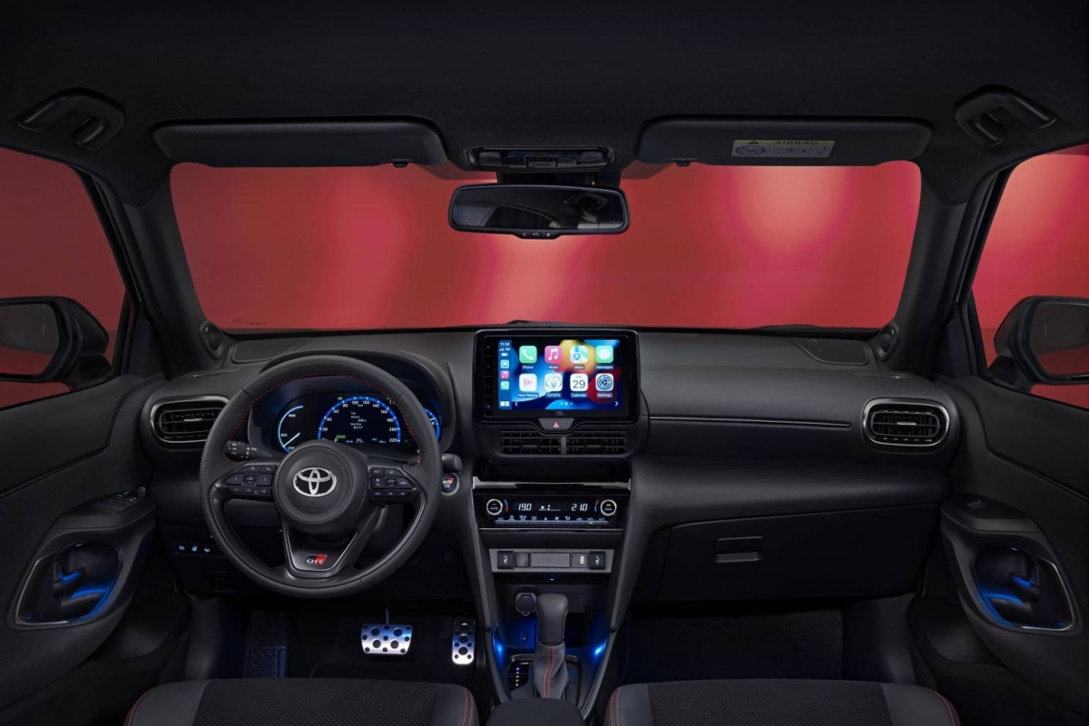 No habitáculo, os bancos desportivos dianteiros em alcântara apresentam um pesponto vermelho. Detalhe esse, que também se pode encontrar no volante e na alavanca de velocidades. O logotipo GR surge ainda nos apoios de cabeça dianteiros, botão “start/stop”, volante e mostrador atrás do volante. Existem ainda inserções em prateado nas portas e no painel de instrumentos que são específicos da versão GR SPORT.