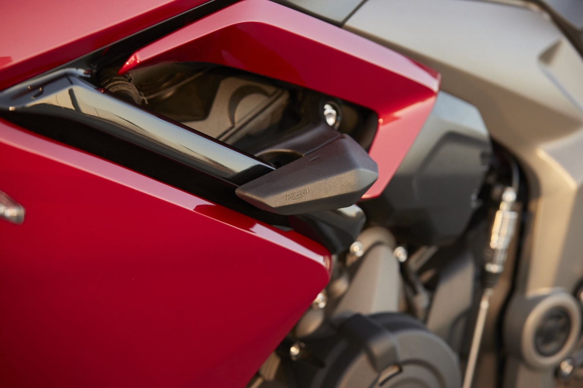 O design renovado da Daytona destaca-se com faróis duplos em LED e uma carenagem minimalista, disponível em três padrões de cores diferentes: Snowdonia White / Sapphire Black, Satin Granite / Satin Jet Black, e Carnival Red / Sapphire Black.