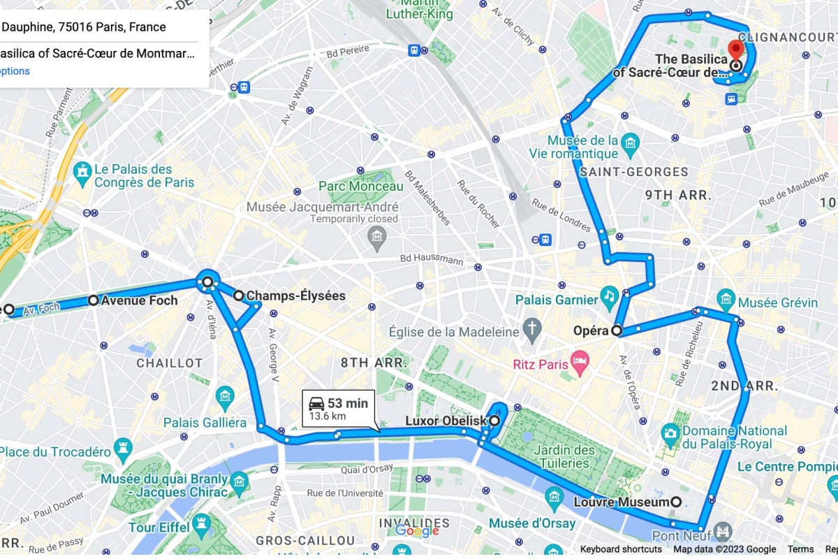 Tudo começa num túnel da Paris periférica em Porte Dauphine, com a vista a bordo de um automóvel invisível que sai numa estrada de acesso à Avenue Foch. Atravessamos monumentos conhecidos como o Arco do Triunfo, a Ópera Garnier e a Praça da Concórdia com o seu obelisco, bem como os Campos Elísios.
