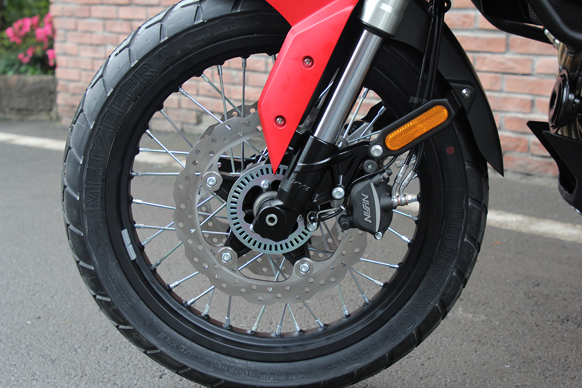Os travões empregam discos “Wave” e pinças Nissin (também japonesas) com duplo disco de 298 mm na frente e pinças de duplo pistão, enquanto atrás temos um disco de 240 mm com pinça de pistão simples. O sistema de travagem fica completo com um modulador ABS de dois canais que permite ser desligado para facilitar o uso em off-road.