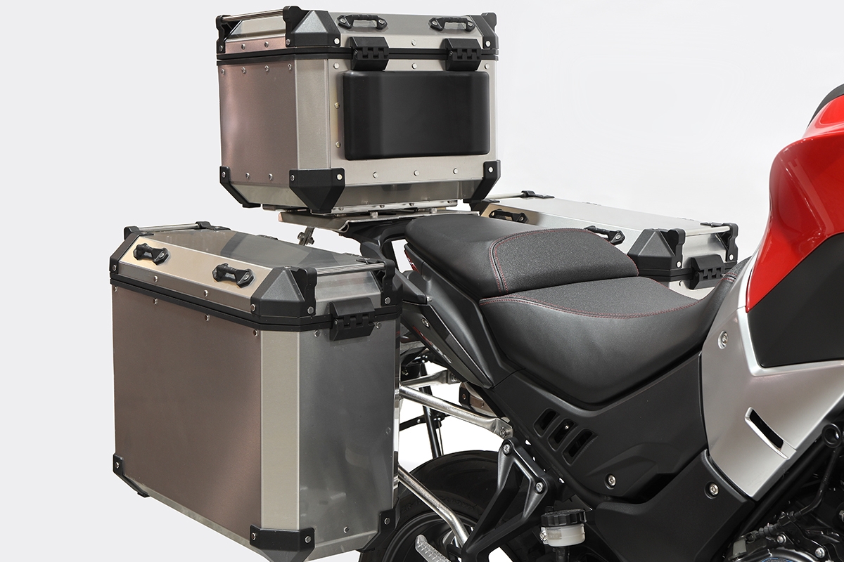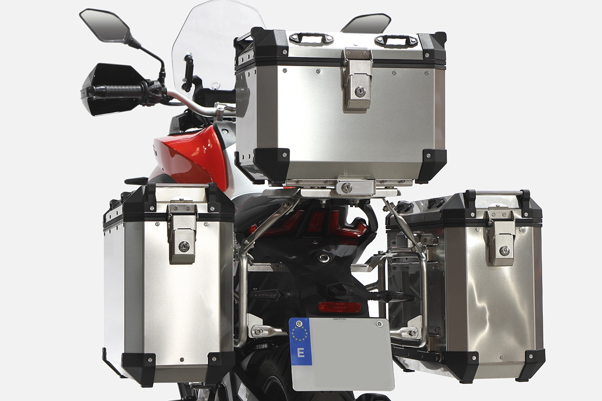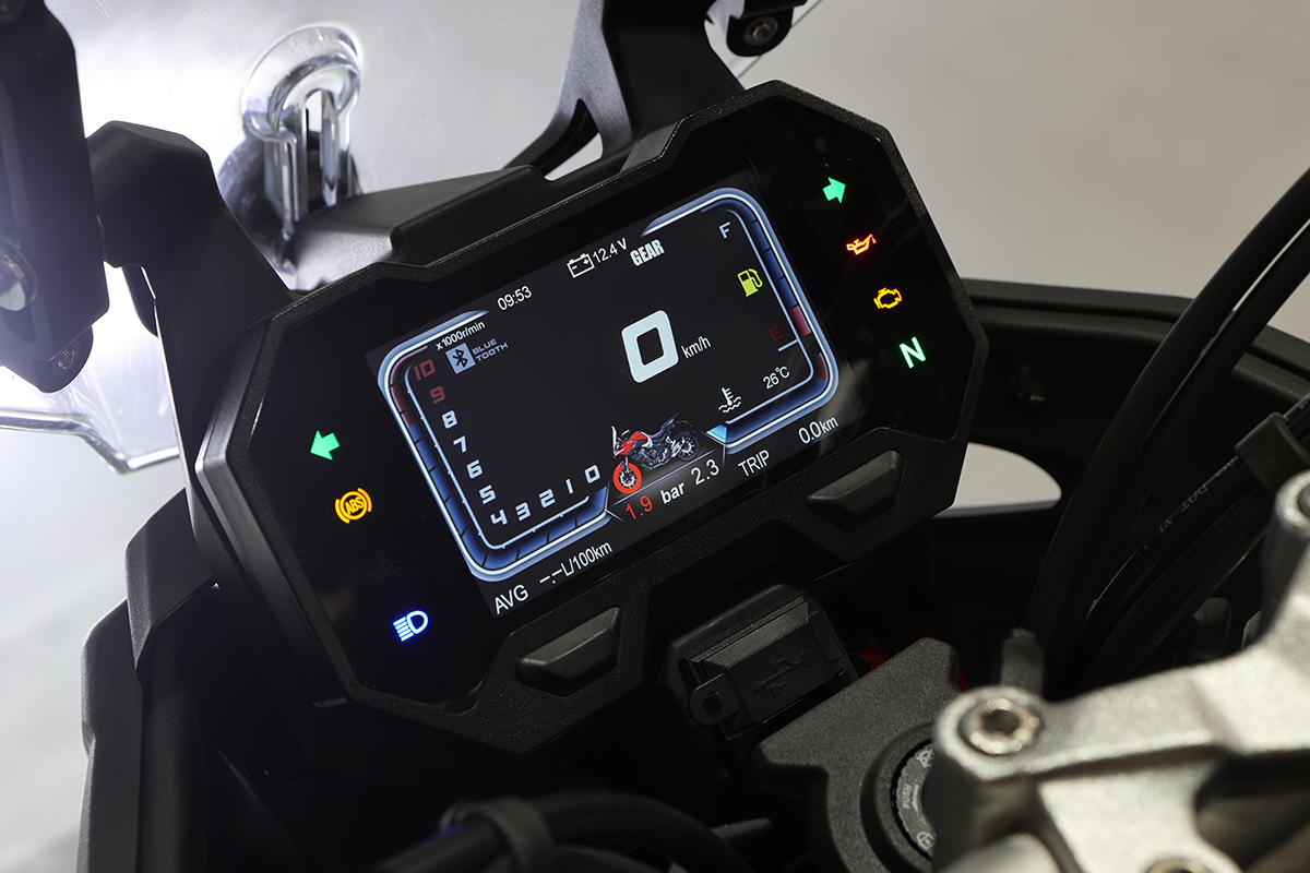 As formas do depósito prolongam-se até à parte dianteira, formando o característico frontal “bico de pato” salvaguardado por tubos de proteção, numa zona onde têm um papel importante o para-brisas regulável em altura e a ótica do farol Full LED. Também é importante destacar a completa instrumentação que emprega um ecrã TFT a cores de grande dimensão e, junto a ele, uma prática tomada de corrente USB para utilizar um telemóvel como aparelho de navegação GPS.