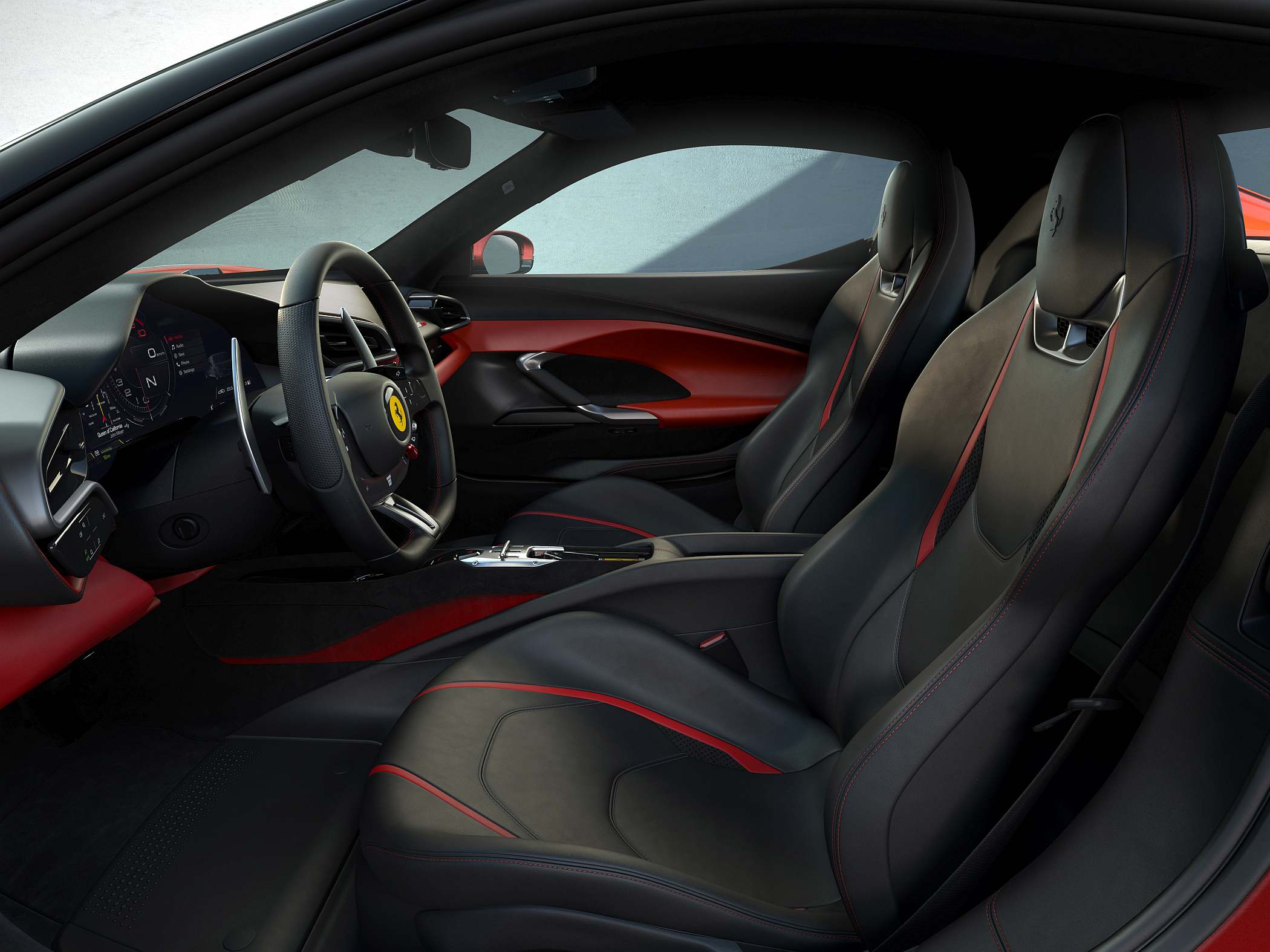 O interior deste desportivo de dois lugares assenta no princípio de um interface digital que a Ferrari estreou no SF90 Stradale, sublinhando a vertente tecnológico em aliança com relativa simplicidade. O volante volta a congregar todos os comandos principais para o controlo do painel de instrumentos digital e do centro de infoentretenimento, também ele colocado na instrumentação. Do lado do passageiro aparece um outro ecrã para algumas informações que podem ser vistas por quem aí vai sentado.