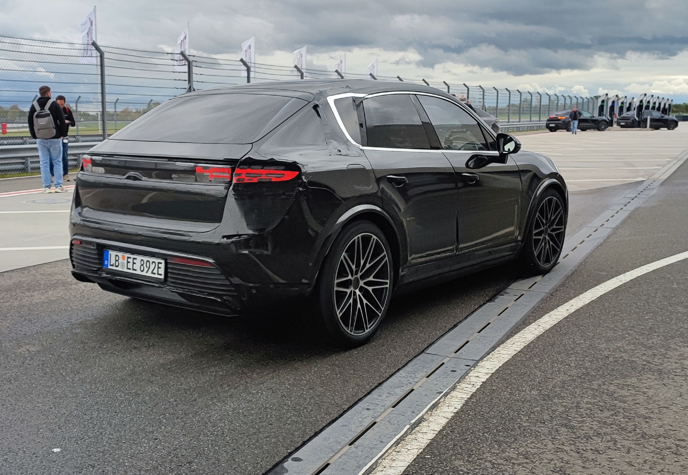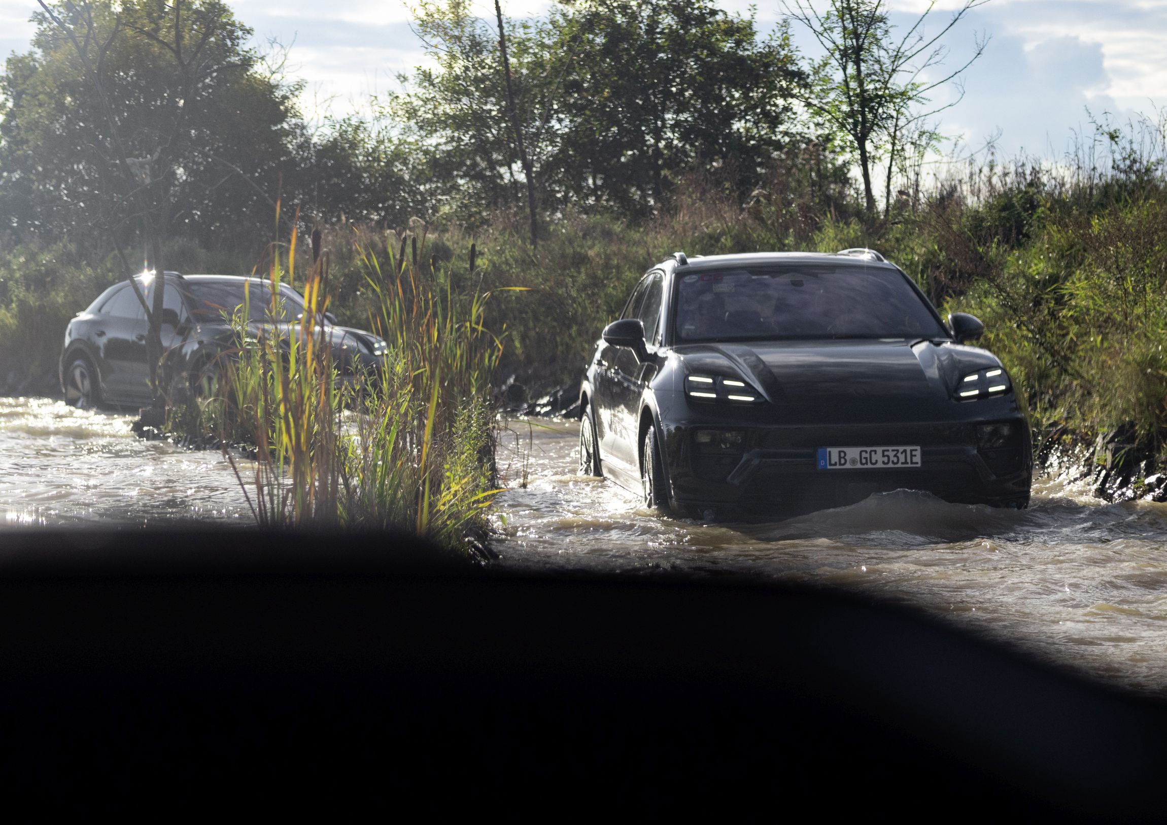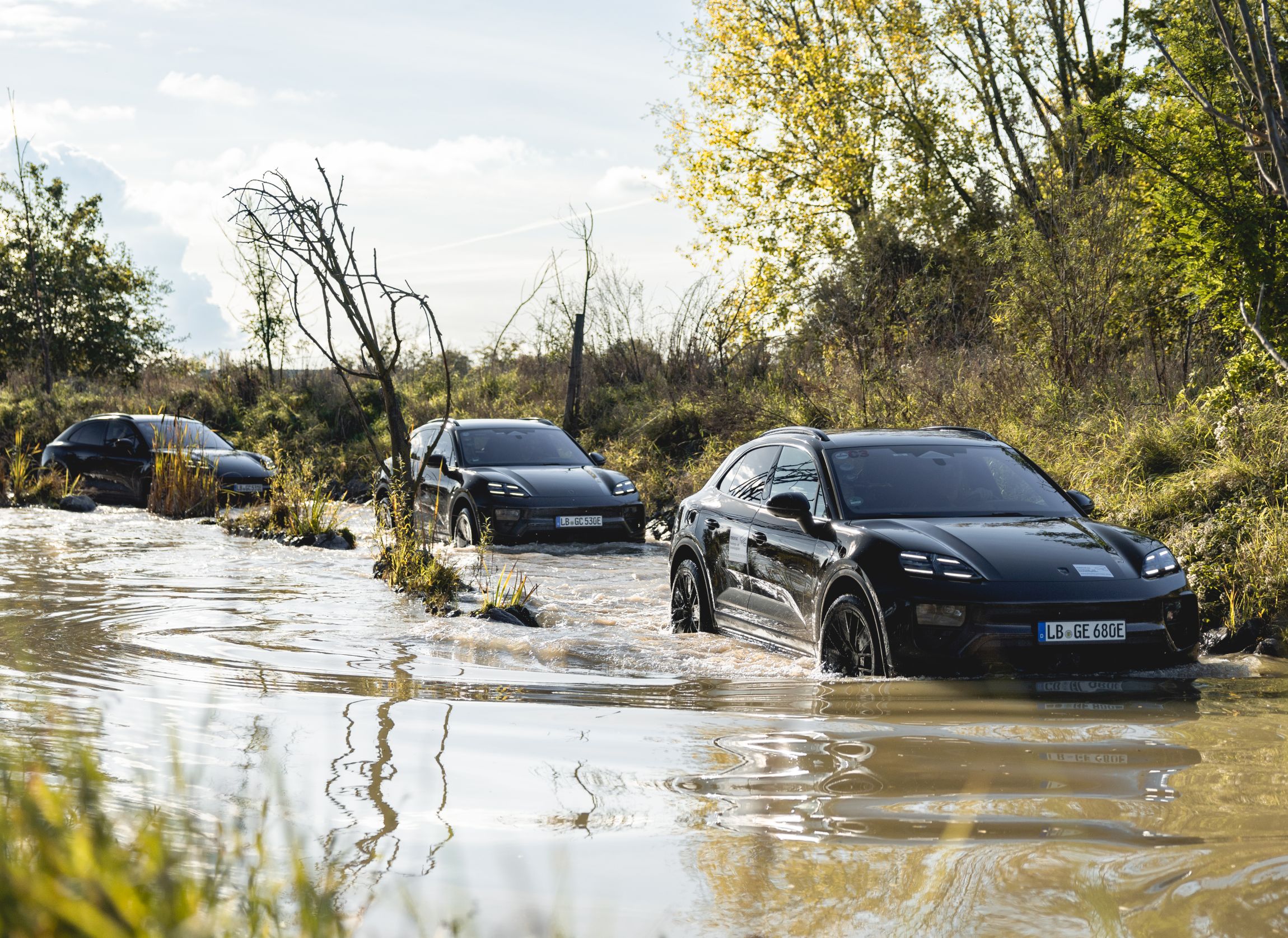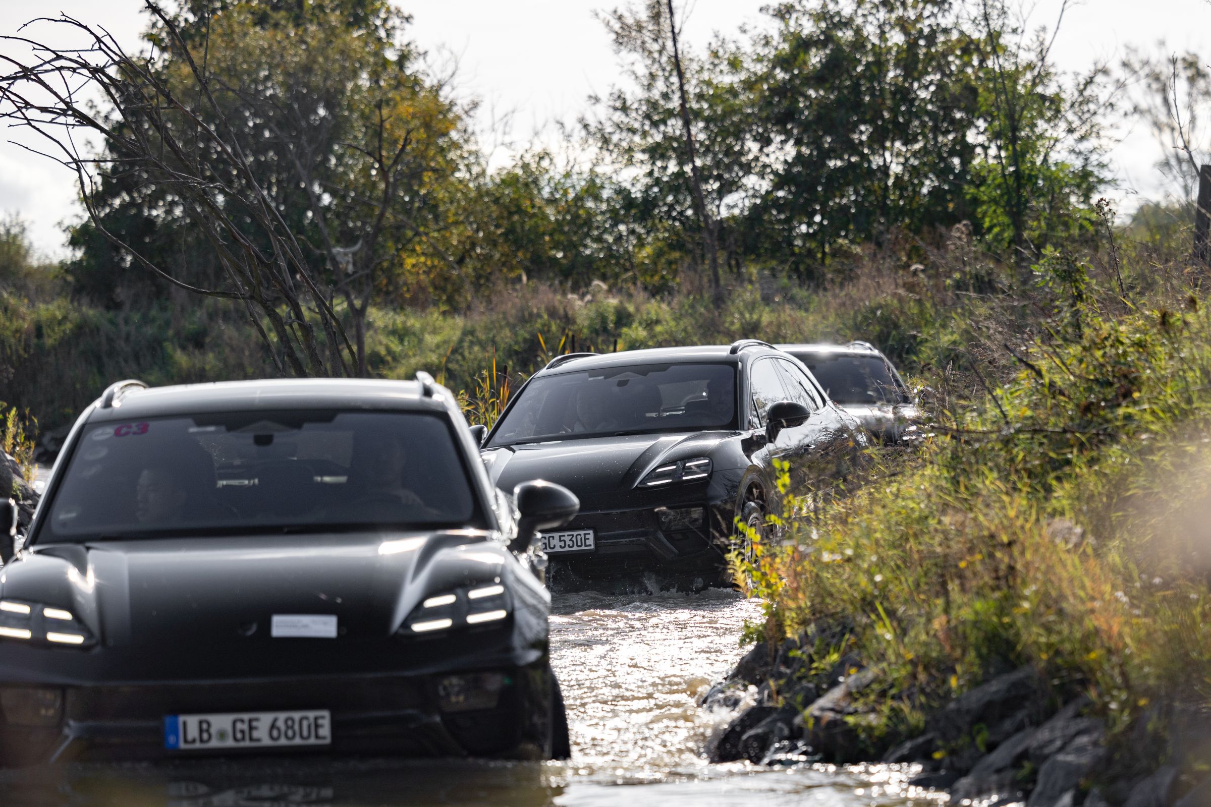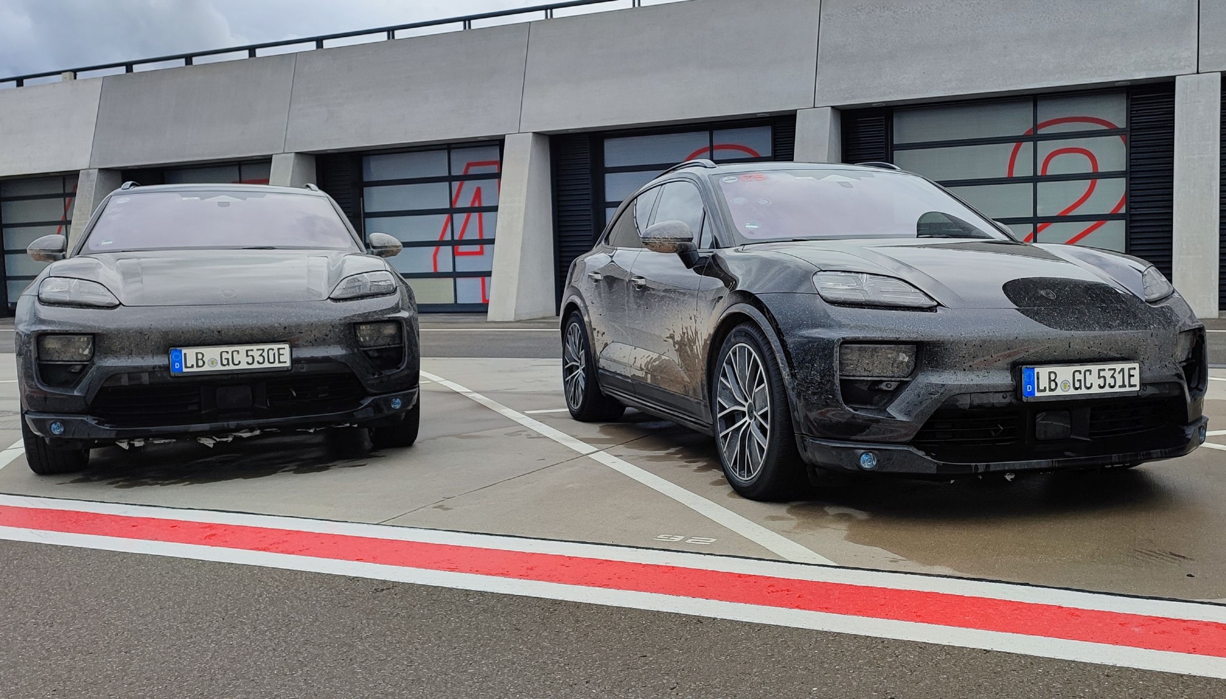 Para este pequeno contacto no Centro de Experiências de Leipzig, junto à fábrica onde são produzidos os novos Panamera e estes mesmos Macan, os quatro modelos para ‘boleias’ tinham por missão mostrar as credenciais dinâmicas do novo SUV compacto, sempre apelando a uma filosofia de que o foco está na condução, mesmo quando os motores de combustão ficaram no passado. Somos agraciados com unidades totalmente camufladas – embora as linhas sejam facilmente observáveis – e tapados no interior para não expor a configuração do habitáculo, mais para os momentos em que cumpre testes fora do recinto do que neste evento…