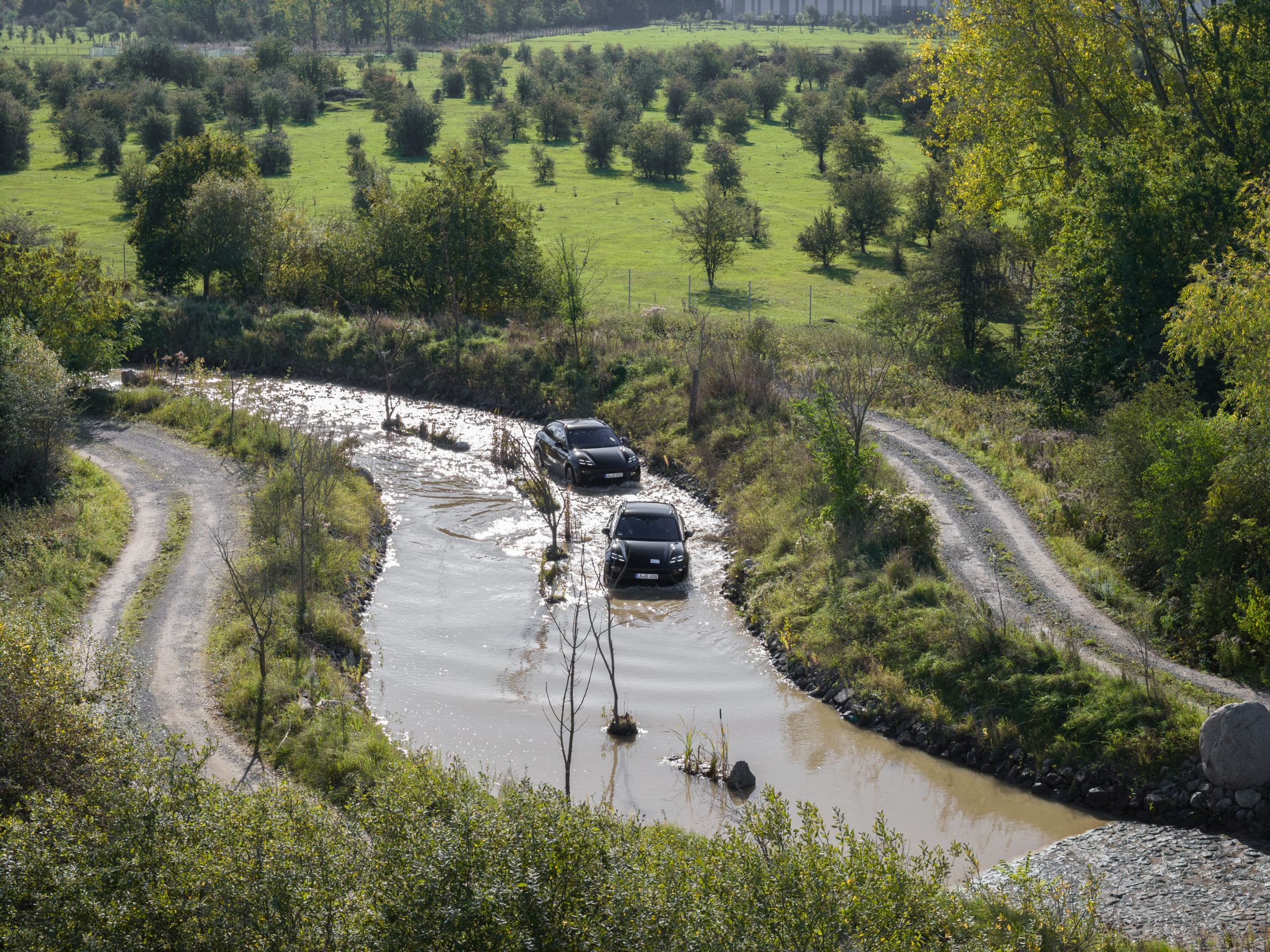 A outra parte do programa ‘táxi’, em que fomos conduzidos, teve lugar numa pista de todo-o-terreno bem ao lado do circuito de asfalto. Os Macan são aqui submetidos a agruras que, talvez, apenas 5% dos seus compradores alguma vez irão experimentar – valas cobertas de água para ensaiar a passagem a vau, cruzamentos de eixos, descidas e subidas íngremes, ângulos de inclinação lateral e muito cascalho e lama.