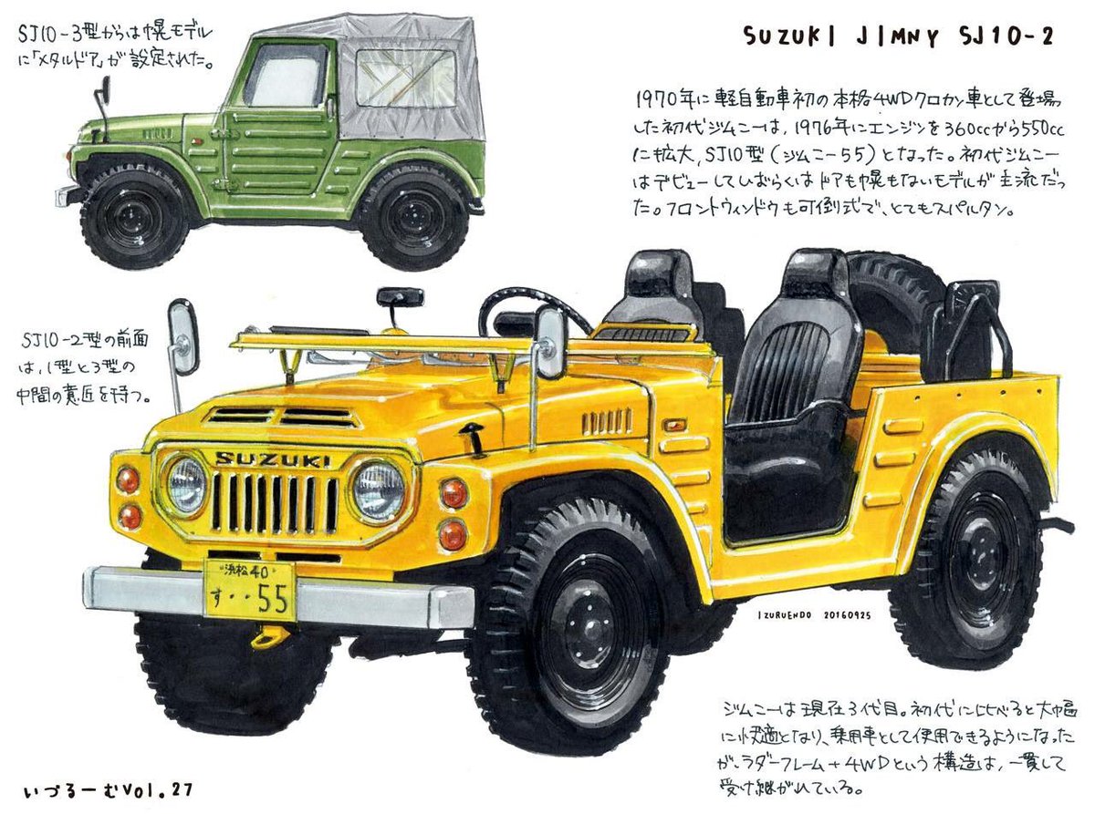 Unindo a sua própria experiência à dos ensinamentos retirados com a aquisição da Hope, não tardou muito até que o Jimny chegasse ao mercado. A primeira geração foi fabricada entre 1971 e 1980, cumprindo com os regulamentos japoneses dos ‘kei cars’, modelos extremamente compactos e de baixa cilindrada.