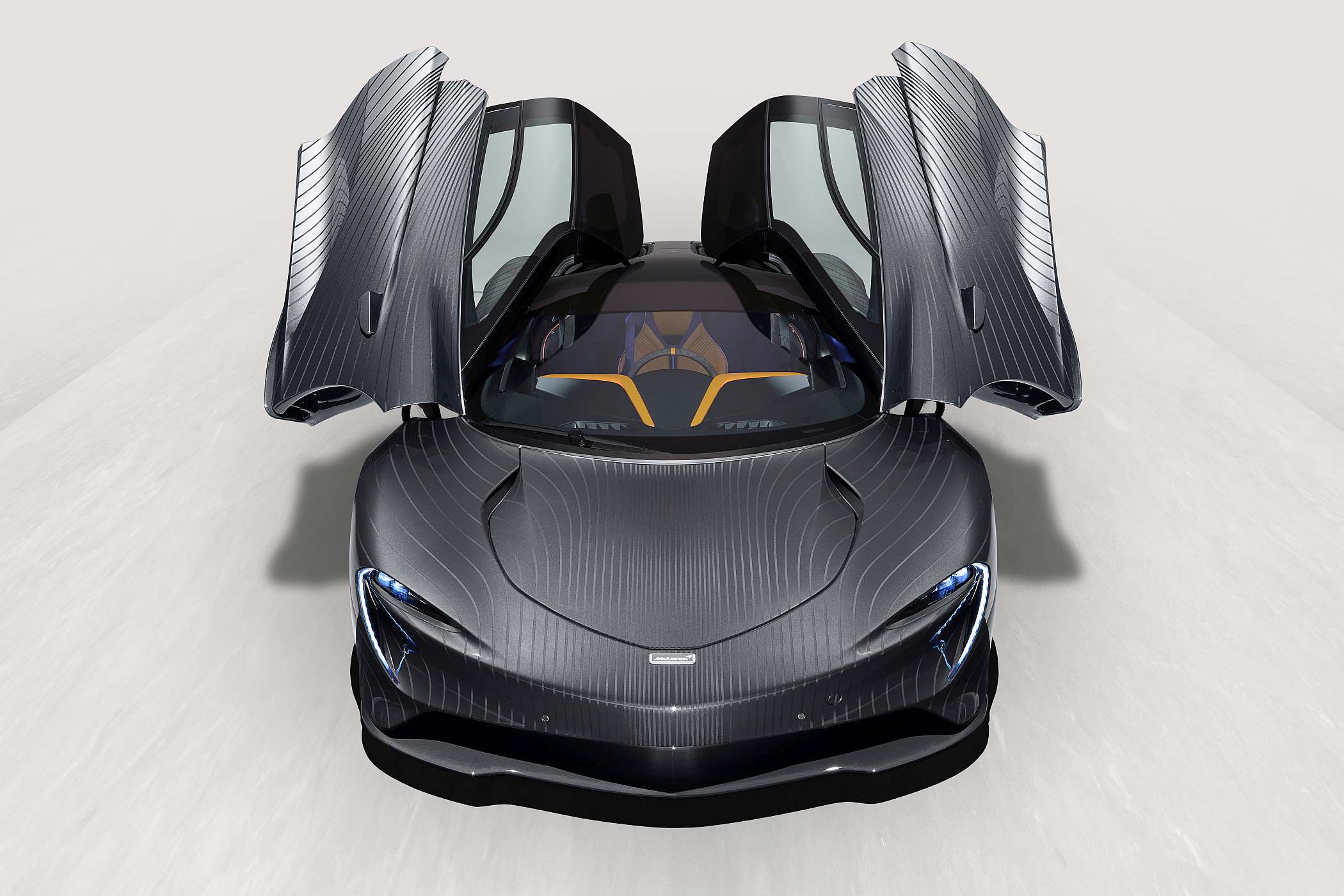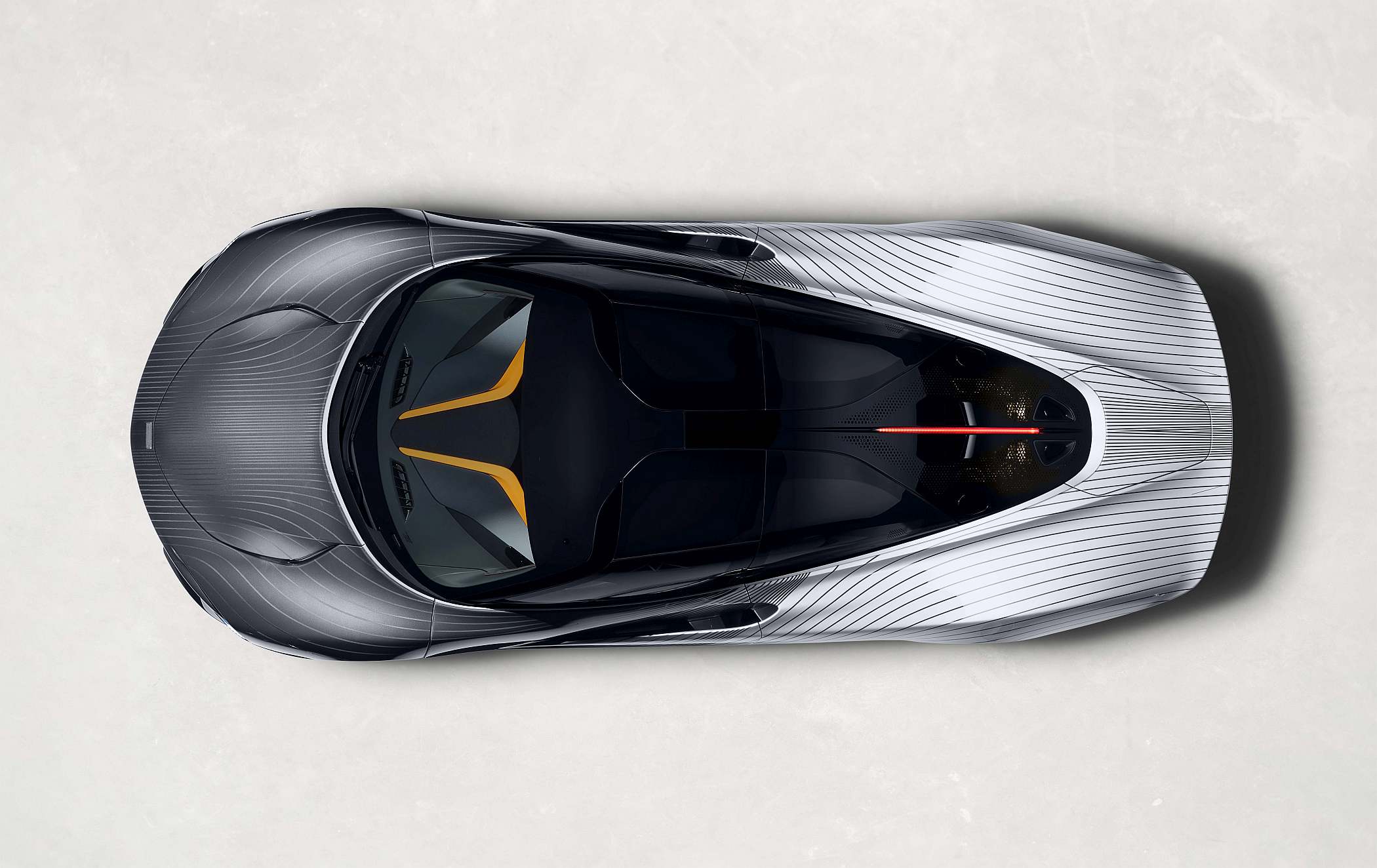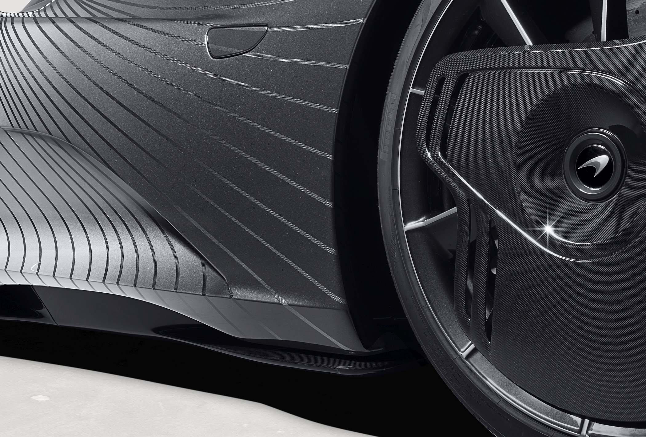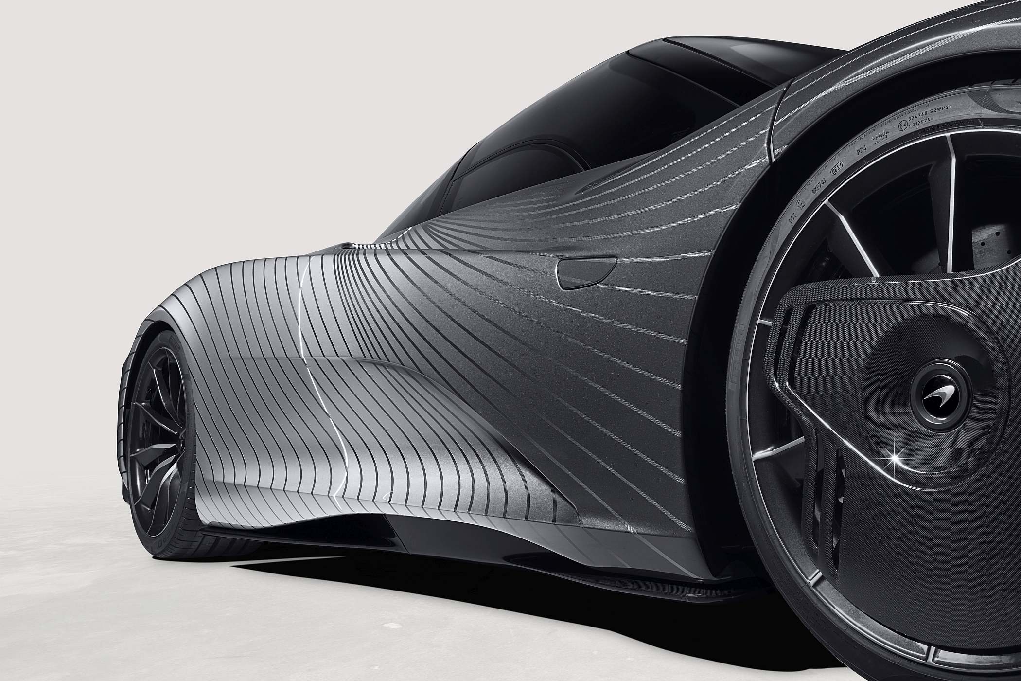 No protótipo, a camuflagem do desenho exterior foi conseguida com uma simples superfície de vinil a envolver a carroçaria, com linhas impressas para representar o fluxo aerodinâmico melhorado deste carro. Inspirada nesse conceito, a versão que irá para Beverly Hills recorre a uma combinação de outras duas cores com profundo significado na história da McLaren: a cor prateada ‘Magnesium Silver’ (a original do McLaren F1 apresentado no GP do Mónaco de 1992) e a cinzenta Ueno Grey, a mesma do GTR que venceu as 24 Horas de Le Mans de 1195.