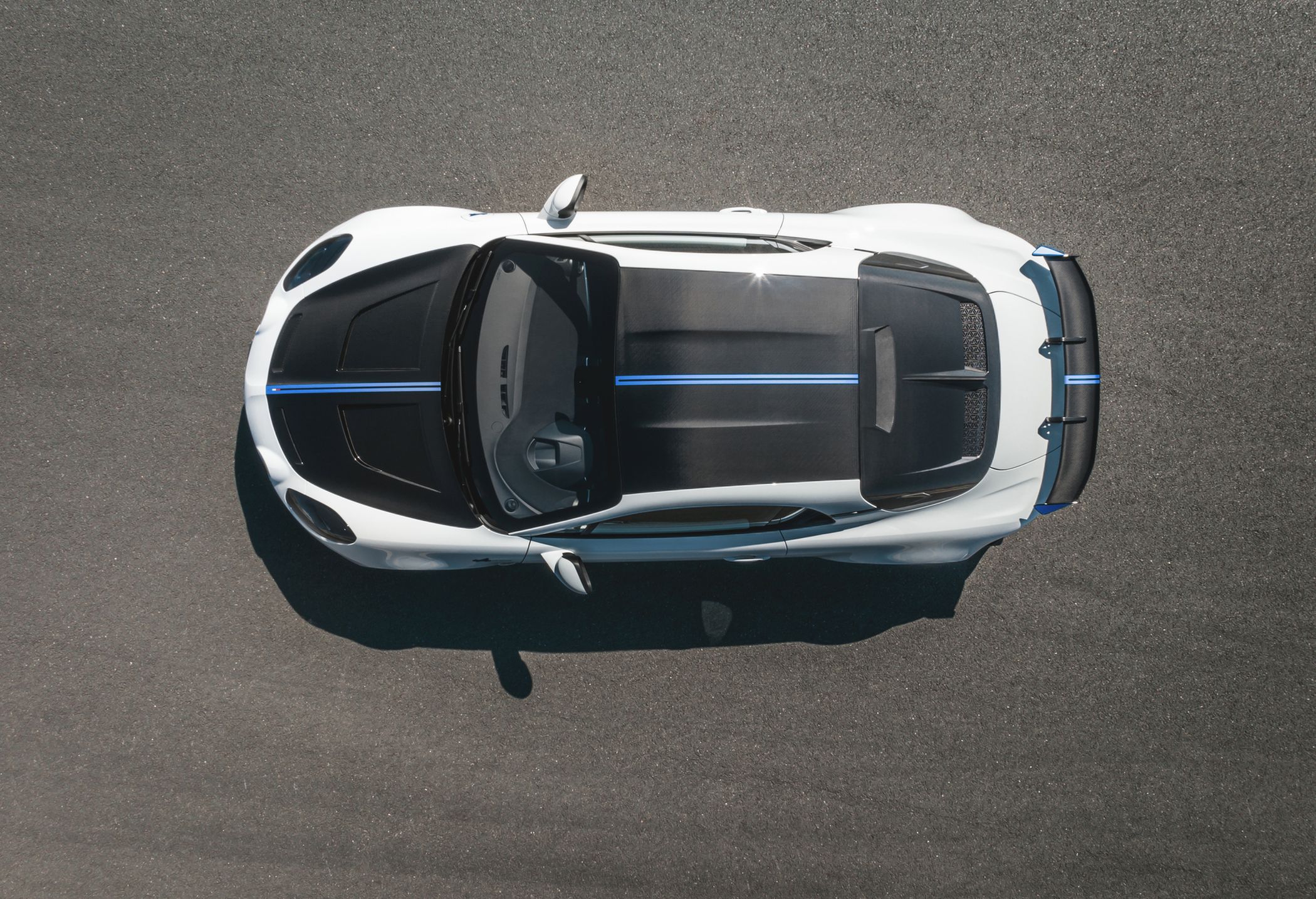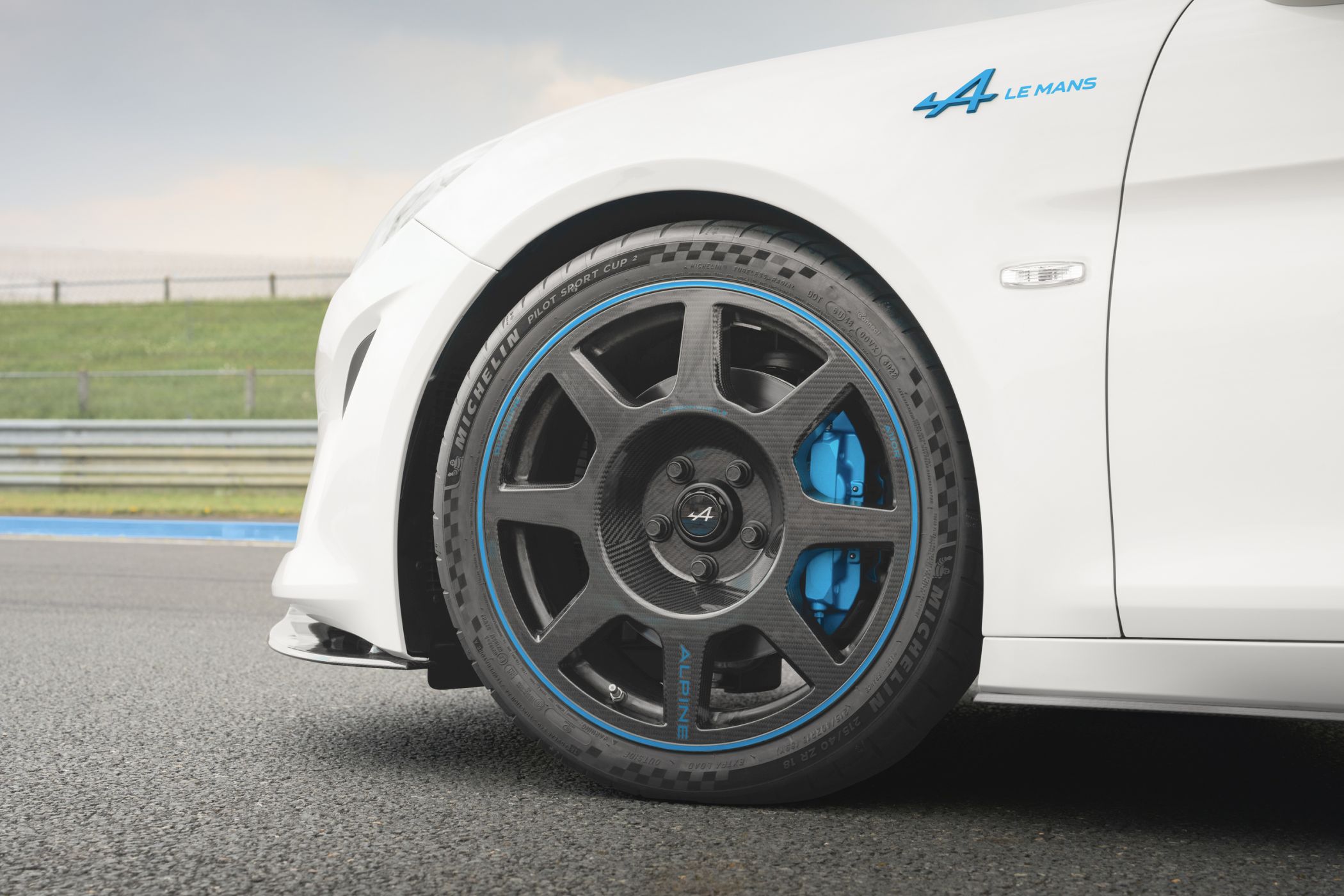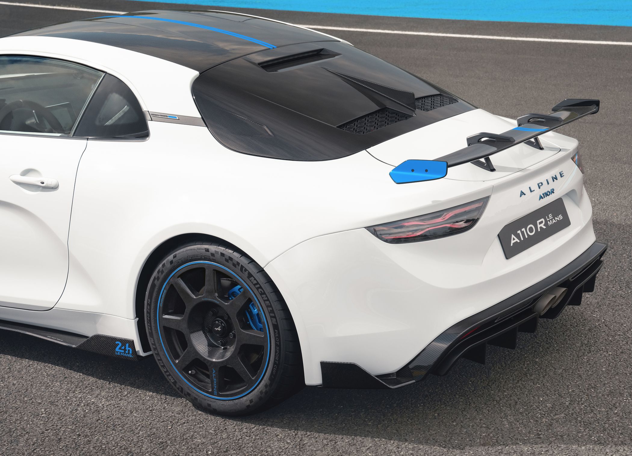Adicionalmente, o A110 R Le Mans distingue-se pela exclusiva pintura 24H de Le Mans em tons de branco e azul. Uma fina linha dupla de azul é aplicada no capot dianteiro, no tejadilho e no spoiler traseiro, numa referência à competição, complementada pelas aletas azuis do spoiler traseiro. Um rebordo azul distingue as jantes em carbono, que são abertas na traseira para uma resistência de travagem ainda maior, enquanto a barbatana (vertical) de tubarão adicionada ao óculo traseiro, em carbono, é uma referência ao A480 que competiu nas 24 Horas de Le Mans.