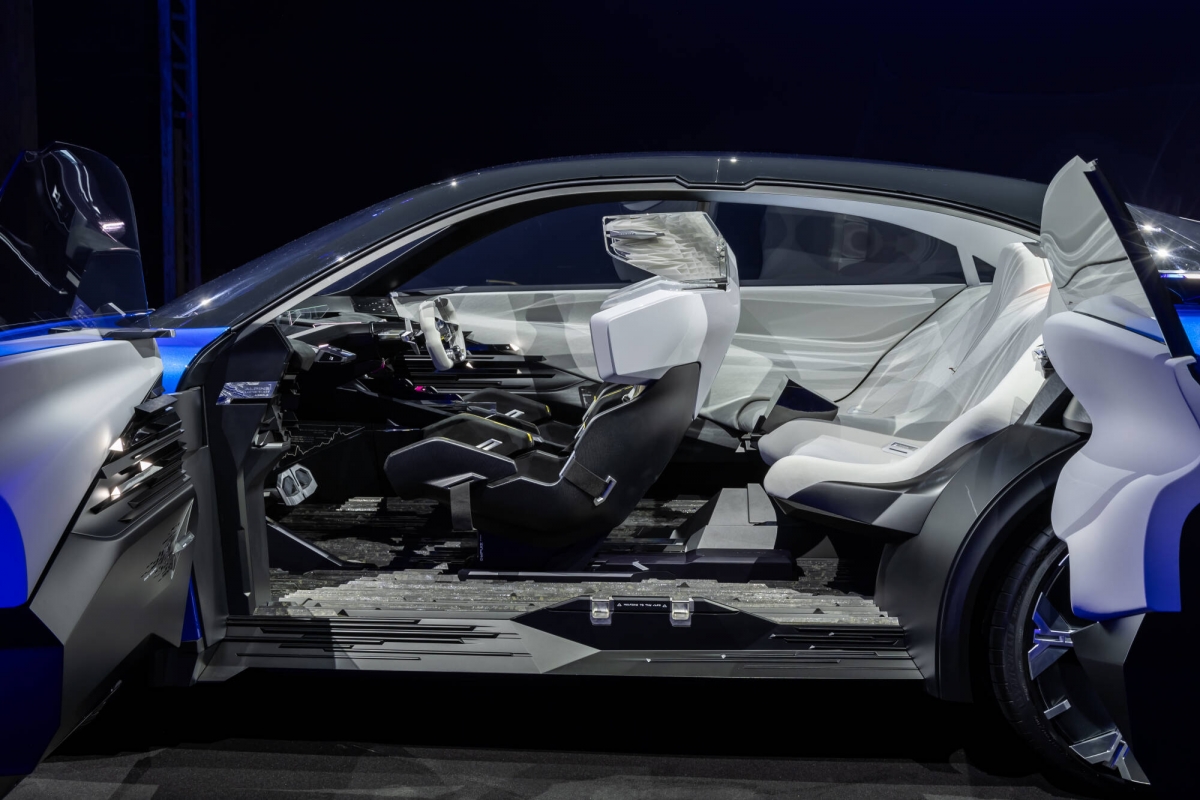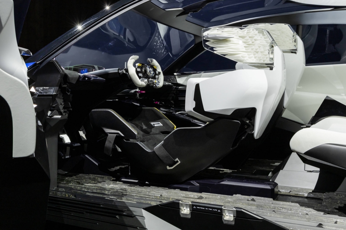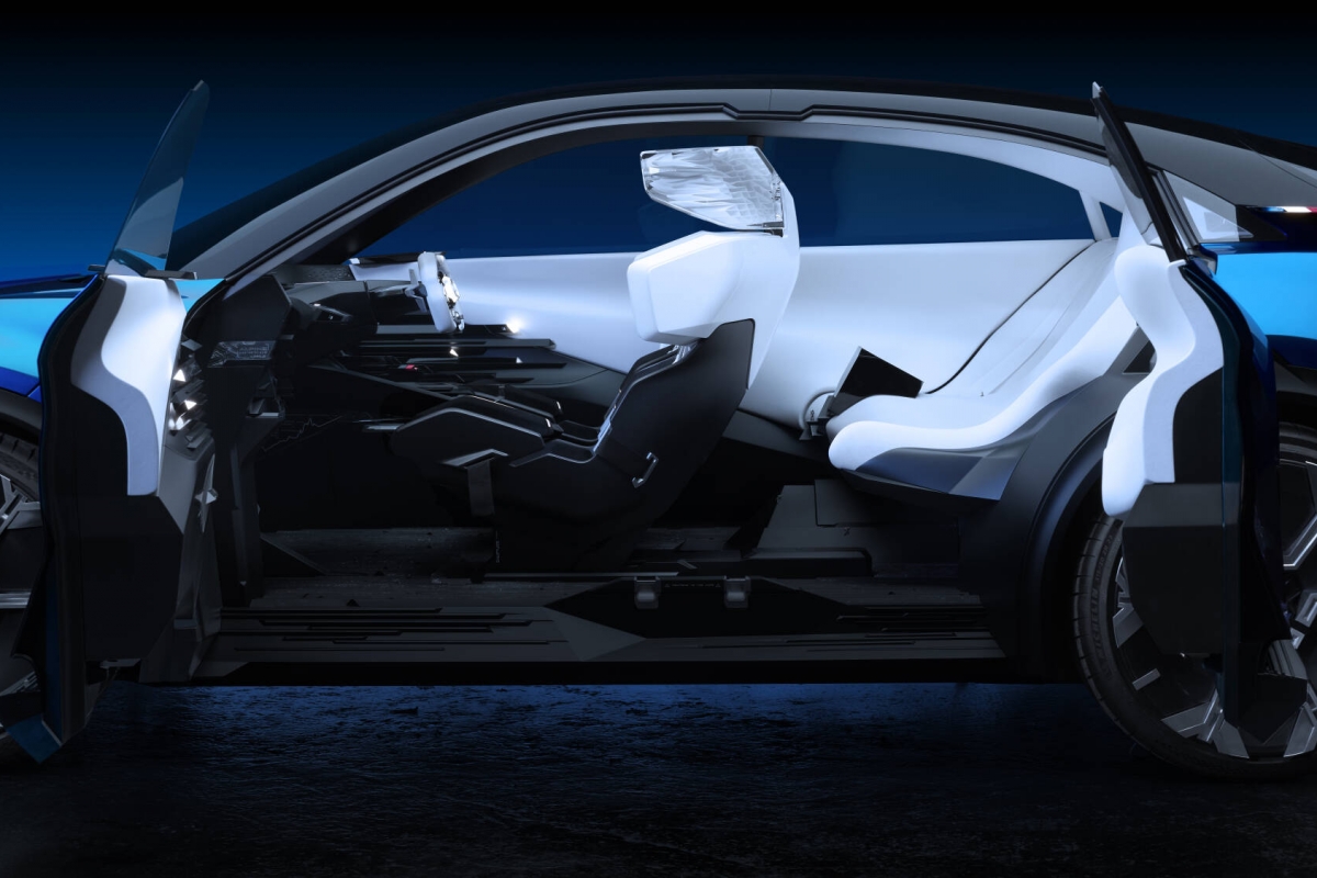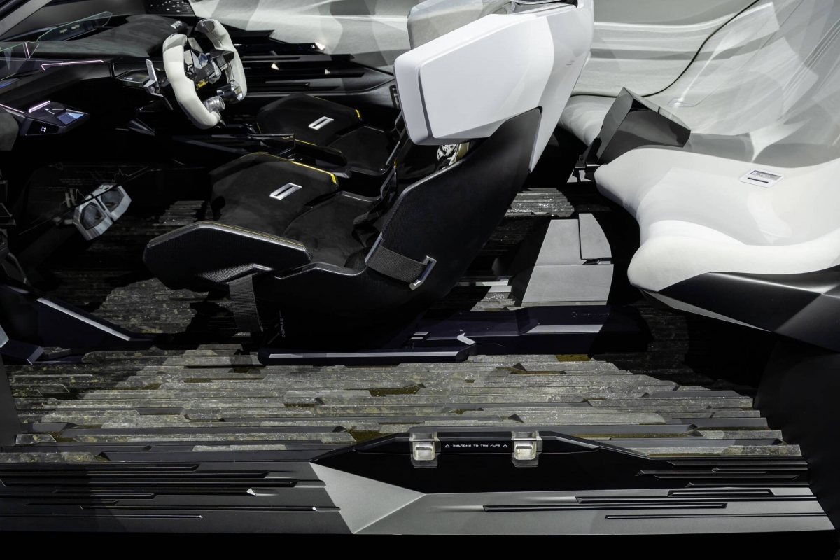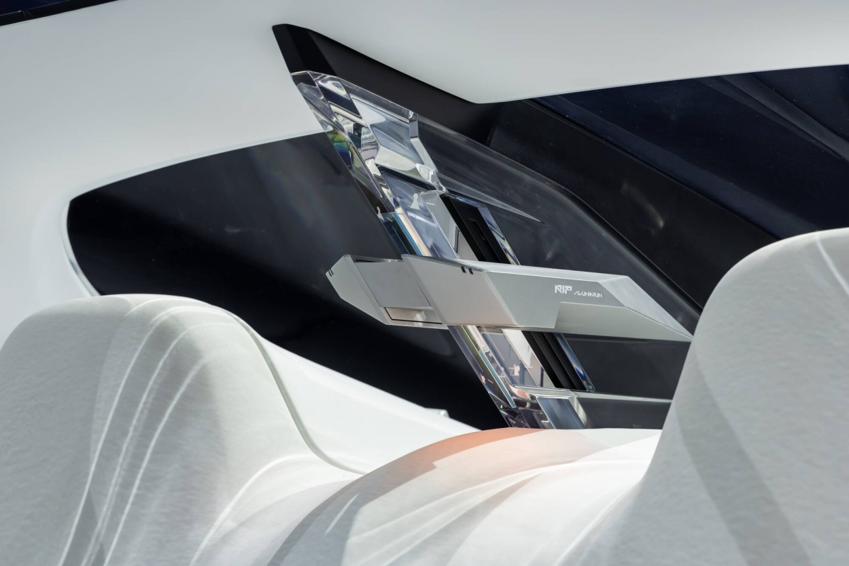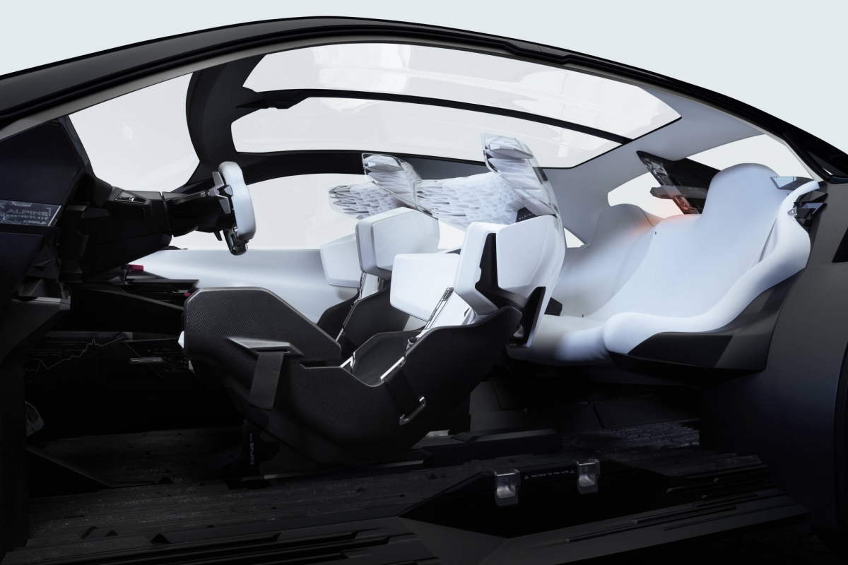 Abrindo as portas laterais, em posição diametralmente oposta e sem pilar central, o interior monocromático divide-se entre a parte negra que representa o mineral afiado que contrasta com a brancura da neve e as transparências do gelo. É como se o carro estivesse assente numa base vulcânica, uma espécie de prolongamento do aspeto dinâmico do exterior, onde assentam depois os Alpes gelados, de uma suavidade extrema, que representam os bancos.