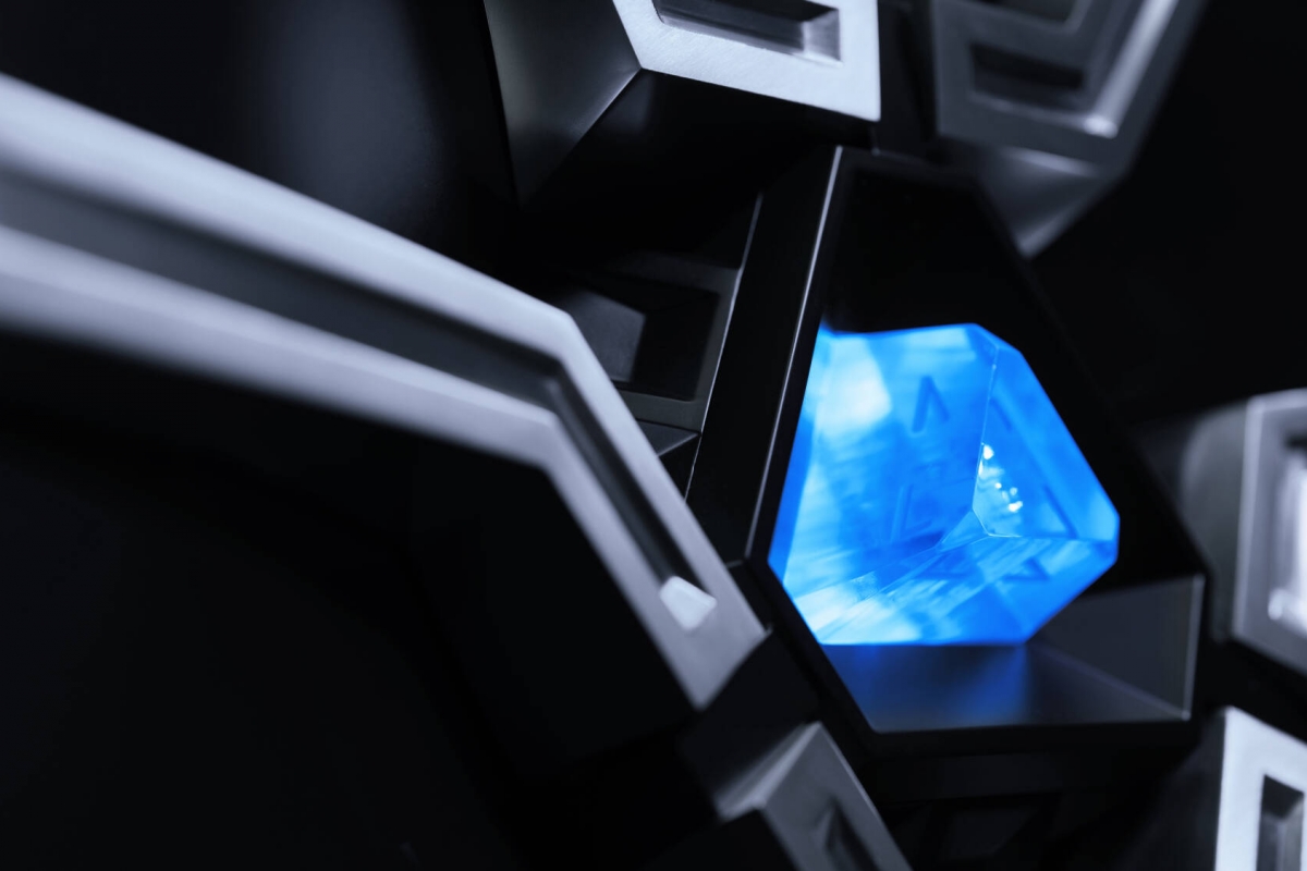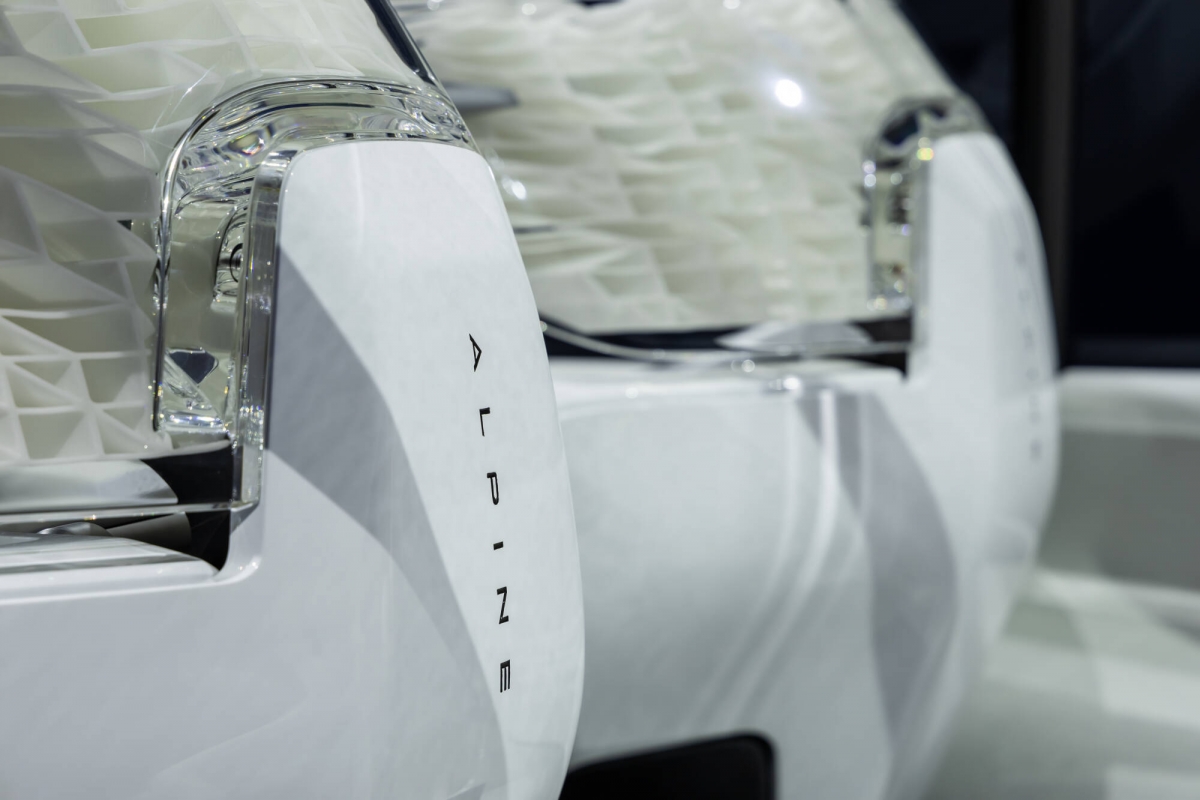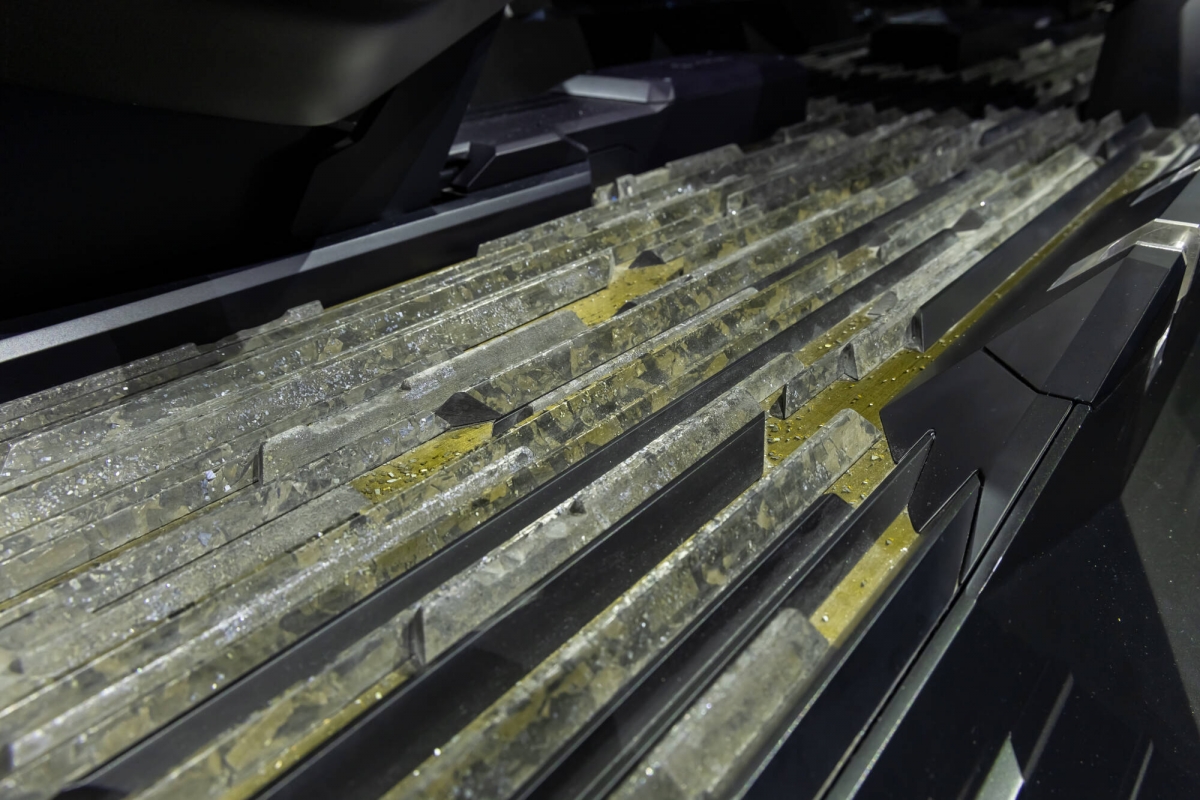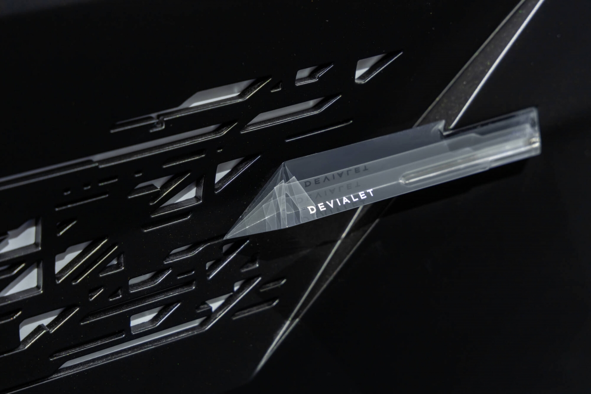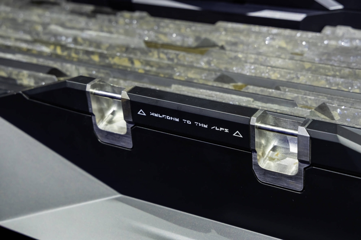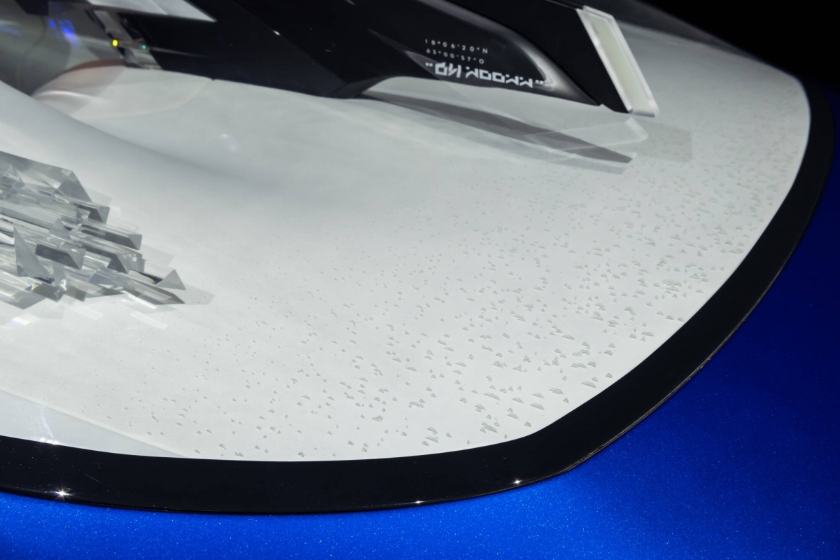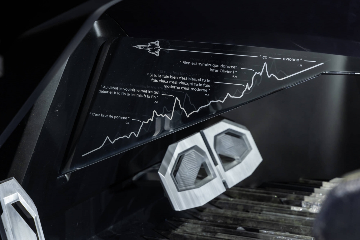 Abrindo as portas laterais, em posição diametralmente oposta e sem pilar central, o interior monocromático divide-se entre a parte negra que representa o mineral afiado que contrasta com a brancura da neve e as transparências do gelo. É como se o carro estivesse assente numa base vulcânica, uma espécie de prolongamento do aspeto dinâmico do exterior, onde assentam depois os Alpes gelados, de uma suavidade extrema, que representam os bancos.