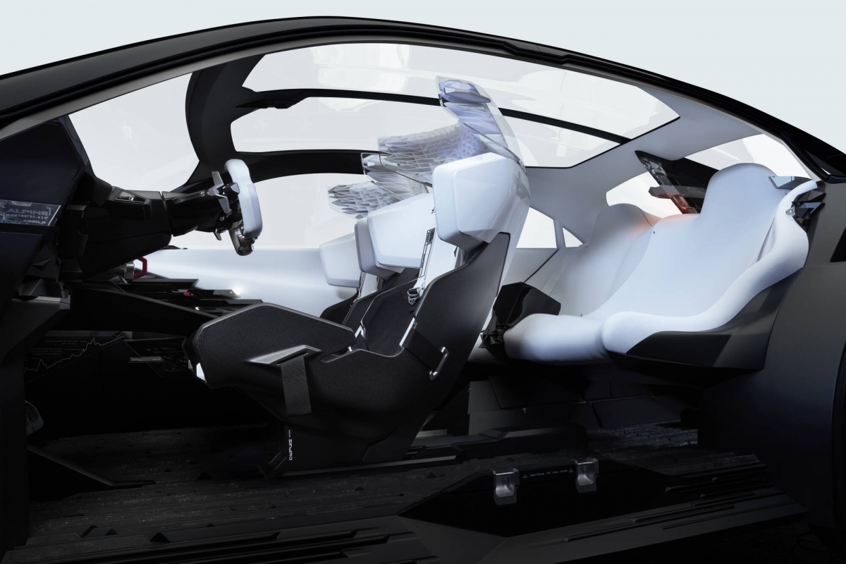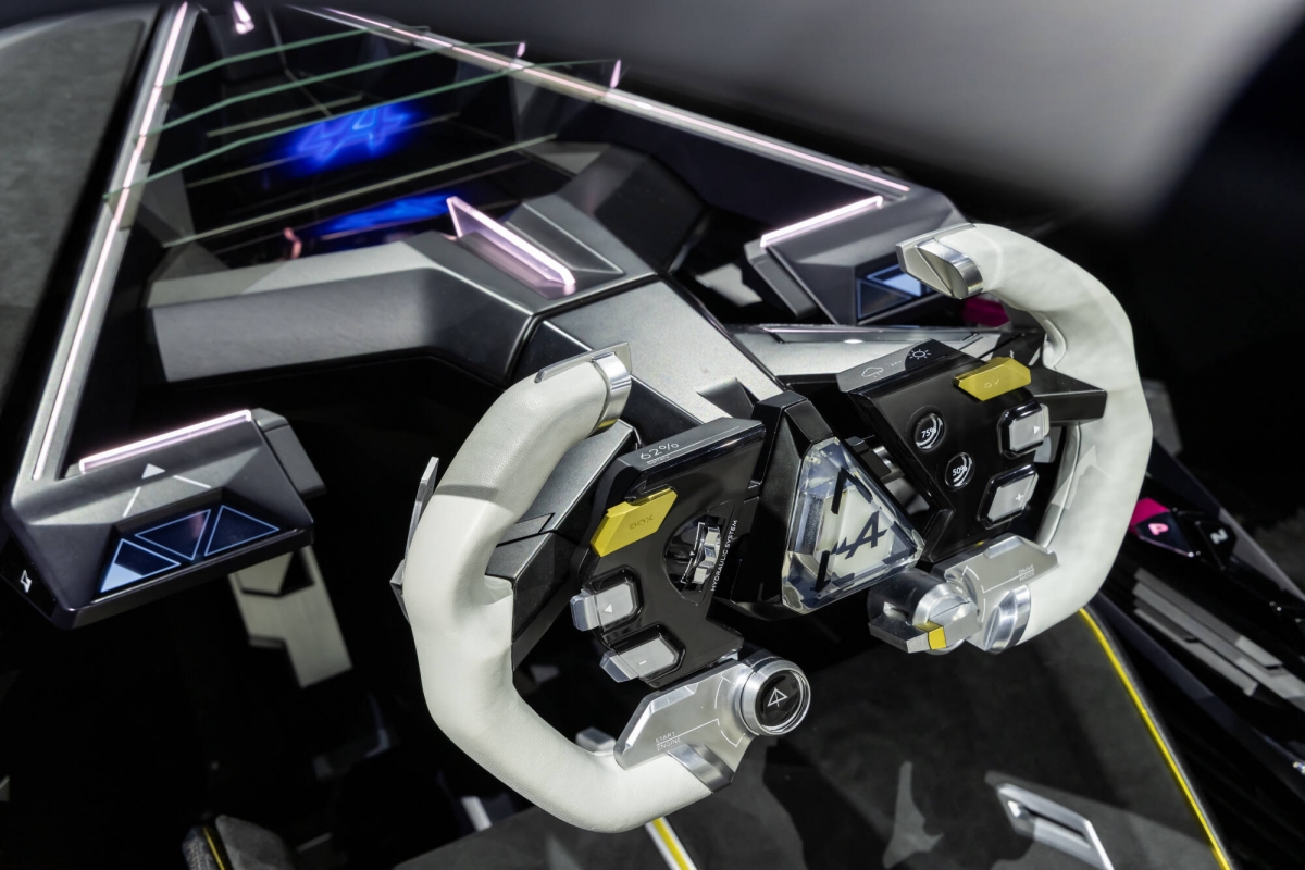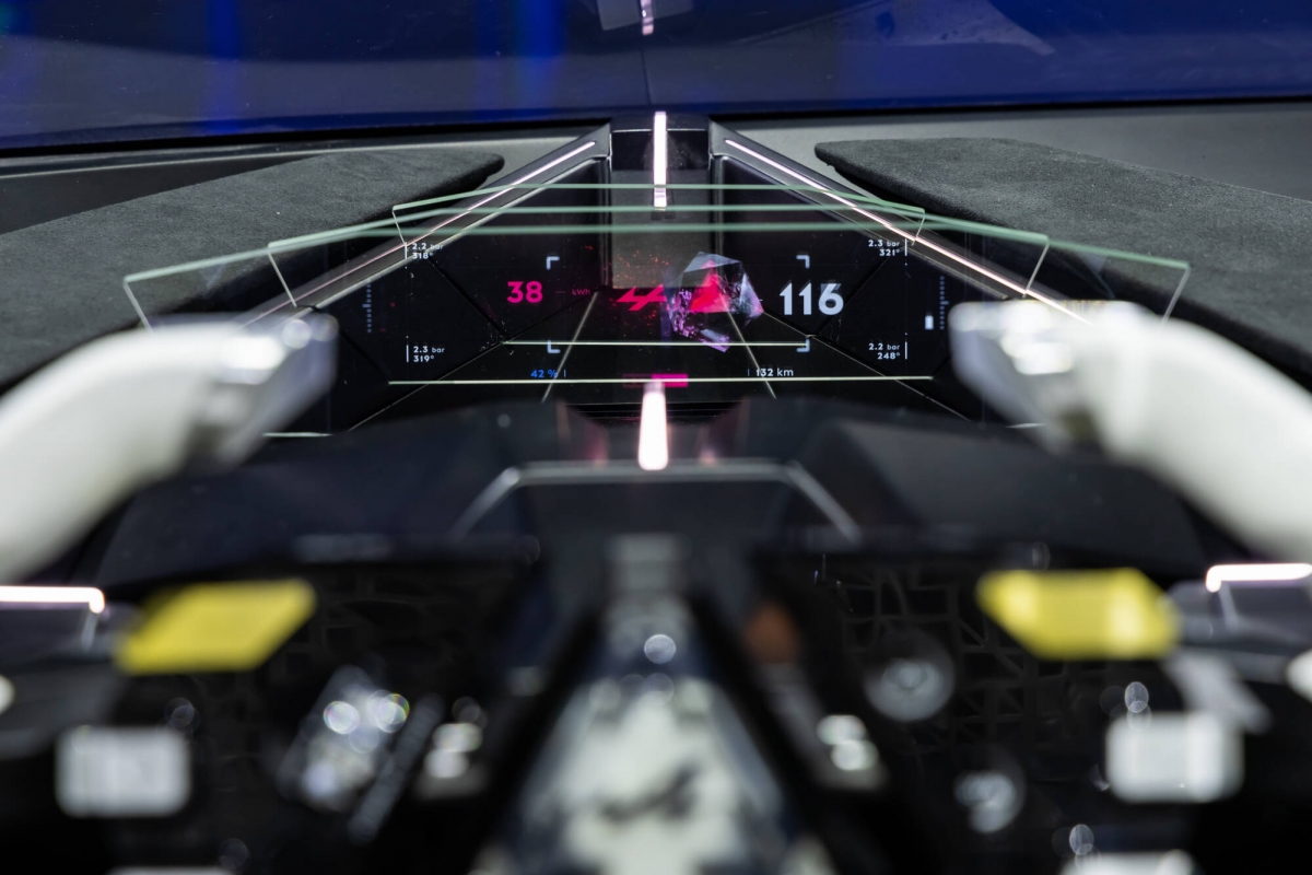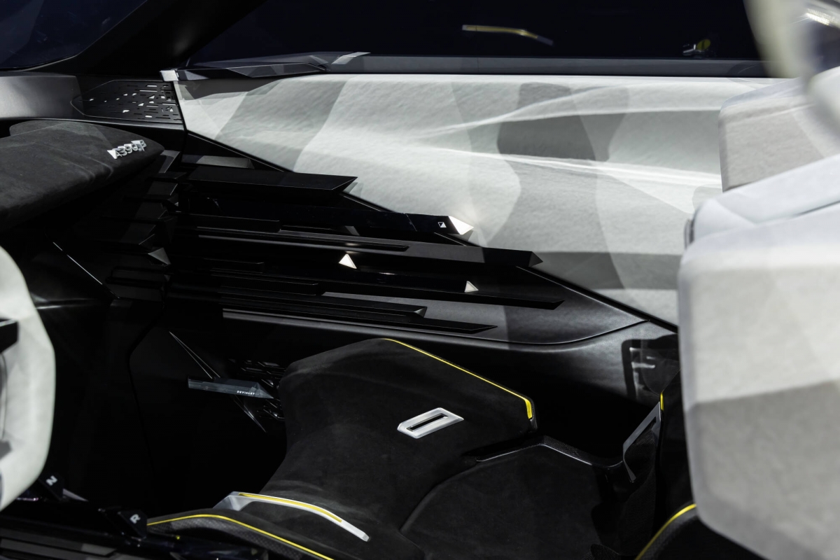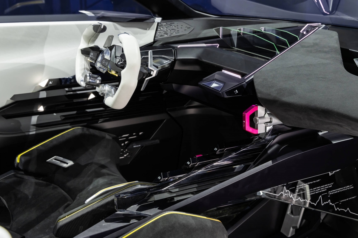 A dupla posição de condução, estilo cockpit, e o volante, também inspirado na Fórmula 1, são centrais no interior. Quando se clica no botão F1, salta da posição lifestyle para a de corridas, os pedais levantam e o banco do condutor rebaixa e torna-se mais envolvente, e o volante adquire o formato de um autentico Fórmula 1. O painel de instrumentos disposto triangularmente ajusta a informação ao grau de importância, da frente para trás.