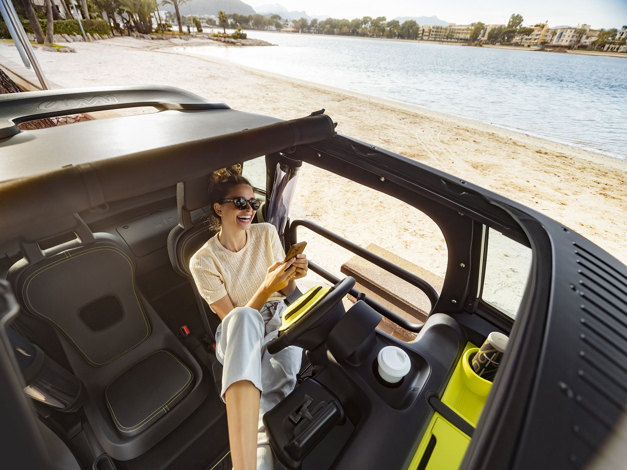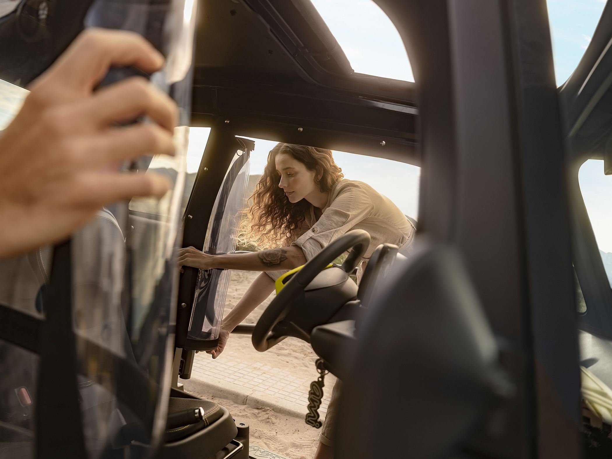 Estará equipada com vários acessórios adicionais exclusivos, como as coberturas transparentes no lugar das portas, para proteger os seus ocupantes dos elementos, e uma bolsa amovível com fecho de correr colocada no centro do volante para guardar pequenos objetos.