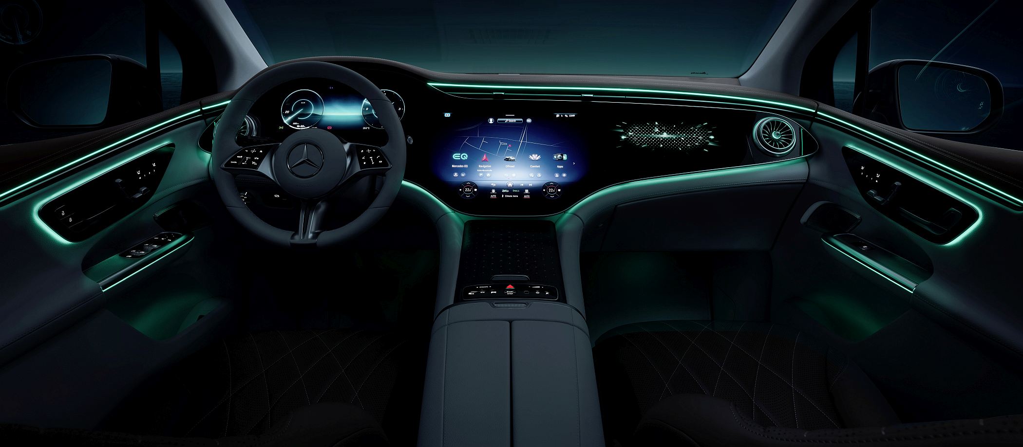A bordo, o EQE SUV destaca-se pela utilização de materiais nobres como pele e madeira em combinação, mas também com a utilização de materiais sustentáveis em consonância com a lógica de sustentabilidade. A iluminação ambiente personalizável continua a ser um elemento distintivo deste modelo da marca alemã, a par da tecnologia representada pelo conceito MBUX com painel de instrumentos de 12.3” e ecrã central tátil de 12.8″ com sistema de navegação inteligente elétrica, ou seja, identifica postos de carregamento disponíveis durante uma viagem.