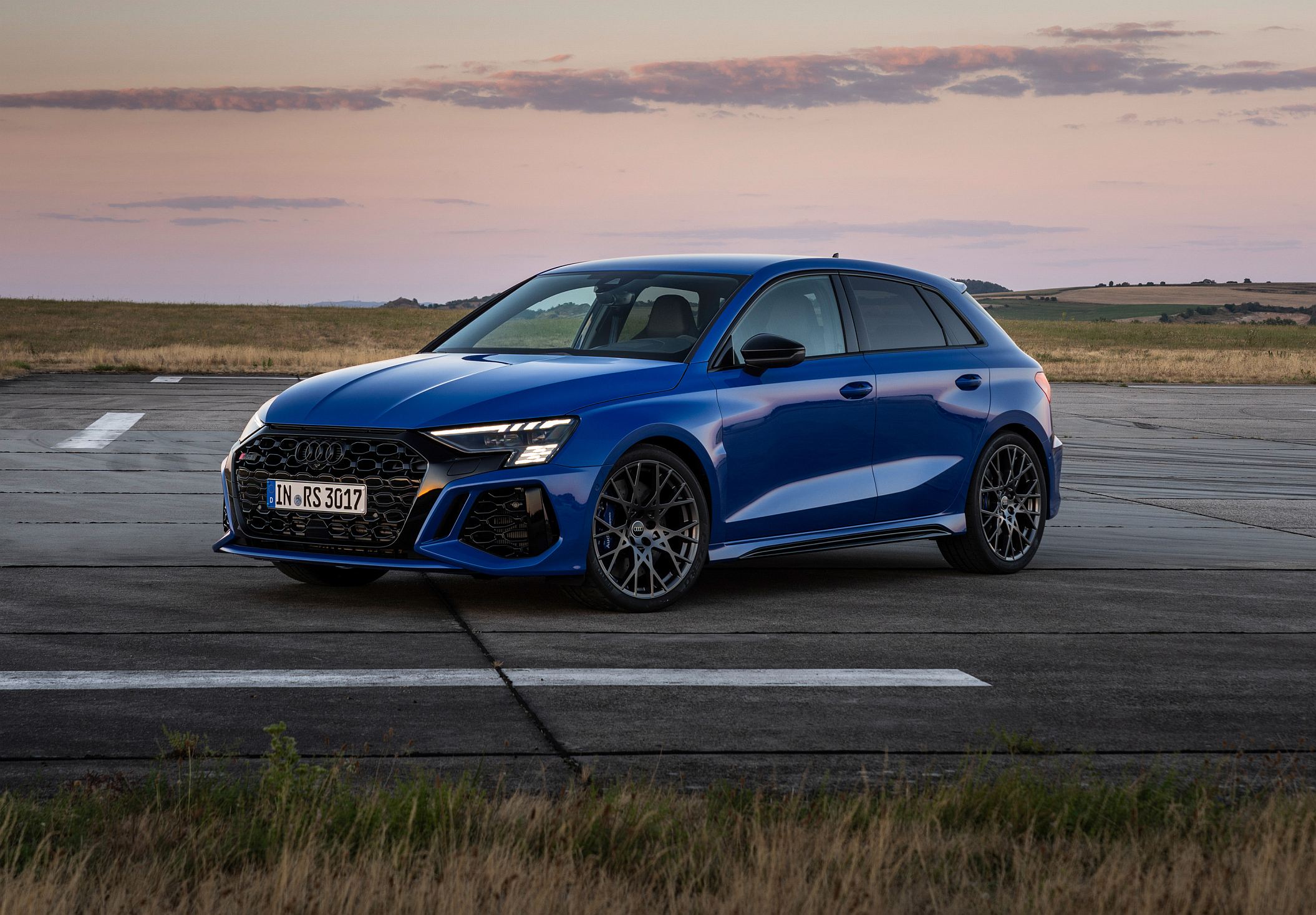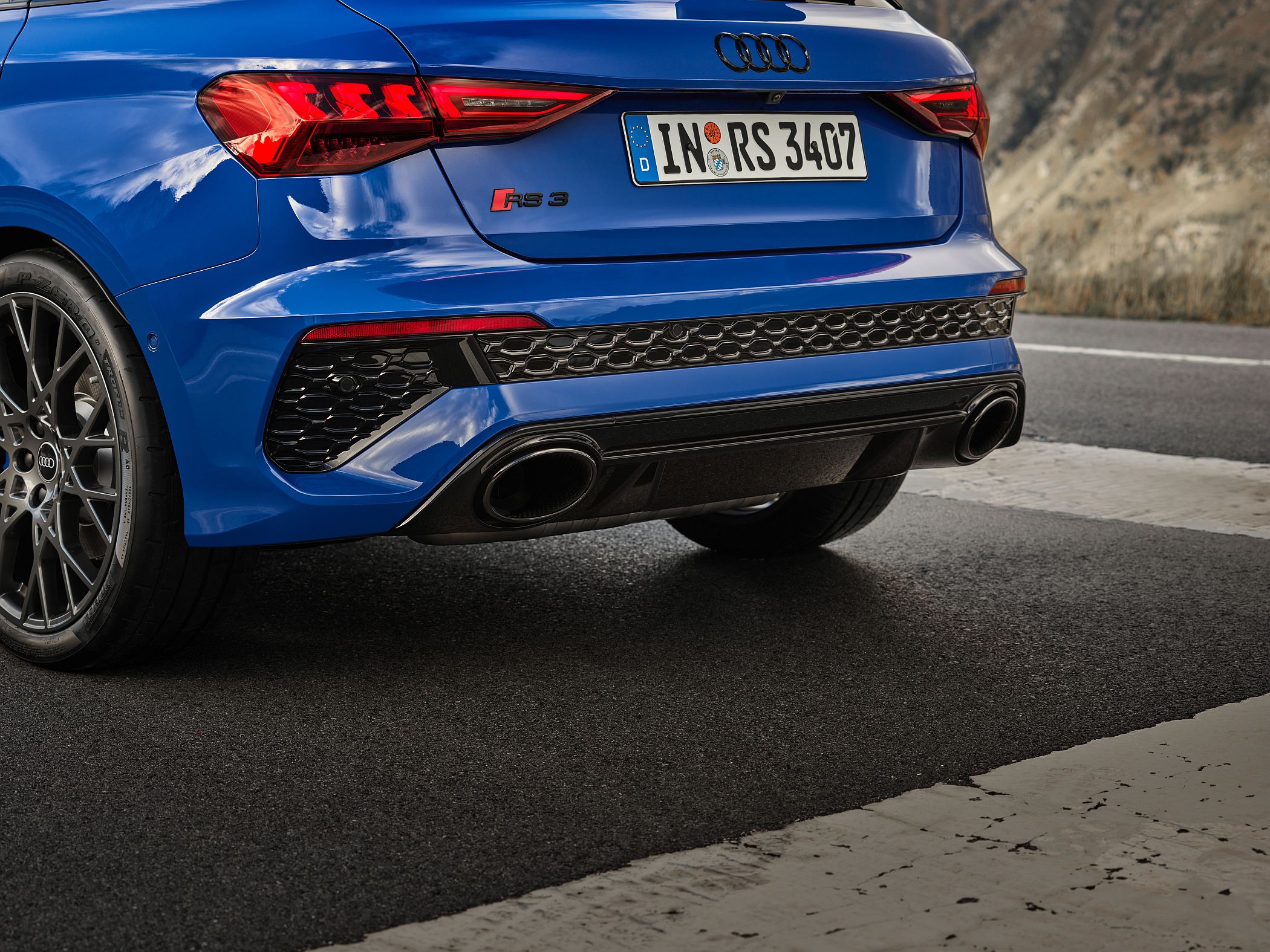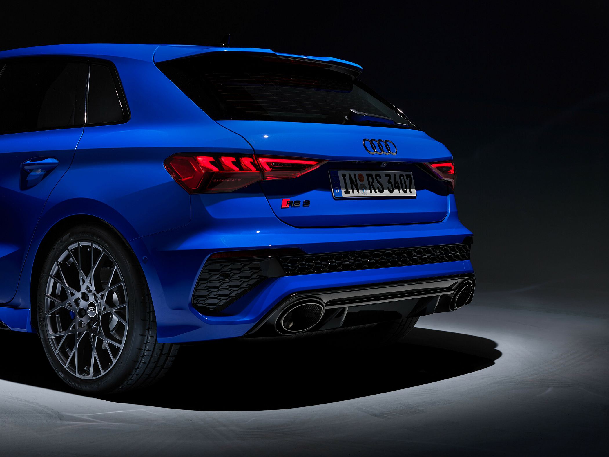 Quando o RS 3 Performance Edition é aberto, as luzes de circulação diurnas, de 15 segmentos LED, apresentam um padrão de bandeira de xadrez no lado esquerdo e ‘3-0-0’ no lado do condutor, fazendo alusão ao número de unidades produzidas e à velocidade máxima. Ao fechar o carro, em vez do valor numérico é apresentado o nome ‘R-S-3’.