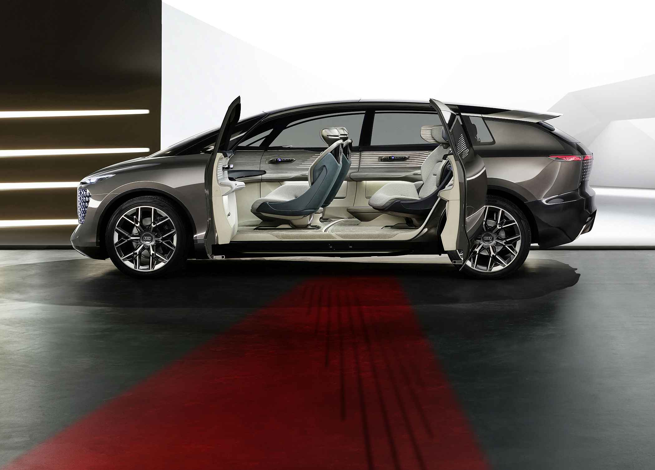 O desenho deste modelo foi pensado para oferecer a emotividade da Audi, embora com os condimentos necessários para uma nova interpretação moderna, como por exemplo as portas laterais traseiras de abertura ‘suicida’, criando assim um espaço amplo para acesso ao interior sem pilar B, não faltando bancos com rotação para acolher os passageiros e iluminação a vermelho no chão, como se fosse uma carpete vermelha, para enaltecer o acesso ao habitáculo.