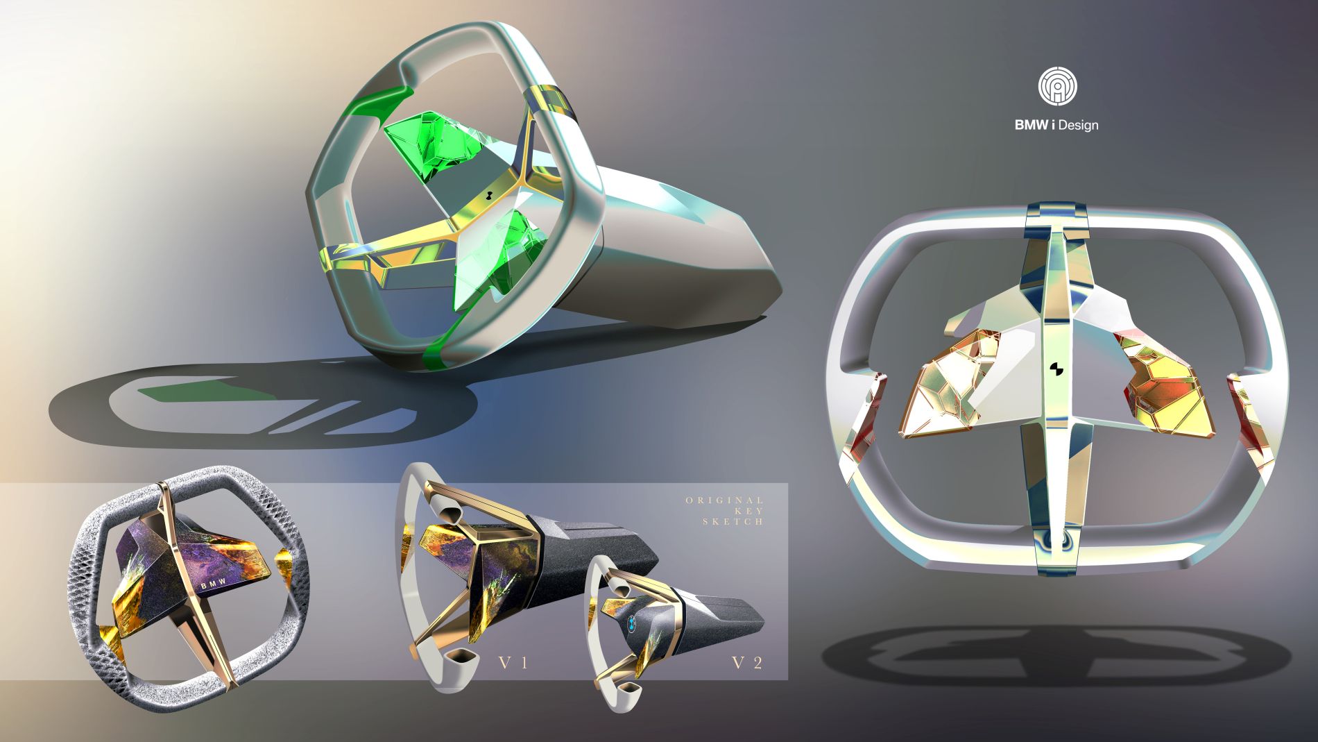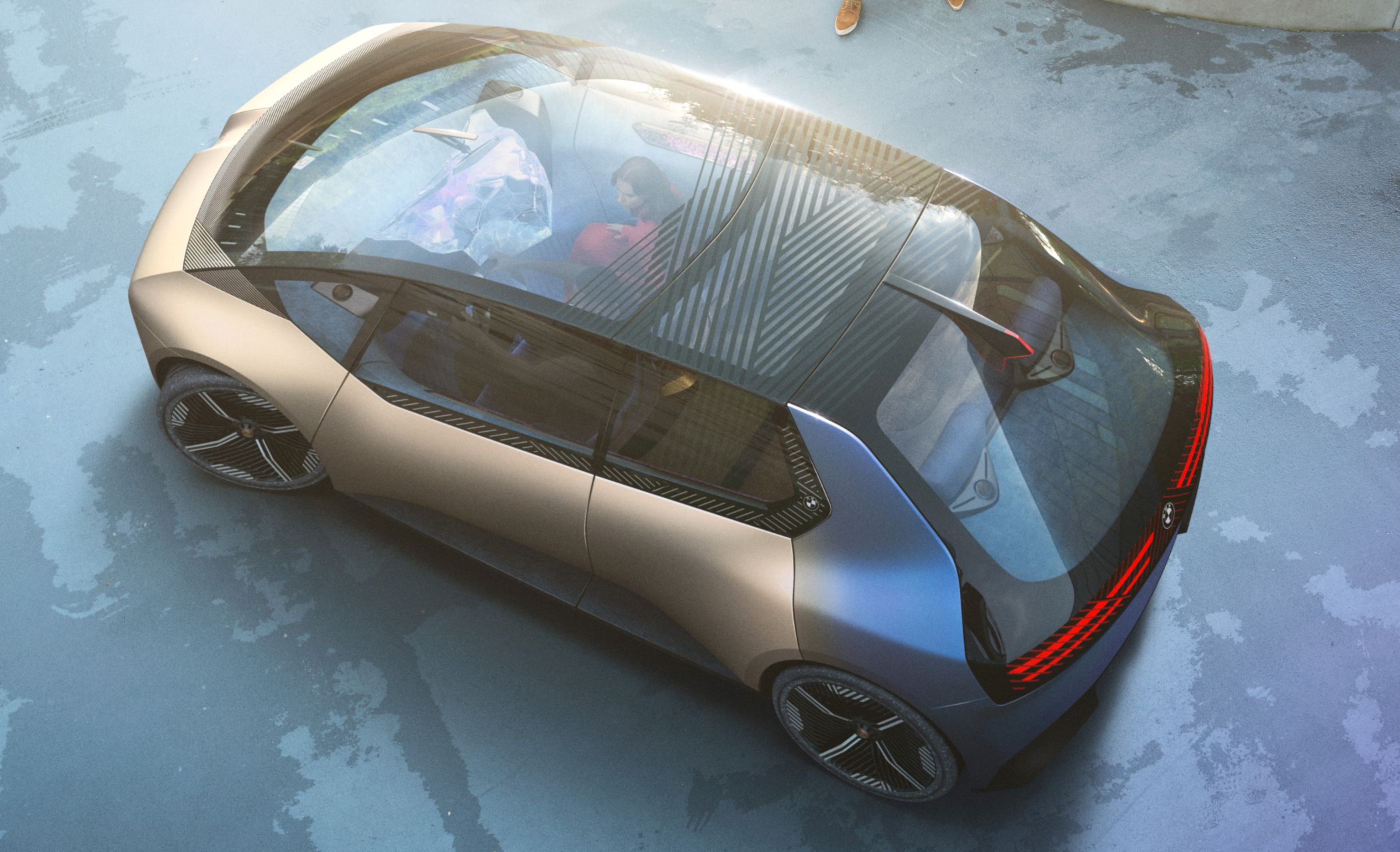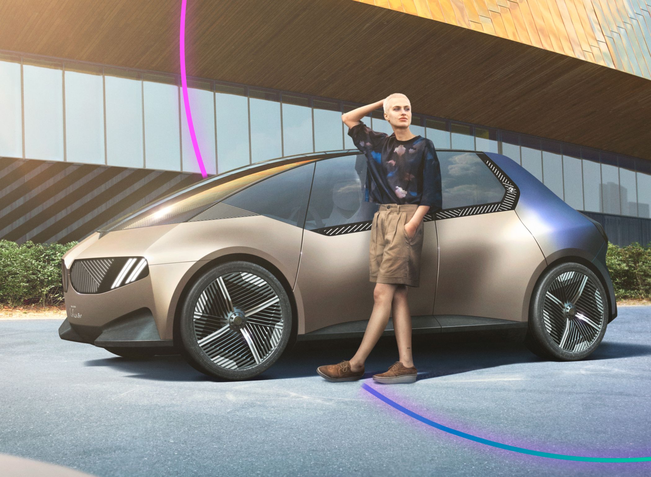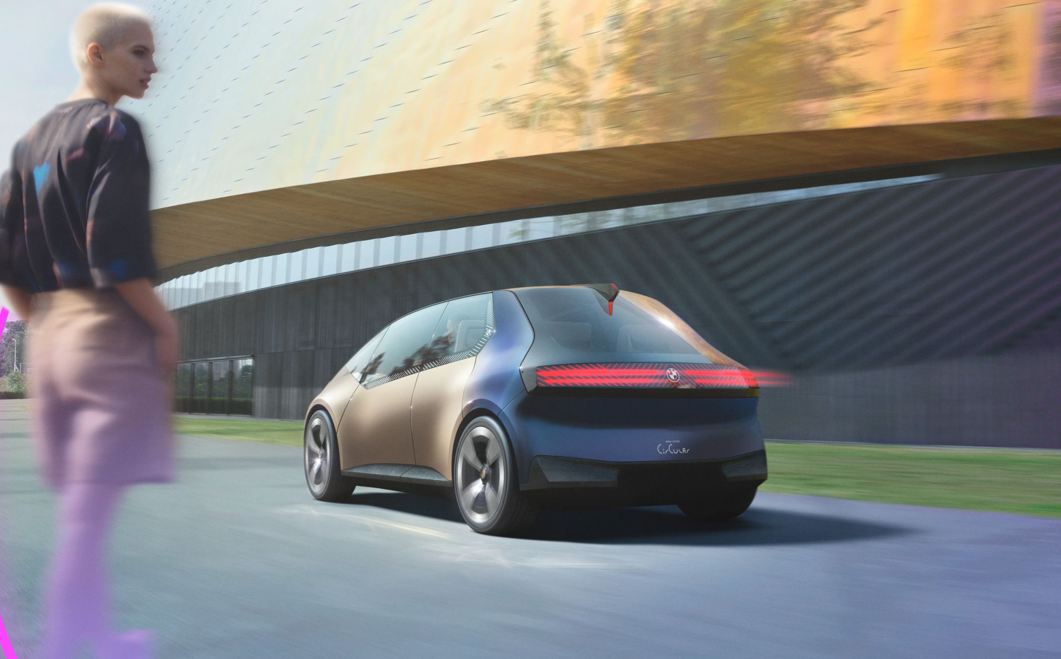 O exterior também evita a pintura, pelo que a carroçaria, principalmente feita de alumínio secundário, tem um acabamento levemente dourado, numa tonalidade denominada ‘Anodized Mystic Bronze’, que contrasta com a secção traseira azulada (‘Temper Blue Steel’) cuja tonalidade foi obtida a partir de aço com tratamento de calor. Com este refinamento de materiais, a BMW procura demonstrar como é possível criar outras tonalidades sem recorrer a pinturas.