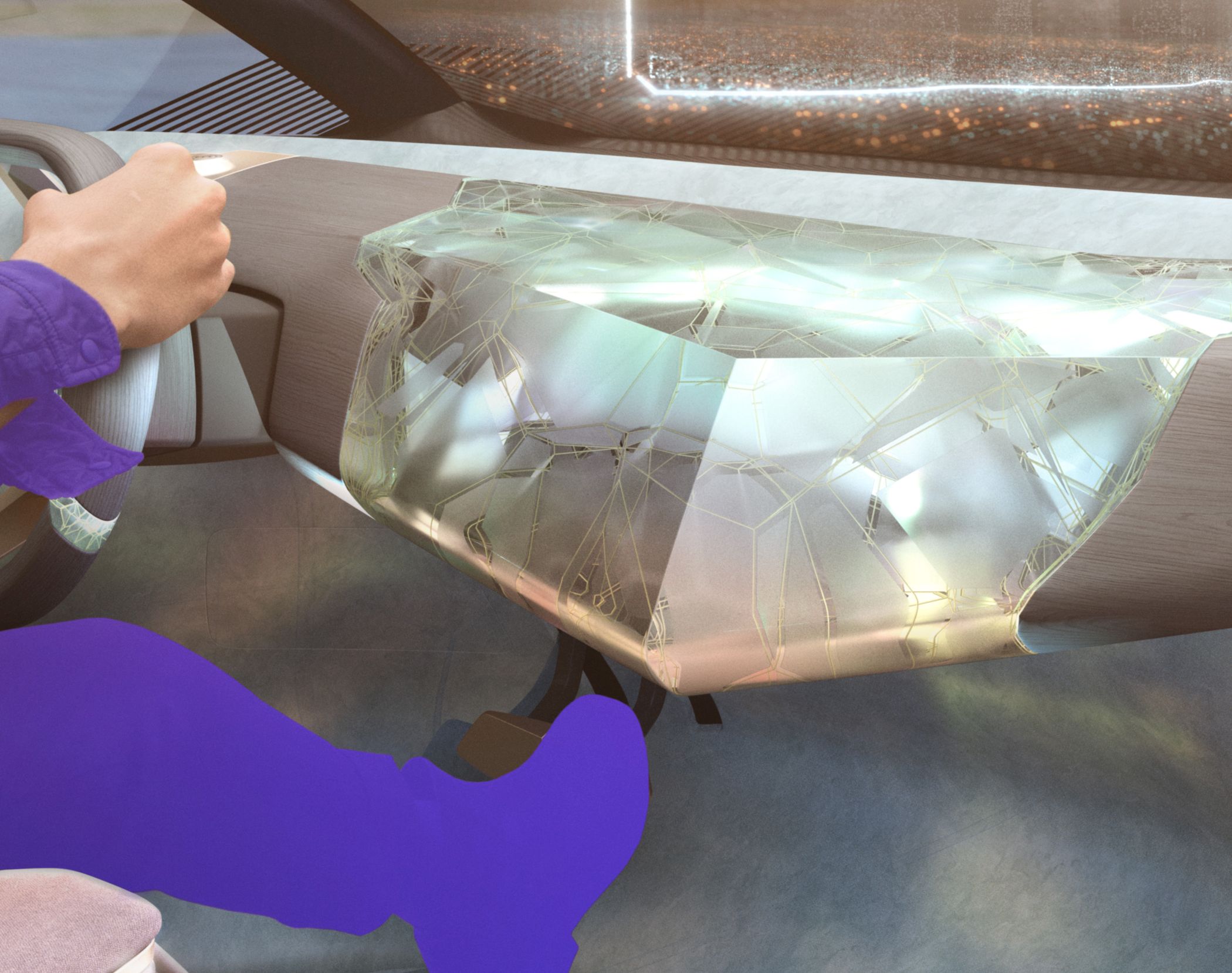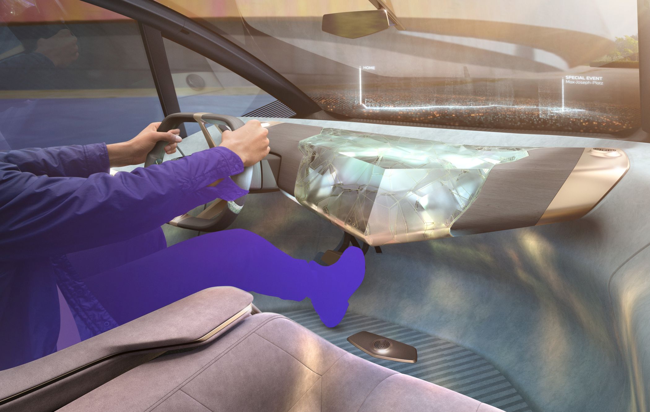 No interior, a forma angular do tablier é bastante peculiar, com formato em ‘V’ e efeitos luminosos para mostrar o estado de funcionamento do automóvel, dispensando centros de informações convencionais, como ecrãs ou instrumentação. Porém, em funcionamento, o condutor terá acesso a um sistema head-up display que projeta as informações mais relevantes no para-brisas em toda a sua largura. É aqui que aparecem também os ecrãs das funções de infoentretenimento para condutor e passageiros.