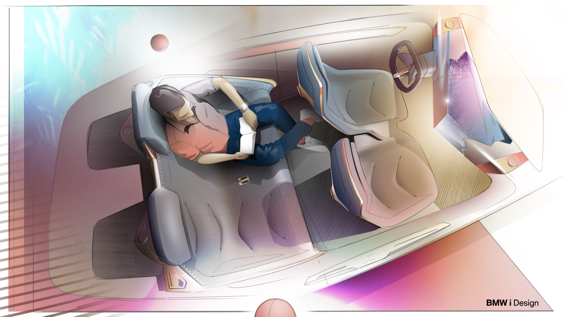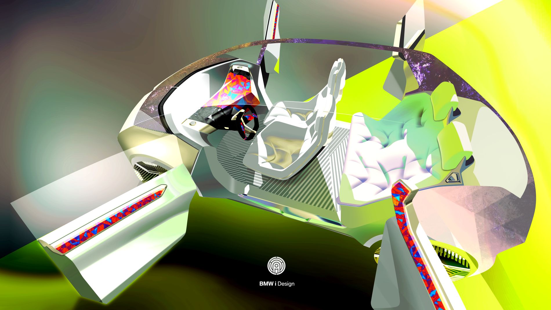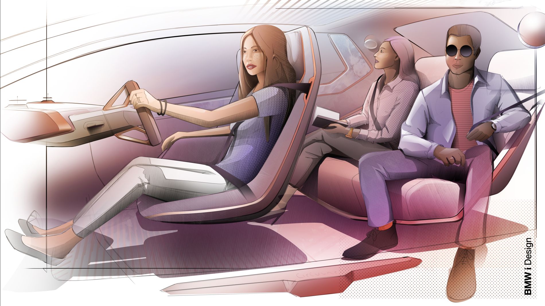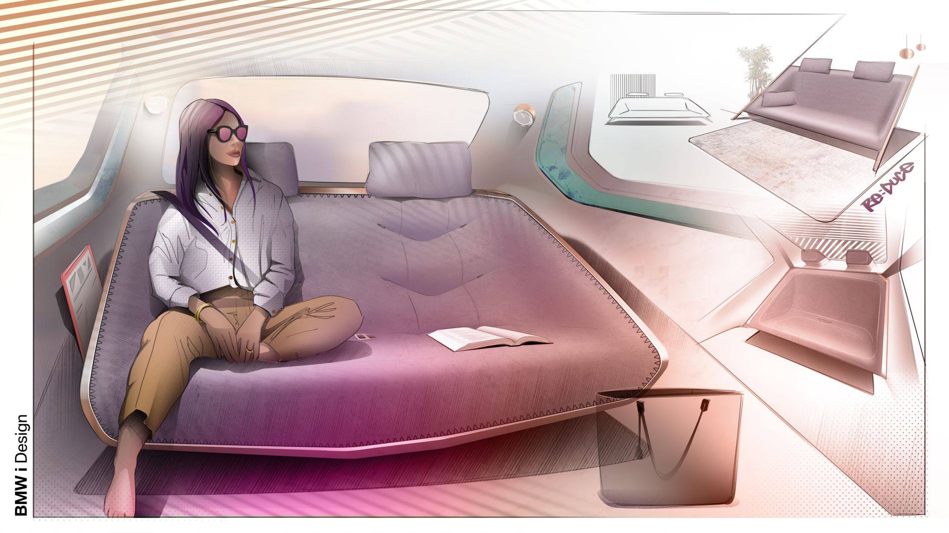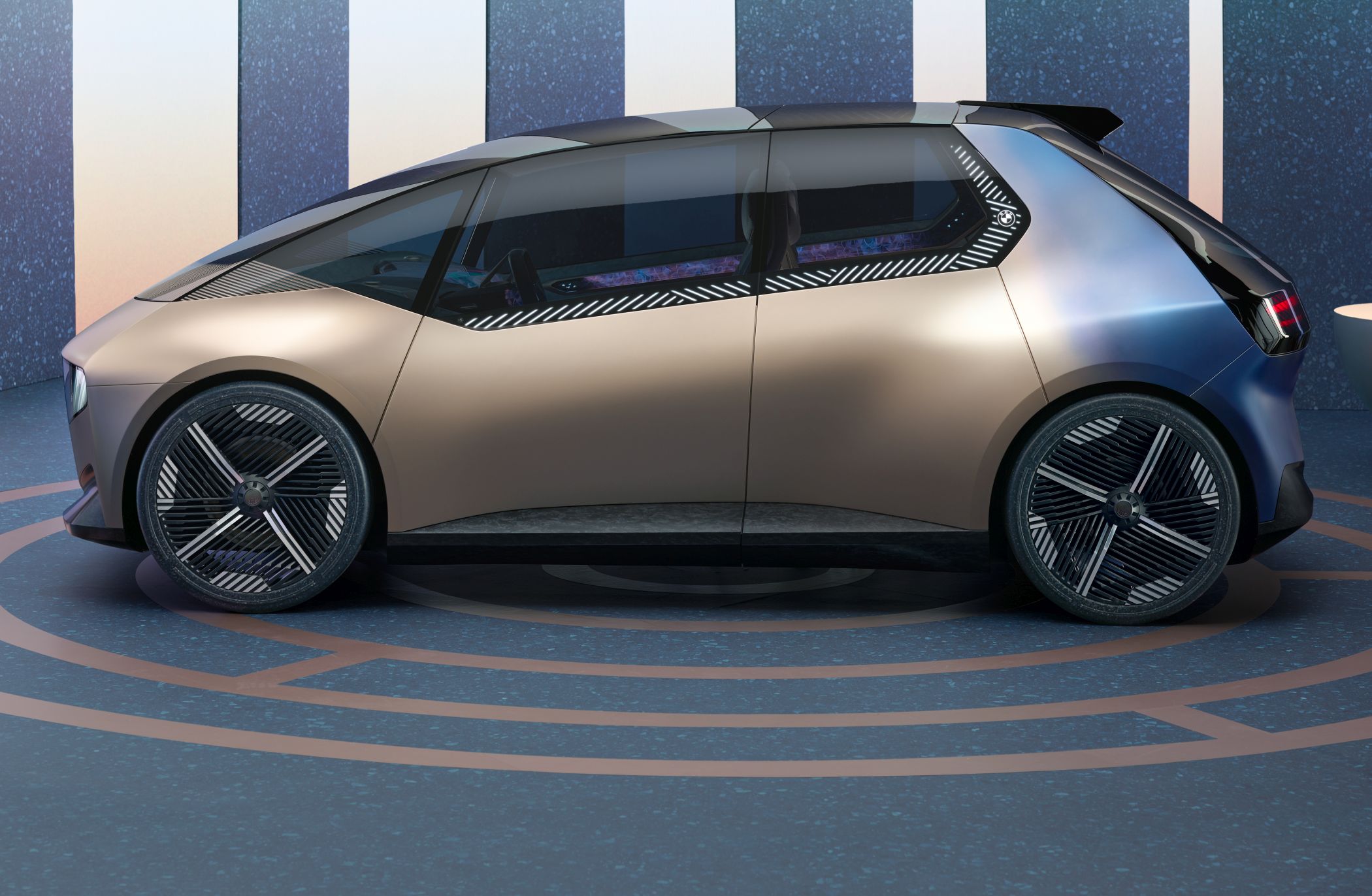 De perfil, as superfícies da carroçaria são bastante limpas, mostrando igualmente simplicidade mas longe do que se vê nos automóveis da BMW nos dias de hoje, enquanto a superfície vidrada permite um interior mais luminoso e de sensação ‘aberta’. Em vez de um elemento cromado em torno dos vidros, utiliza uma faixa digital que funciona não apenas como detalhe estético, mas também como centro funcional, uma vez que existe ali um ecrã e superfície de controlo: pode servir para mostrar o estado do veículo e guiar o passageiro para a porta à medida que se aproximam do automóvel. Quando o interruptor da porta é tocado, as portas abrem em sentidos opostos, permitido entrada e saída desafogada.
