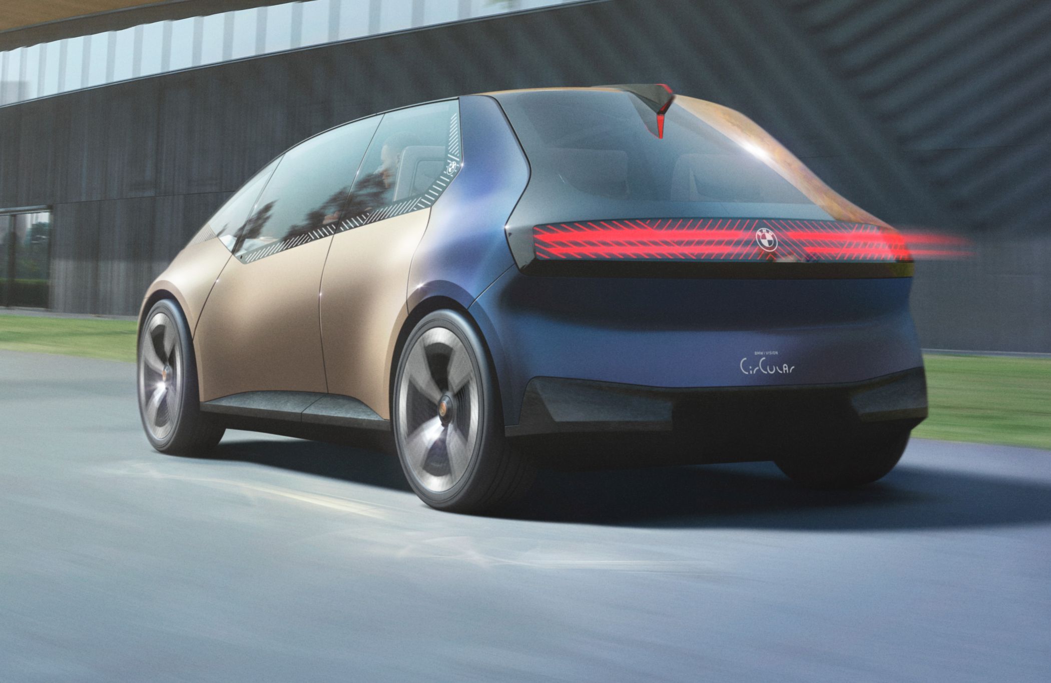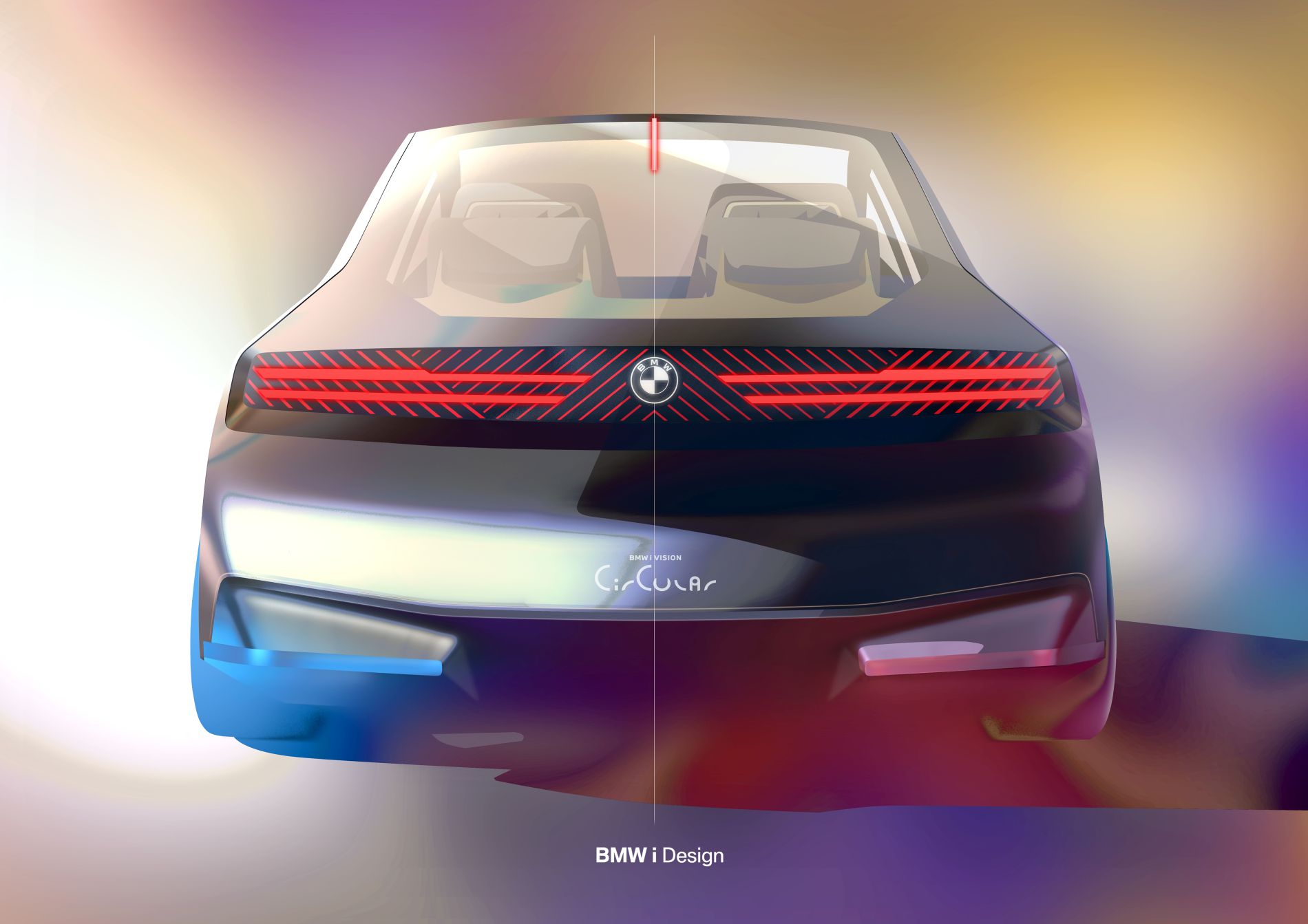 A traseira replica, de certa forma, a abordagem da dianteira, com as funcionalidades luminosas integradas de forma disfarçada no grande componente preto em vidro. Quando o veículo está desligado, apenas o logótipo bidimensional da BMW é visível na superfície preta. Ao ligar o i Vision Circular, essa mesma superfície ganha ‘vida’ com elementos funcionais e uma linha gráfica, como na frente.