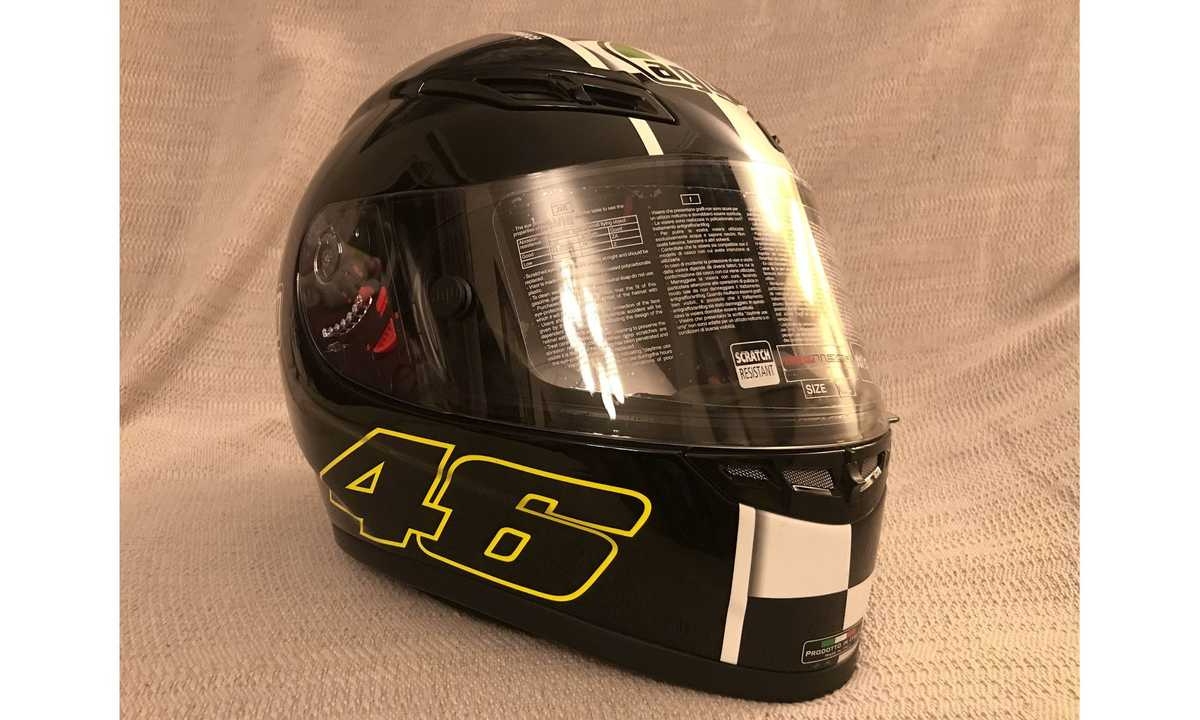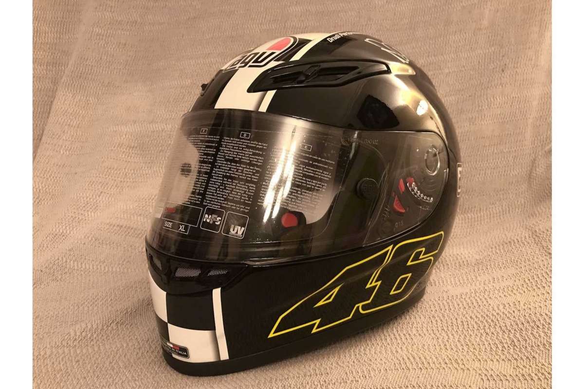 Trata-se de um exemplar do modelo AGV GP-Tech de edição limitada, comemorativa do oitavo título mundial de Rossi no MotoGP, que está a leilão na plataforma online da Iconic Motorbikes Auctions.