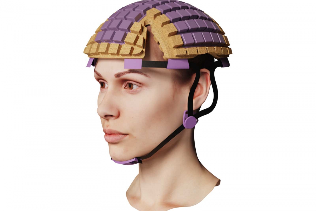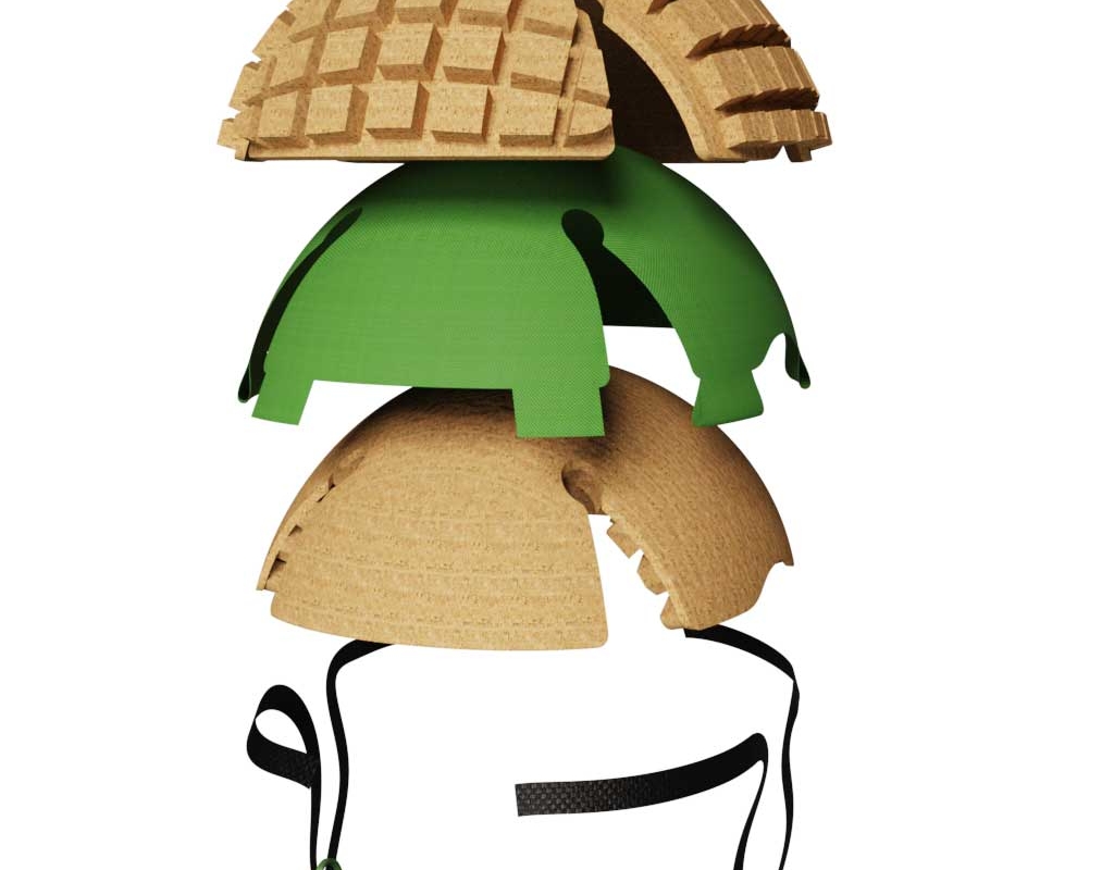 O capacete dobrável com um forro de cortiça aglomerada tem um revestimento de poliuretano termoplástico (TPU) e as cavidades contêm fluído espessante de cisalhamento (STF), materiais que proporcionam uma proteção robusta contra impactos, mantendo a flexibilidade. Quando aberto completamente, fica com uma dimensão semelhante a um computador portátil de 15’’.