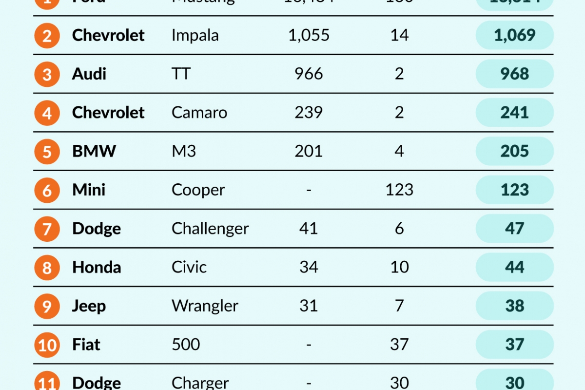 Os resultados surpreendem (ou talvez não…) e colocam o Ford Mustang no primeiríssimo lugar da tabela. No ‘top10’ há modelos quase para todos os gostos, do potente BMW M3 ao queridinho Fiat 500.