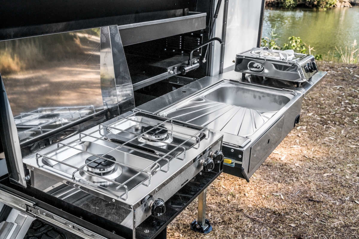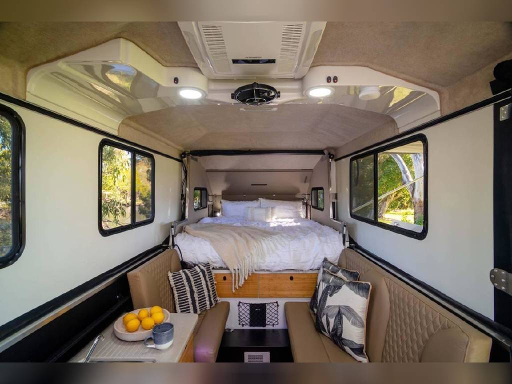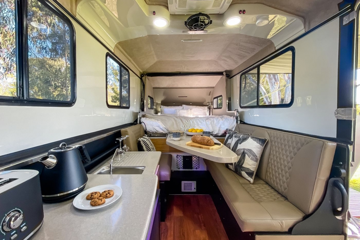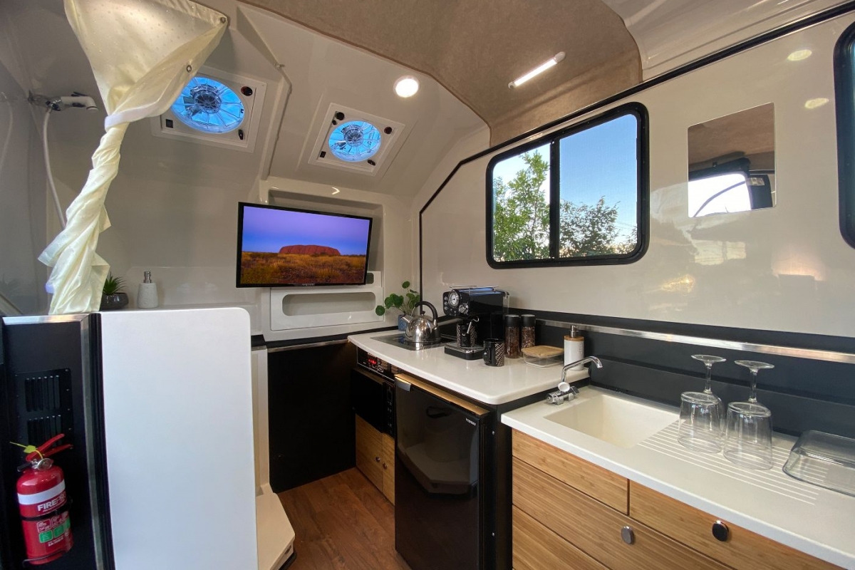 Configurável a gosto, a autocaravana extensível da Kimberly pode incluir casa de banho completa, com duche de água quente, ar condicionado, cozinha com frigorifico, fogão e placa de indução. Para obter um máximo de 600 Ah, dispõe de baterías de lítio integradas, a que se soma 600V provenientes dos painéis solares.